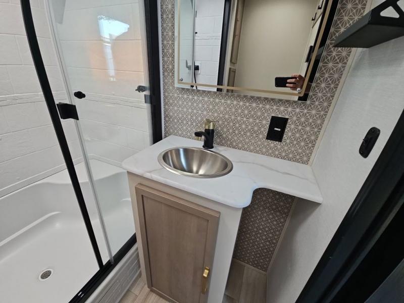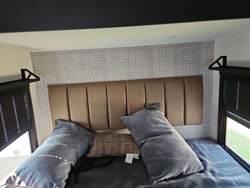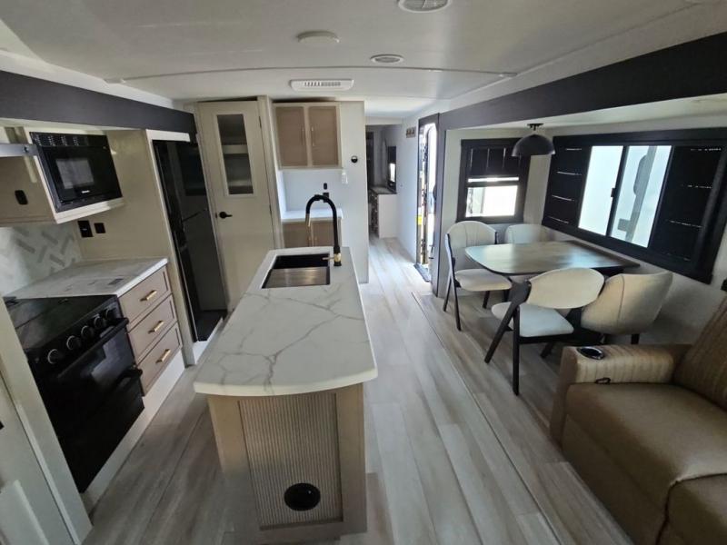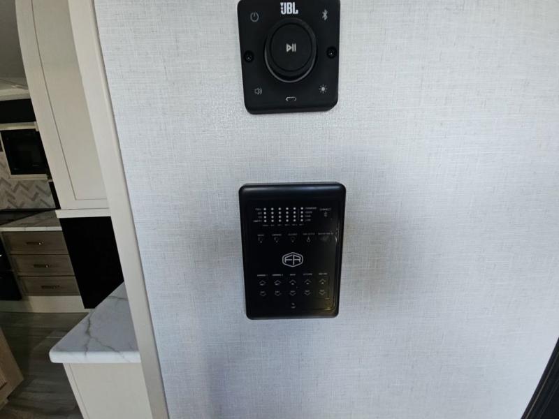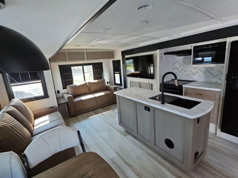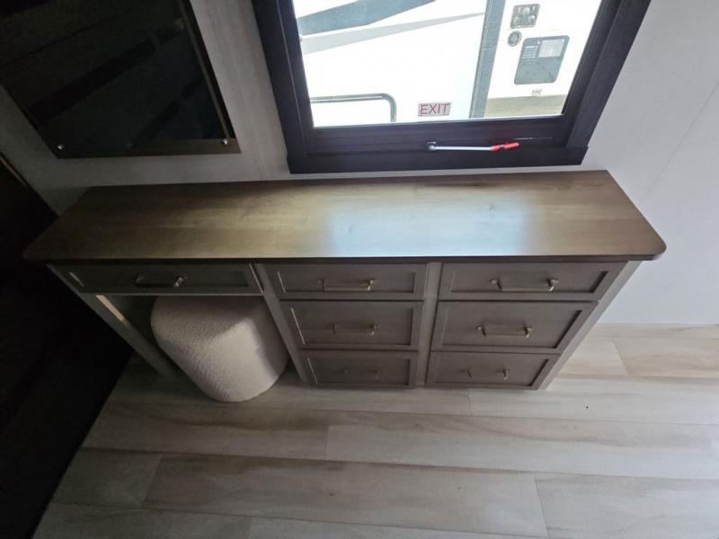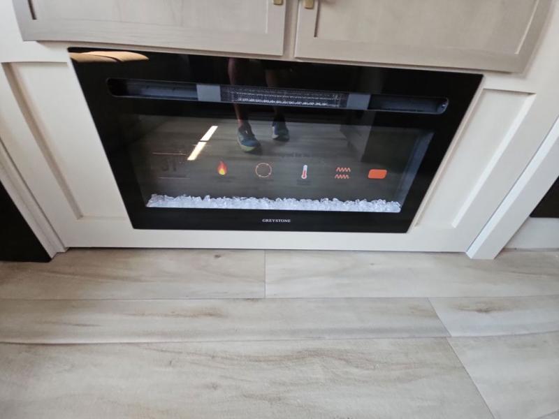 You are going to love the spacious private bedroom with a space-saving door, custom king bed slide, a dresser, and a full-width wardrobe with washer and dryer prep. If you ever decide to get out of bed, you can enjoy a relaxing shower in the residential shower with a skylight and a wide-open kitchen and living area with dual opposing slide outs. The cook will love having a kitchen island, a hutch, a large pantry, plus a 12V refrigerator. There is an entertainment center with a 50" TV and fireplace plus plenty of seating on the furniture. You can dine at the booth dinette or choose to add the free-standing dinette option if you prefer having your own seat. And don't forget about the natural lighting and views you will receive from the panoramic windows.