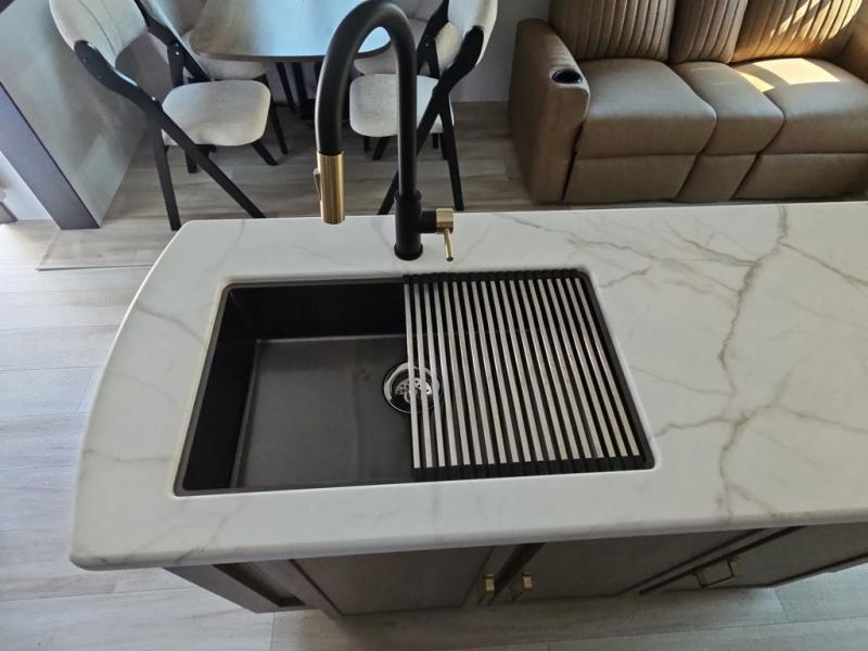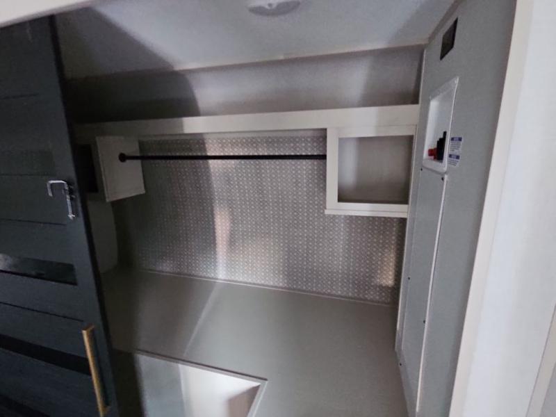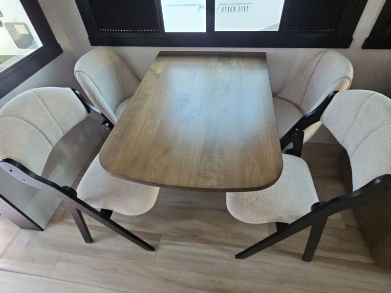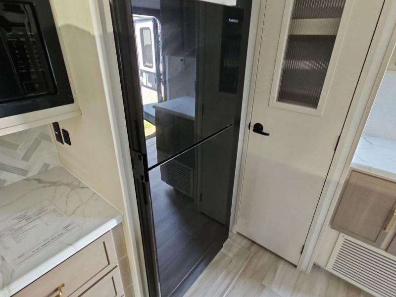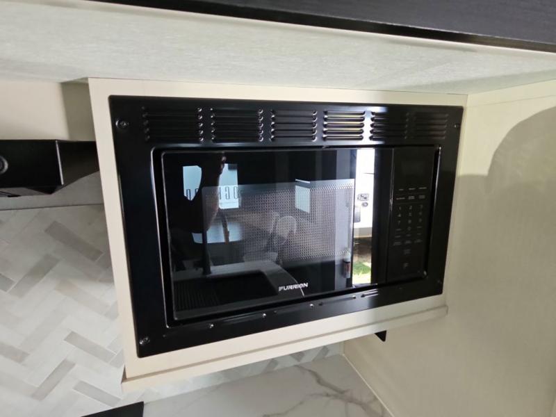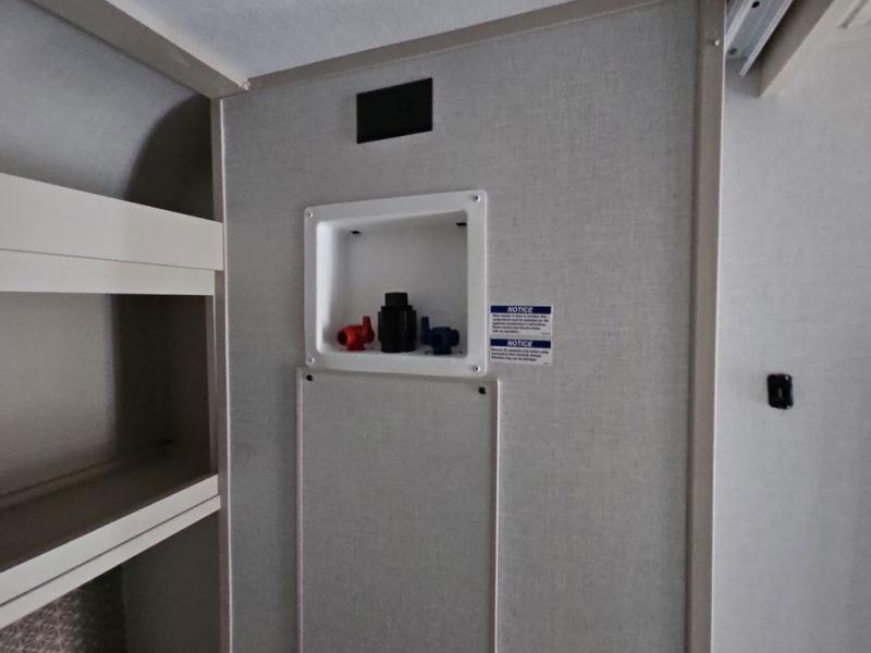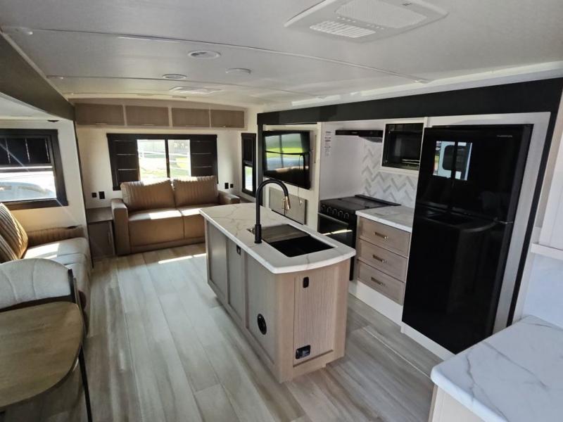 You are going to love the spacious private bedroom with a space-saving door, custom king bed slide, a dresser, and a full-width wardrobe with washer and dryer prep. If you ever decide to get out of bed, you can enjoy a relaxing shower in the residential shower with a skylight and a wide-open kitchen and living area with dual opposing slide outs. The cook will love having a kitchen island, a hutch, a large pantry, plus a 12V refrigerator. There is an entertainment center with a 50" TV and fireplace plus plenty of seating on the furniture. You can dine at the booth dinette or choose to add the free-standing dinette option if you prefer having your own seat. And don't forget about the natural lighting and views you will receive from the panoramic windows.