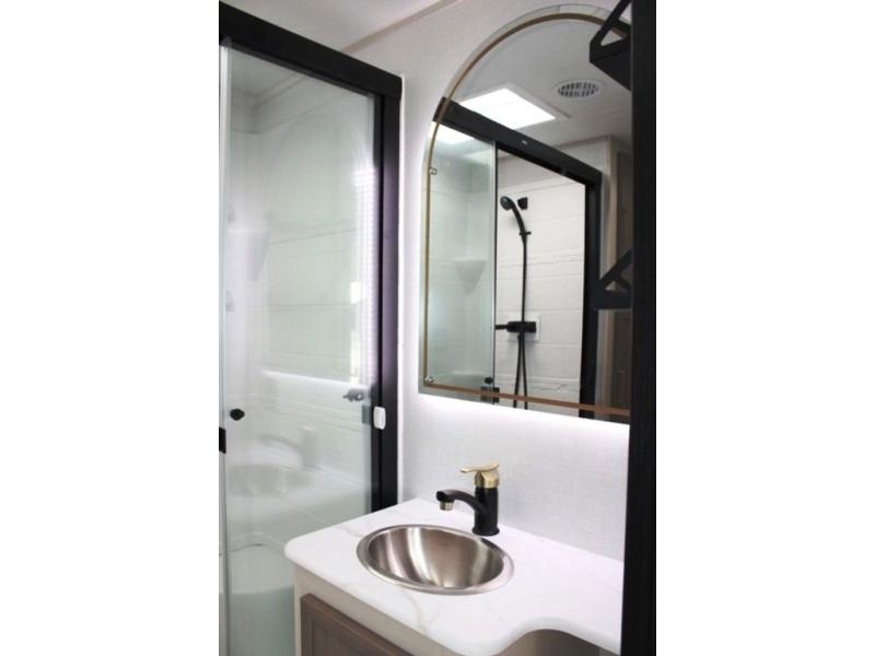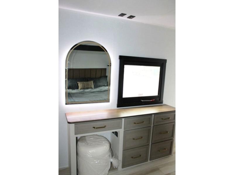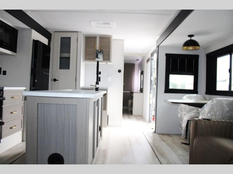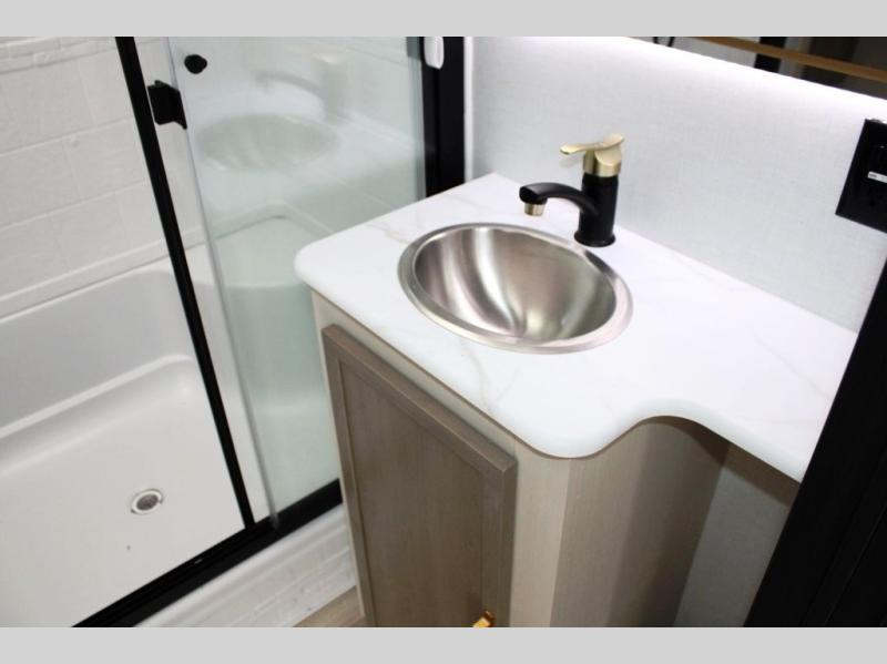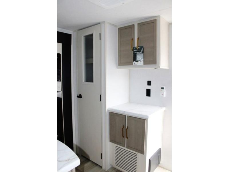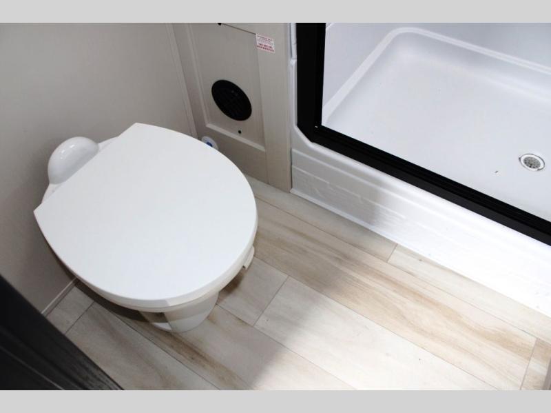 With any Wildwood Heritage Glen travel trailer by Forest River, the quality construction, attention to detail and design along with a bright and welcoming interior allows you to relax in comfort. Each model includes a WeatherShield one piece fiberglass roof, nitrogen-filled radial tires, and an enclosed underbelly with 12V tank heaters on all holding tanks for added protection. You will appreciate the on-demand tankless water heater, along with power stabilizer and tongue jacks, and an extra-large pass-thru storage with slam latch baggage doors. Head inside to enjoy matte gold hardware, wood door casings in place of plastic door casings, and an ultimate interior lighting upgrade with 4k puck/strip lights and a stylish LED back-lit bath mirror!