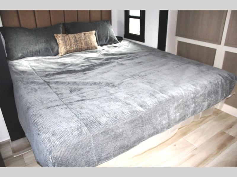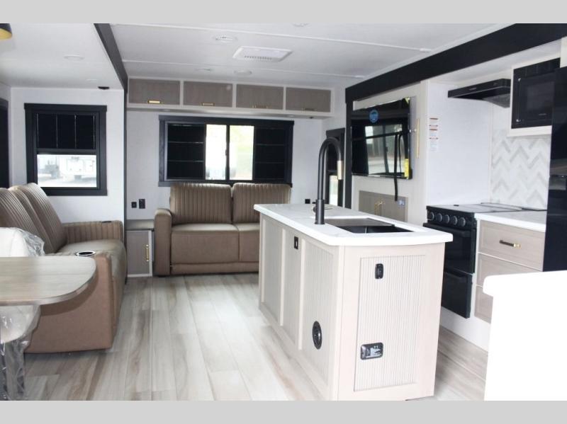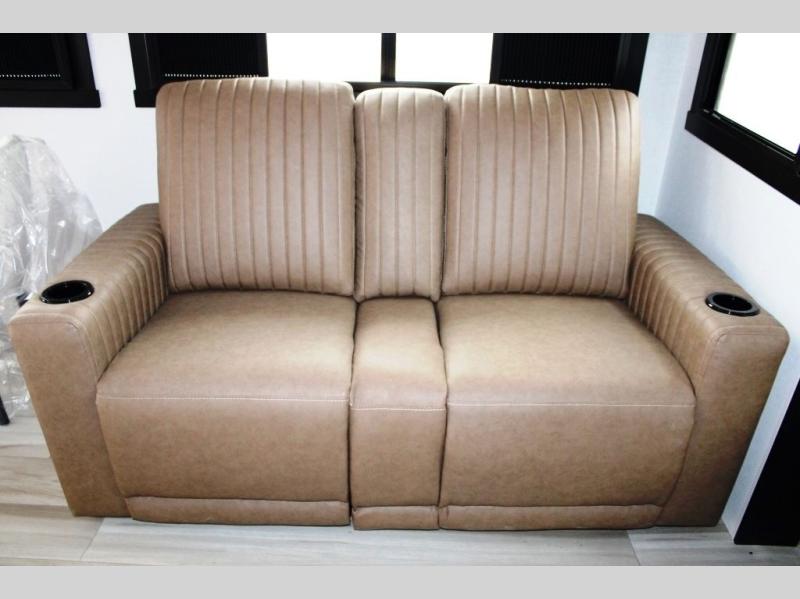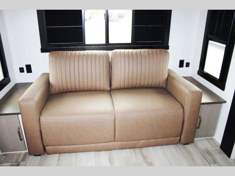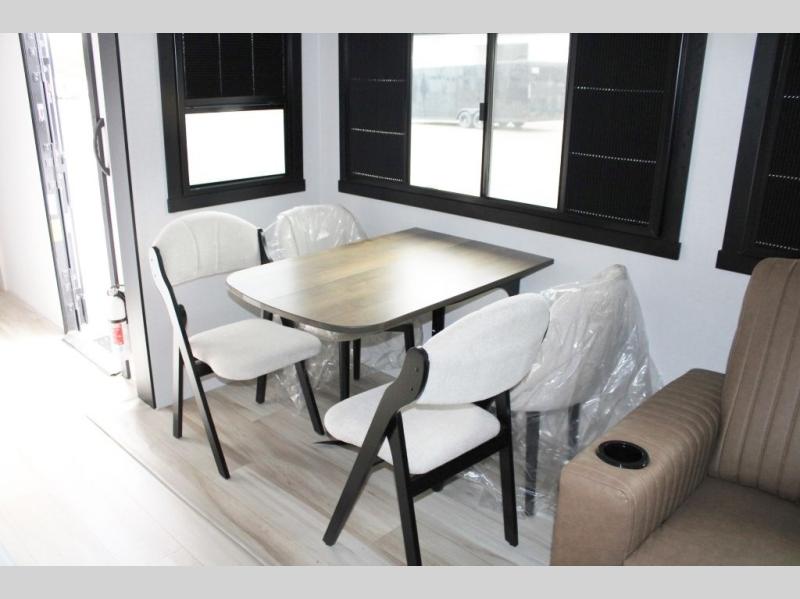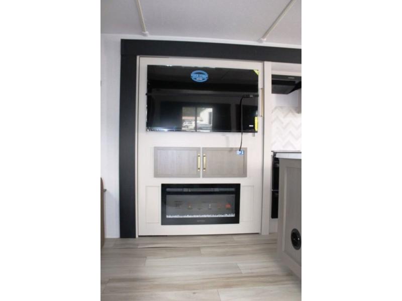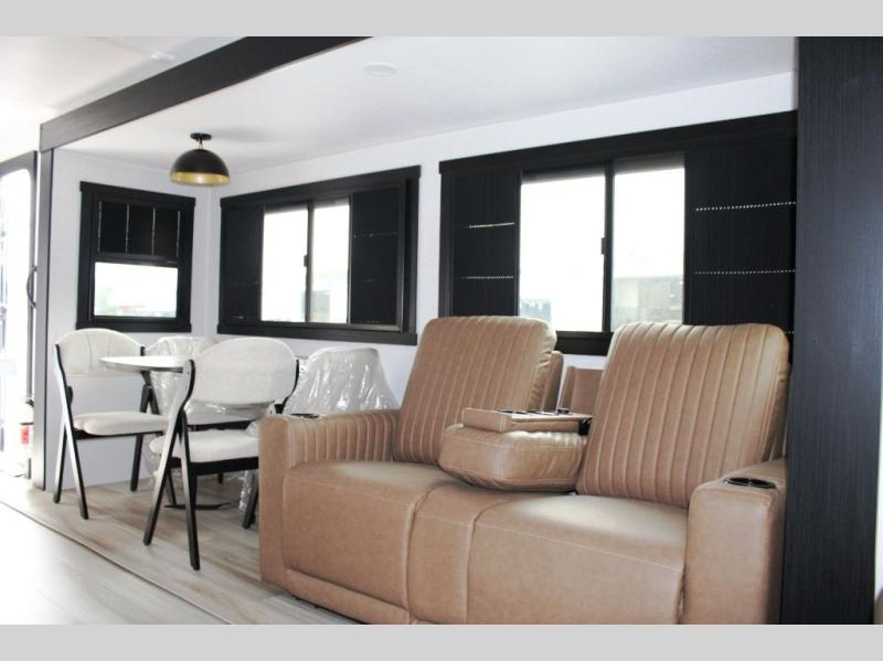 You are going to love the spacious private bedroom with a space-saving door, king bed slide, a dresser, and a full-width wardrobe with washer and dryer prep. If you ever decide to get out of bed, you can enjoy a relaxing shower in the residential shower with a skylight and a wide-open kitchen and living area with dual opposing slide outs. The cook will love having a kitchen island, a hutch, a large pantry, plus a 12V refrigerator. There is an entertainment center with a 50" TV and fireplace plus plenty of seating on the furniture. You can dine at the booth dinette or choose to add the free-standing dinette option if you prefer having your own seat. And don't forget about the natural lighting and views you will receive from the panoramic windows.