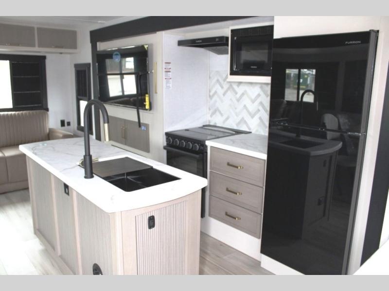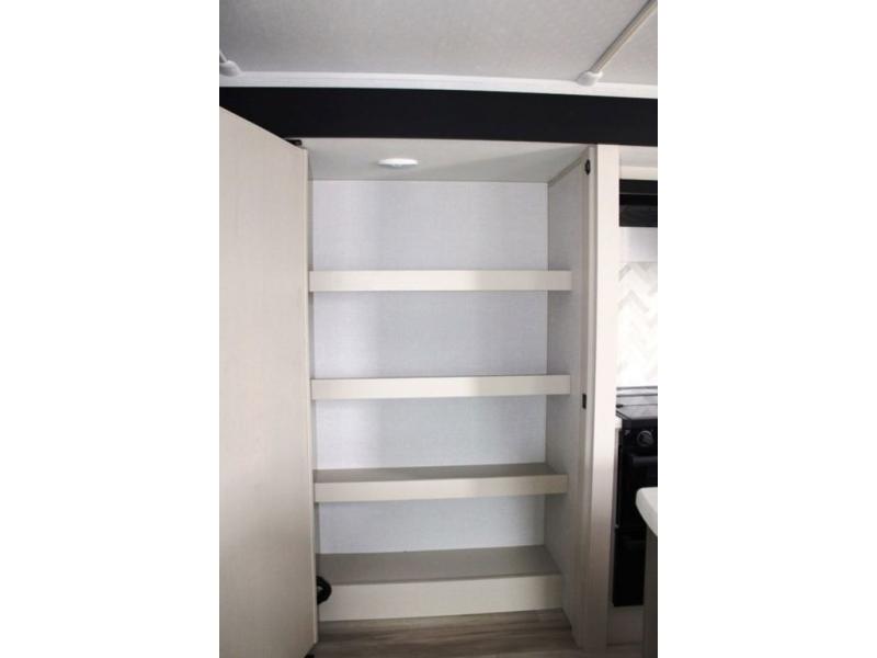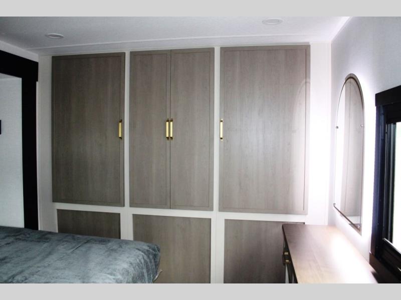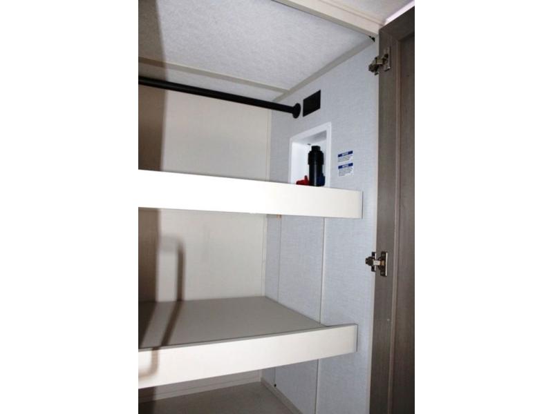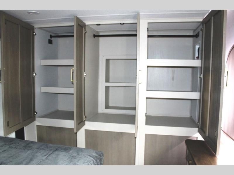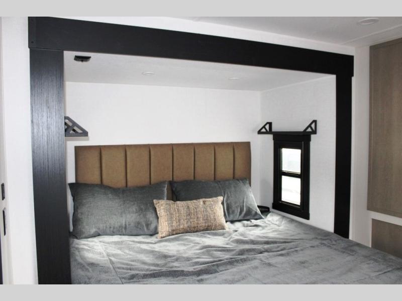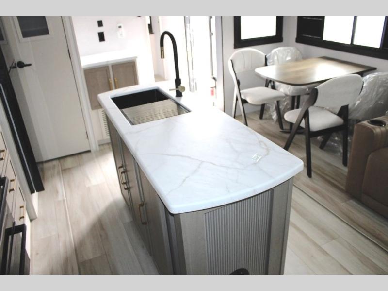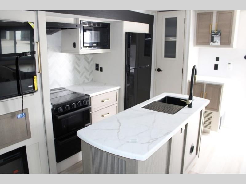 You are going to love the spacious private bedroom with a space-saving door, king bed slide, a dresser, and a full-width wardrobe with washer and dryer prep. If you ever decide to get out of bed, you can enjoy a relaxing shower in the residential shower with a skylight and a wide-open kitchen and living area with dual opposing slide outs. The cook will love having a kitchen island, a hutch, a large pantry, plus a 12V refrigerator. There is an entertainment center with a 50" TV and fireplace plus plenty of seating on the furniture. You can dine at the booth dinette or choose to add the free-standing dinette option if you prefer having your own seat. And don't forget about the natural lighting and views you will receive from the panoramic windows.