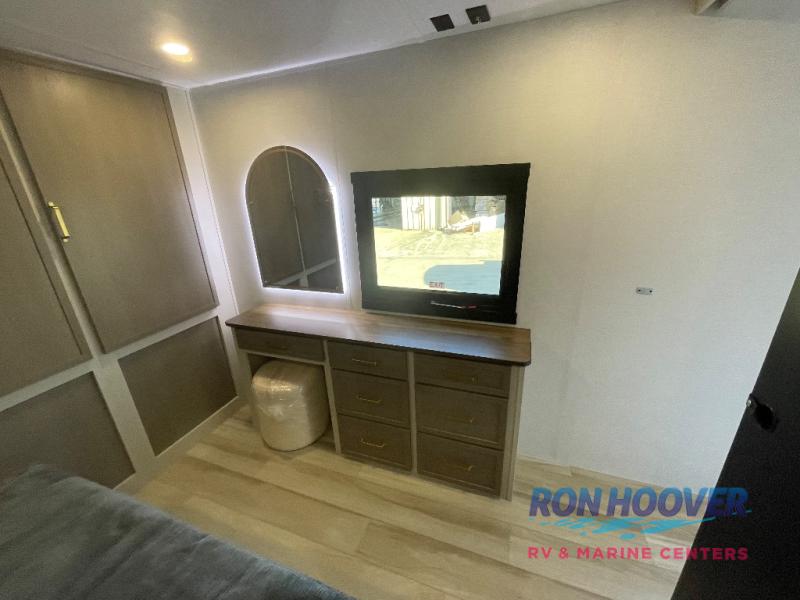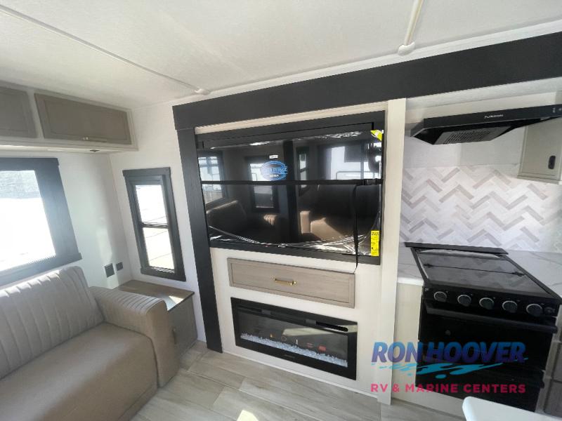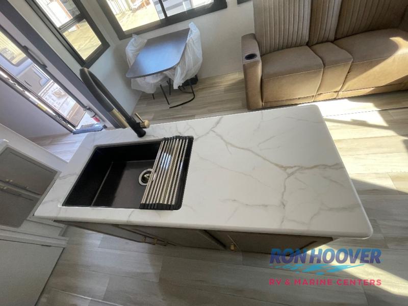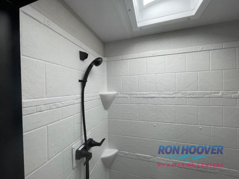 You are going to love the spacious private bedroom with a space-saving door, custom king bed slide, a dresser, and a full-width wardrobe with washer and dryer prep. If you ever decide to get out of bed, you can enjoy a relaxing shower in the residential shower with a skylight and a wide-open kitchen and living area with dual opposing slide outs. The cook will love having a kitchen island, a hutch, a large pantry, plus a 12V refrigerator. There is an entertainment center with a 50" TV and fireplace plus plenty of seating on the furniture. You can dine at the booth dinette or choose to add the free-standing dinette option if you prefer having your own seat. And don't forget about the natural lighting and views you will receive from the panoramic windows.