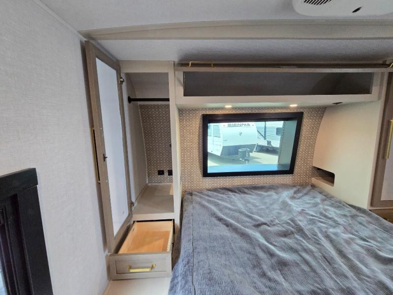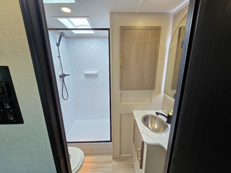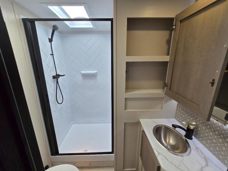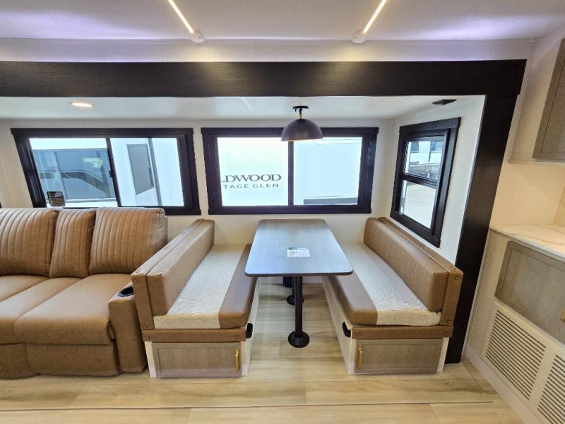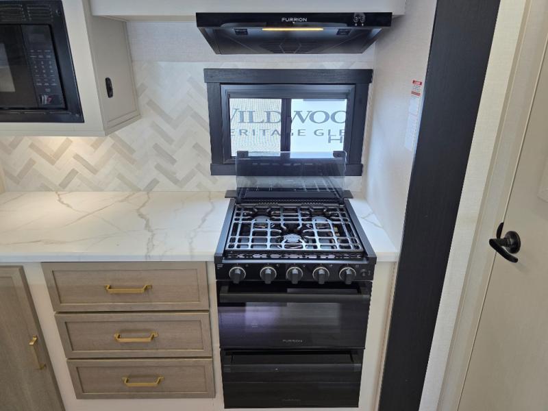 With any Wildwood Heritage Glen travel trailer by Forest River, the quality construction, attention to detail and design along with a bright and welcoming interior allows you to relax in comfort with conveniences while exploring outdoors. Each model includes a WeatherShield one piece fiberglass roof, Maxxis radial tires, and an enclosed underbelly with 12V tank heaters on all holding tanks for added protection. You will appreciate the on-demand tankless water heater, along with the 15K BTU Quite Cool A/C and 50 Amp service with a brace for a second A/C. There is an outside shower with hot and cold water, solar prep, a power tongue jack, plus many more exterior conveniences. Head inside to enjoy matte gold hardware, wood door casings in place of plastic door casings, and full length barreled ceilings for additional head room.