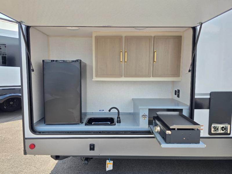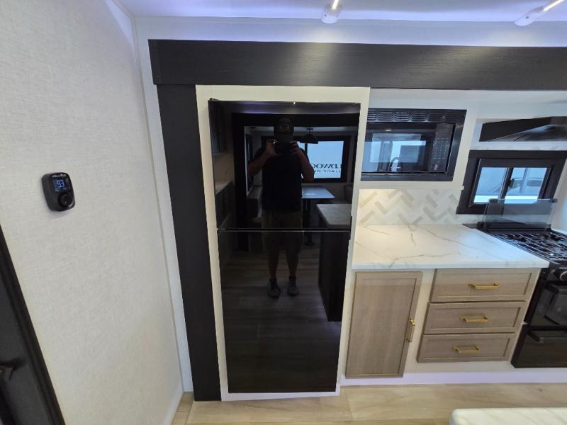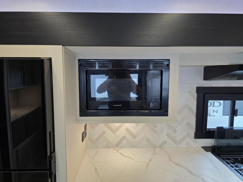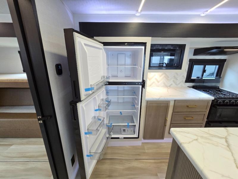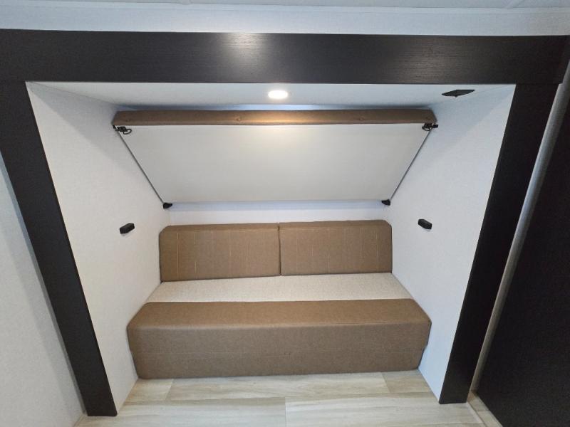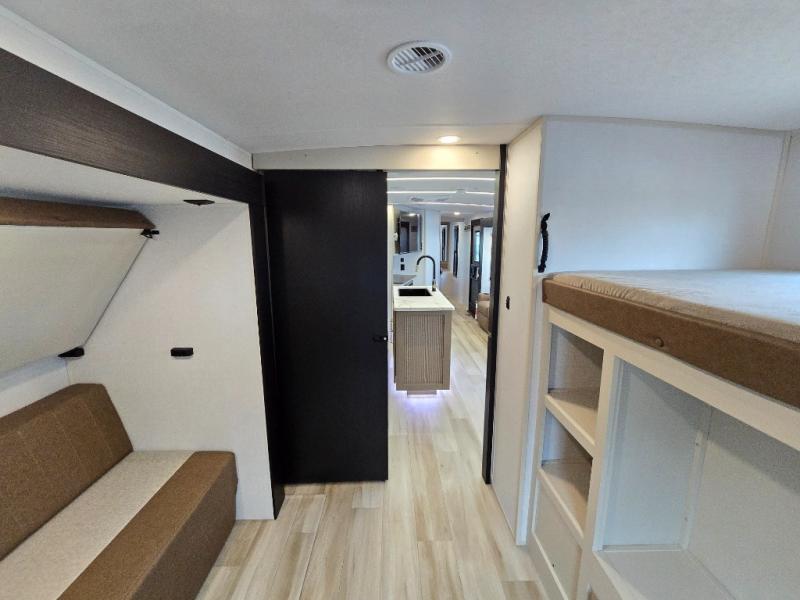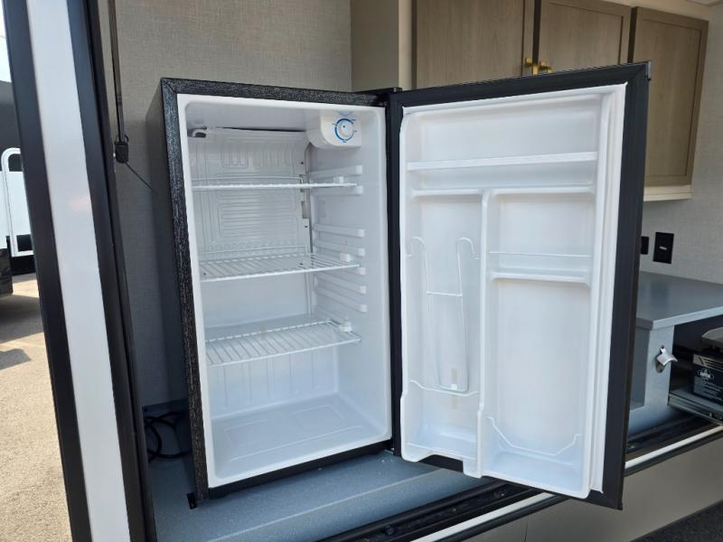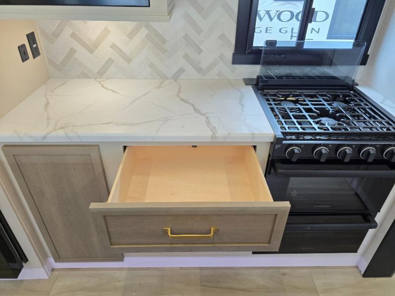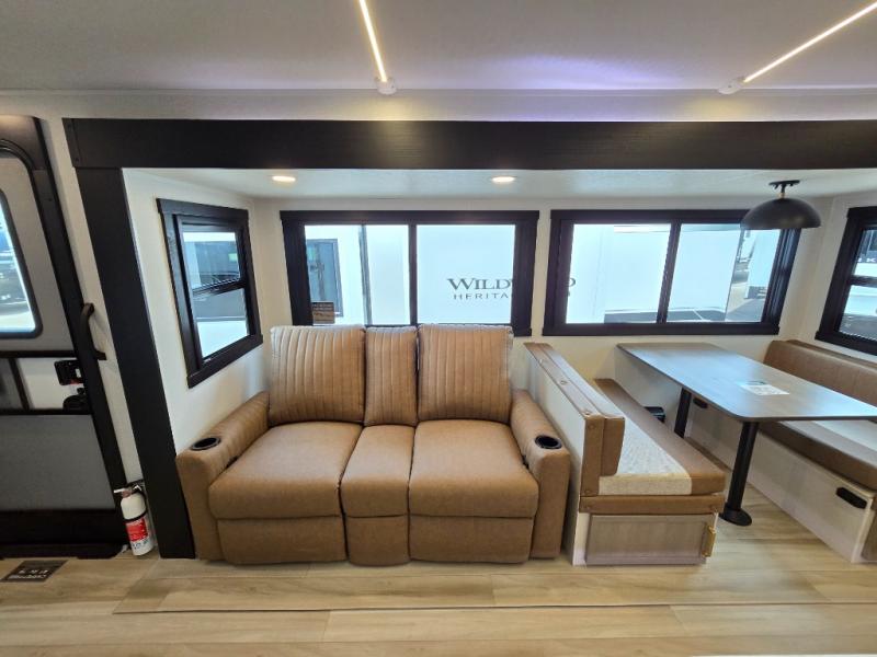 Your kids or friends are ready for a trip in this Wildwood Heritage Glen travel trailer, but are you? As the kiddos or your buddies claim the private bunkhouse for themselves, which includes two bunk beds and a convertible sofa bed, you can escape to your own privacy in the front bedroom with a queen bed with Versa Tilt and lots of storage. There is even washer/dryer prep for added convenience. The main living area and kitchen might be the next indoor hangout spot thanks to the chef-size walk-in pantry and 12V refrigerator. The cook even has a choice of making meals on the outside kitchen/bar which also includes an LP quick connect nearby. On rainy days, the theatre seats and booth dinette will offer a place to watch TV and play games, and the panoramic windows will always offer beautiful scenery no matter the weather conditions.