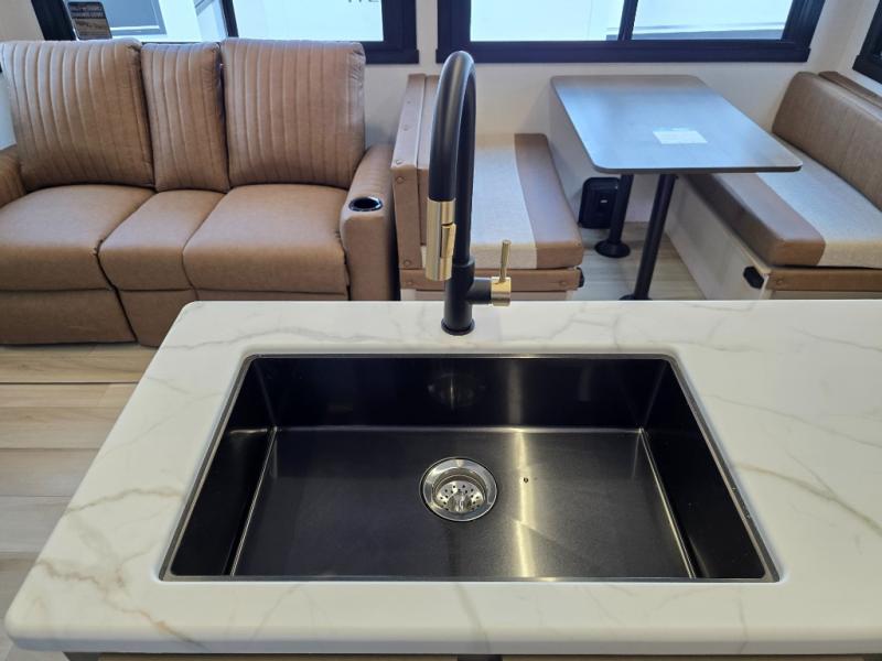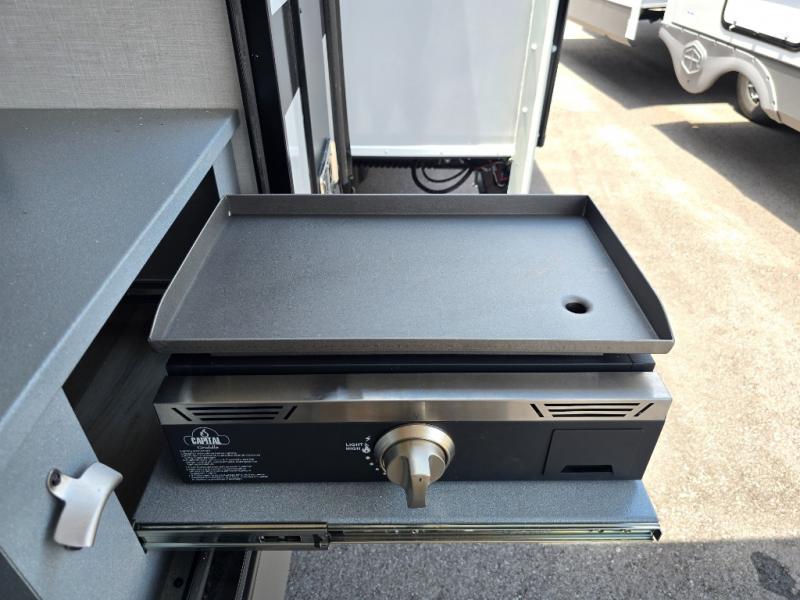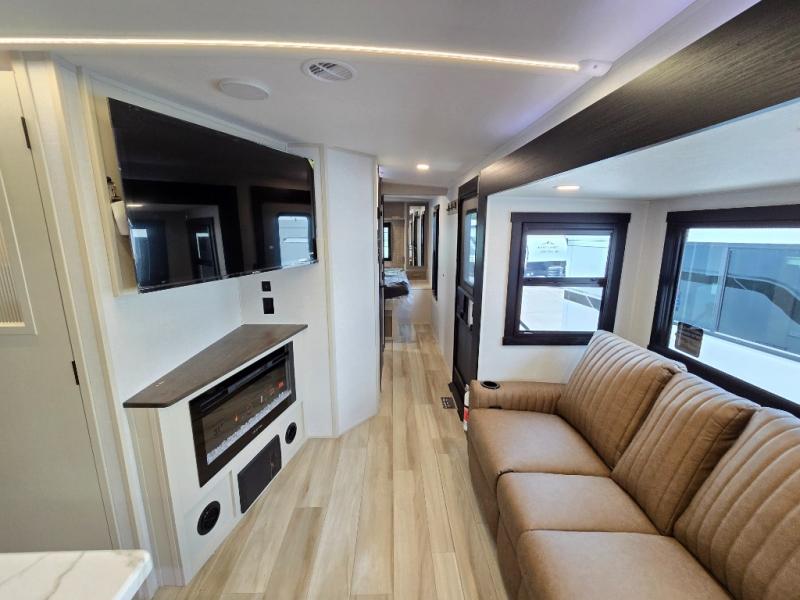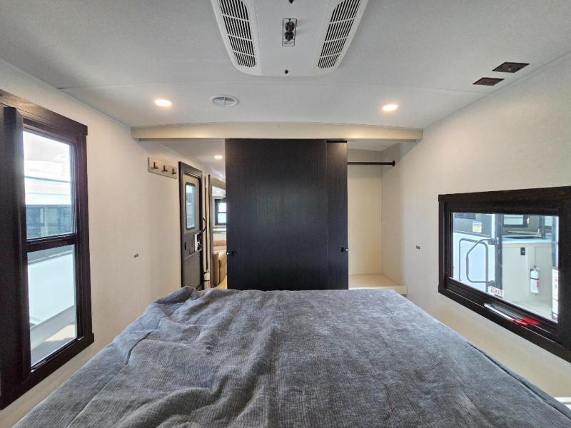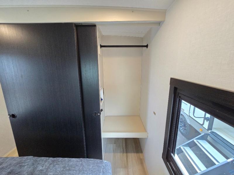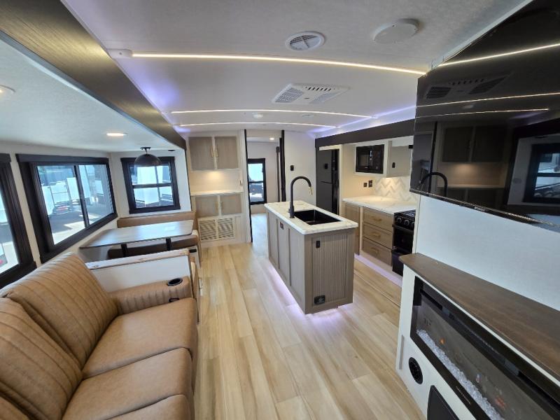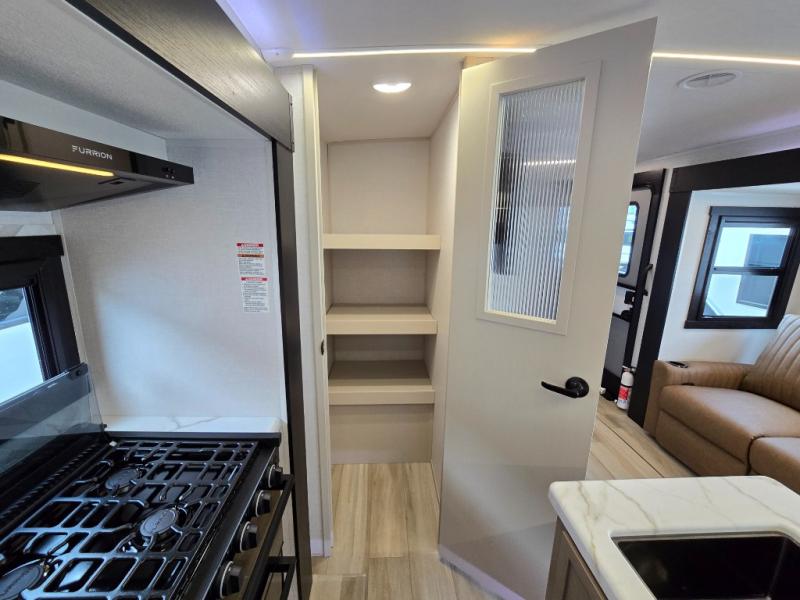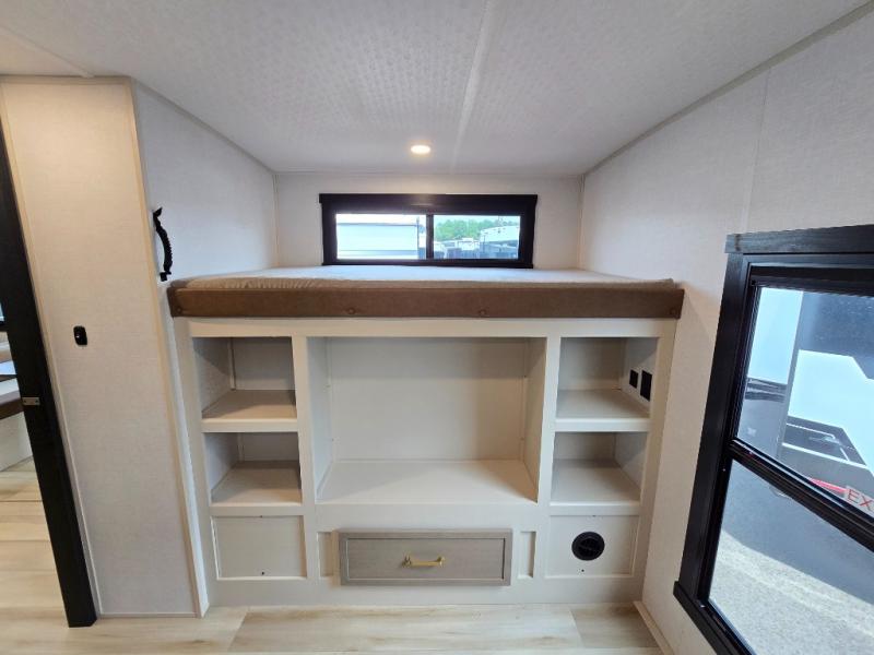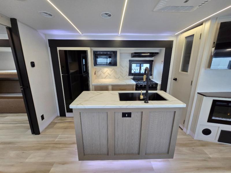 Your kids or friends are ready for a trip in this Wildwood Heritage Glen travel trailer, but are you? As the kiddos or your buddies claim the private bunkhouse for themselves, which includes two bunk beds and a convertible sofa bed, you can escape to your own privacy in the front bedroom with a queen bed with Versa Tilt and lots of storage. There is even washer/dryer prep for added convenience. The main living area and kitchen might be the next indoor hangout spot thanks to the chef-size walk-in pantry and 12V refrigerator. The cook even has a choice of making meals on the outside kitchen/bar which also includes an LP quick connect nearby. On rainy days, the theatre seats and booth dinette will offer a place to watch TV and play games, and the panoramic windows will always offer beautiful scenery no matter the weather conditions.