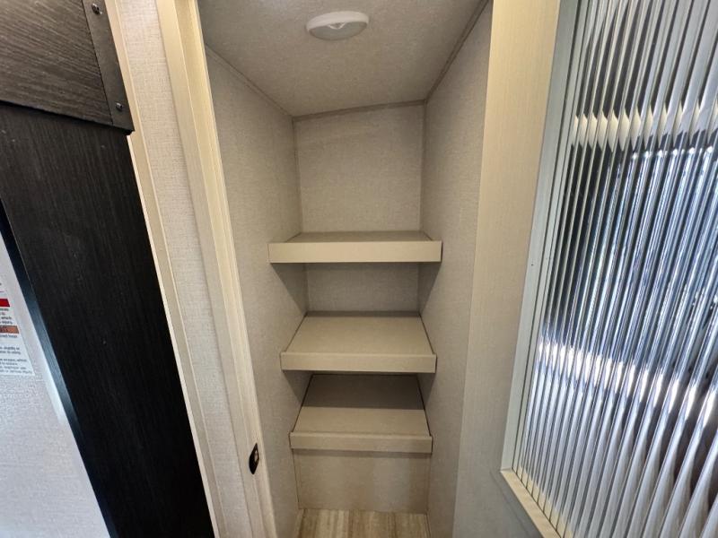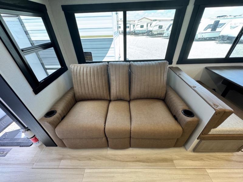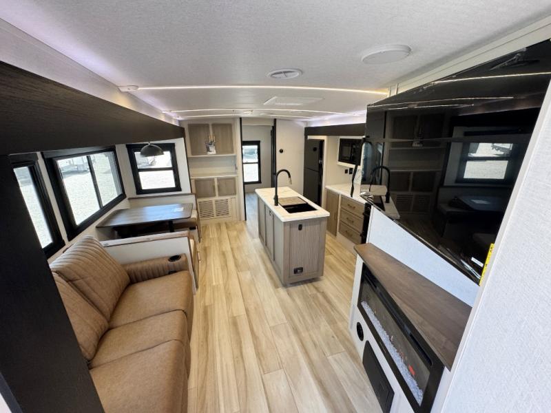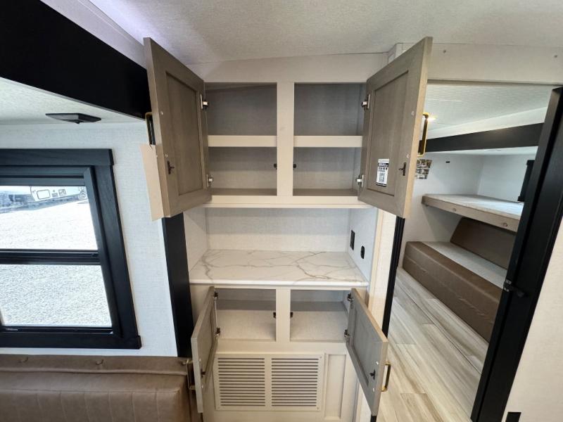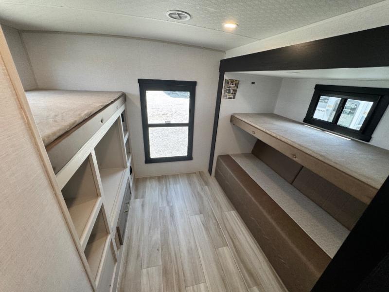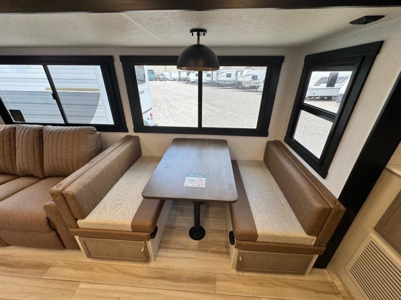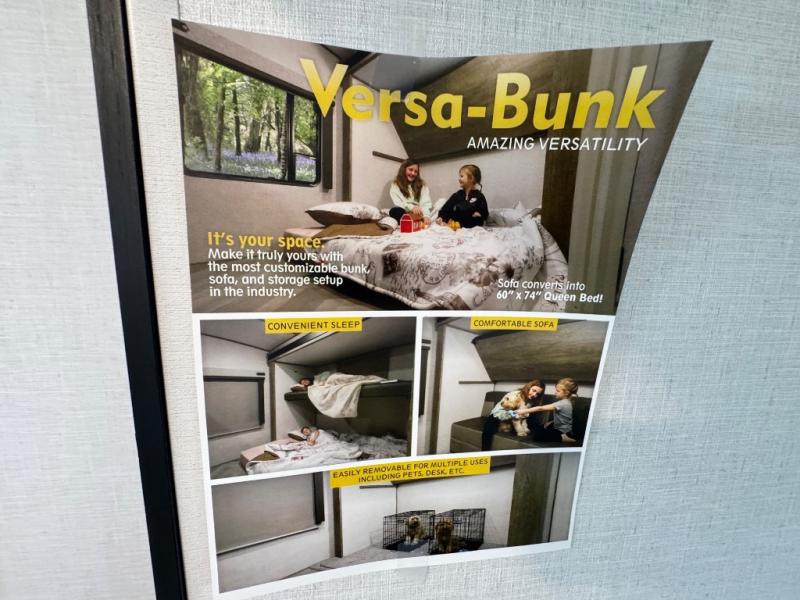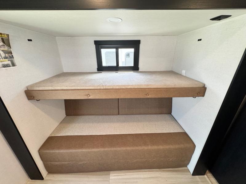 Your kids or friends are ready for a trip in this Wildwood Heritage Glen travel trailer, but are you? As the kiddos or your buddies claim the private bunkhouse for themselves, which includes two bunk beds and a convertible sofa bed, you can escape to your own privacy in the front bedroom with a queen bed with Versa Tilt and lots of storage. There is even washer/dryer prep for added convenience. The main living area and kitchen might be the next indoor hangout spot thanks to the chef-size walk-in pantry and 12V refrigerator. The cook even has a choice of making meals on the outside kitchen/bar which also includes an LP quick connect nearby. On rainy days, the theatre seats and booth dinette will offer a place to watch TV and play games, and the panoramic windows will always offer beautiful scenery no matter the weather conditions.