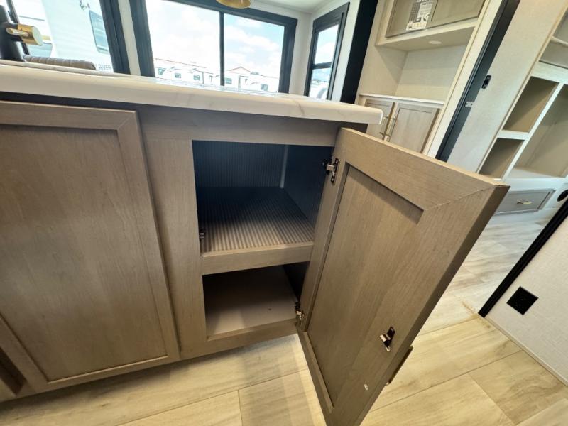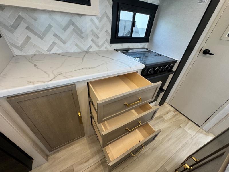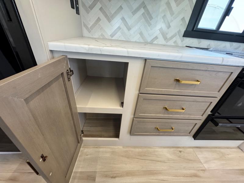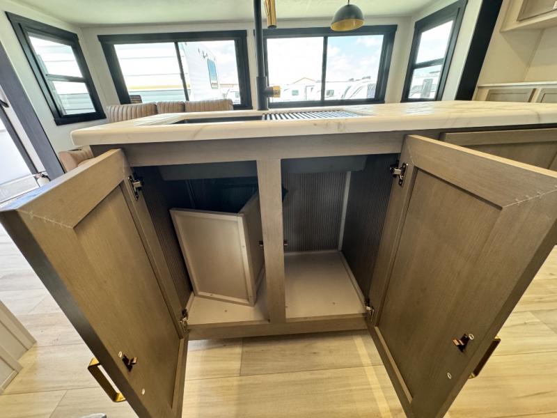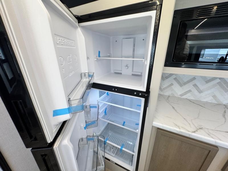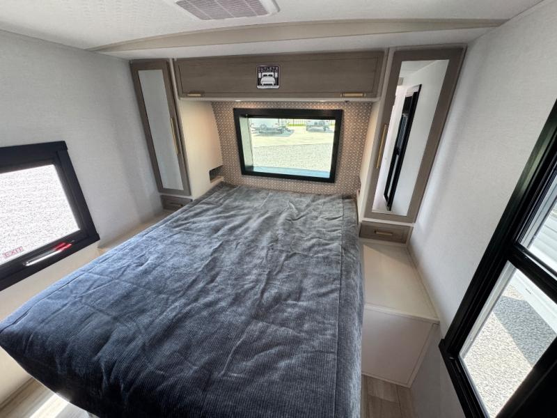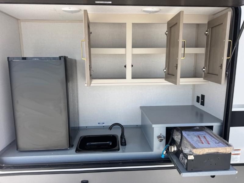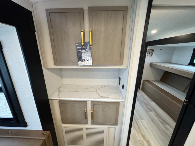 Your kids or friends are ready for a trip in this Wildwood Heritage Glen travel trailer, but are you? As the kiddos or your buddies claim the private bunkhouse for themselves, which includes two bunk beds and a convertible sofa bed, you can escape to your own privacy in the front bedroom with a queen bed with Versa Tilt and lots of storage. There is even washer/dryer prep for added convenience. The main living area and kitchen might be the next indoor hangout spot thanks to the chef-size walk-in pantry and 12V refrigerator. The cook even has a choice of making meals on the outside kitchen/bar which also includes an LP quick connect nearby. On rainy days, the theatre seats and booth dinette will offer a place to watch TV and play games, and the panoramic windows will always offer beautiful scenery no matter the weather conditions.