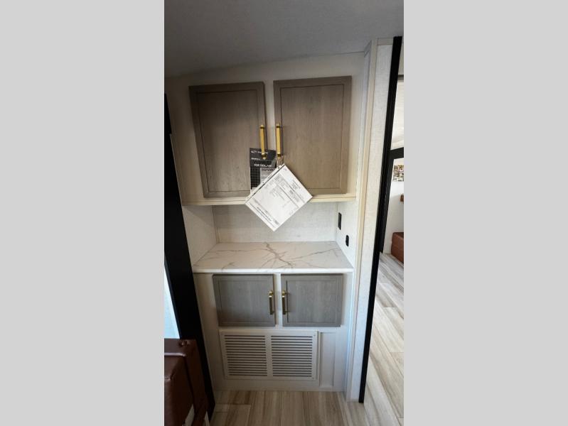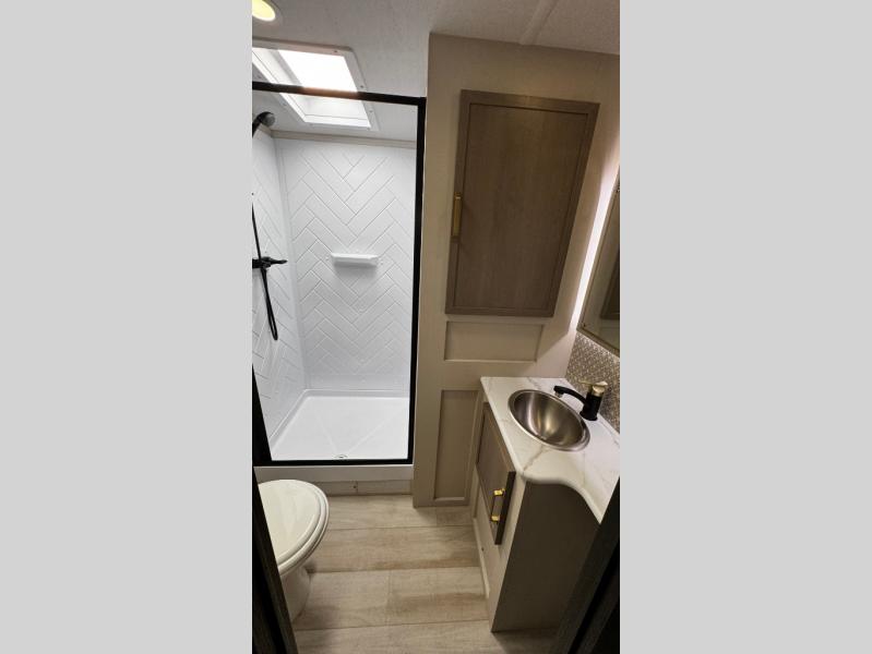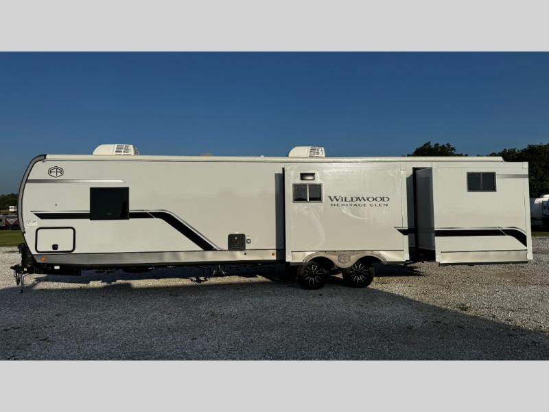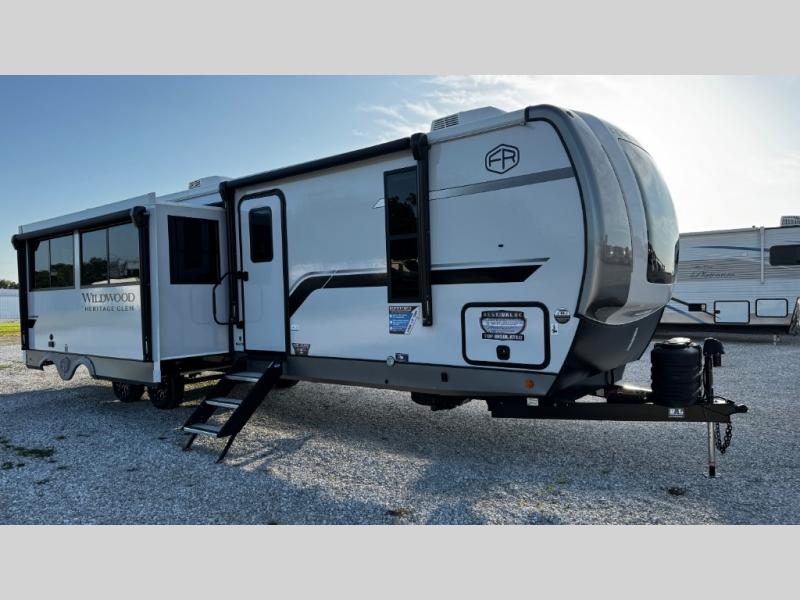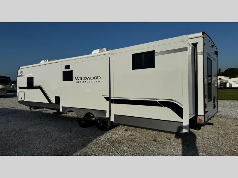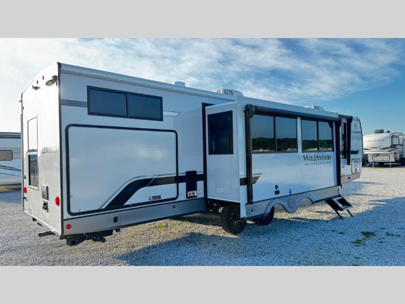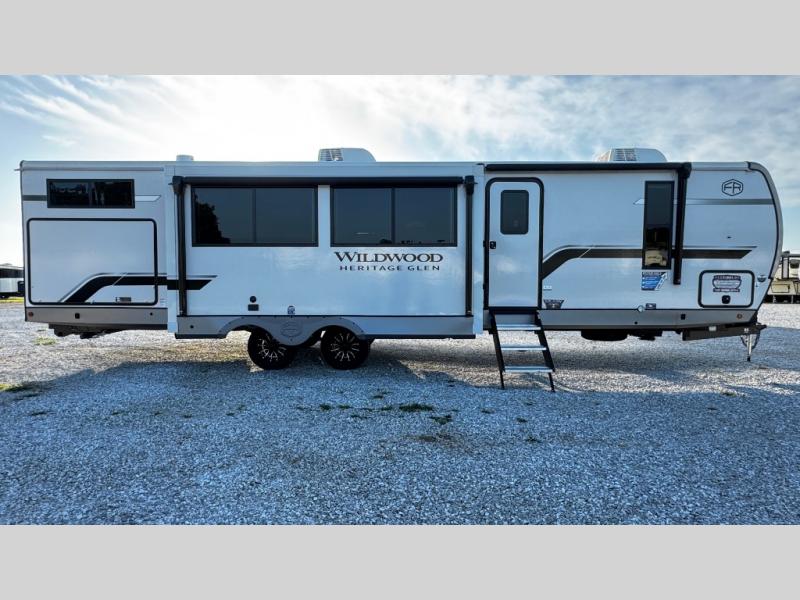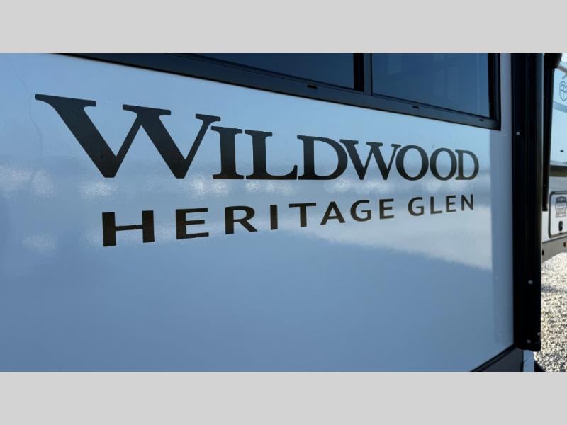 With any Wildwood Heritage Glen travel trailer by Forest River, the quality construction, attention to detail and design along with a bright and welcoming interior allows you to relax in comfort with conveniences while exploring outdoors. Each model includes a WeatherShield one piece fiberglass roof, Maxxis radial tires, and an enclosed underbelly with 12V tank heaters on all holding tanks for added protection. You will appreciate the on-demand tankless water heater, along with the 15K BTU Quite Cool A/C and 50 Amp service with a brace for a second A/C. There is an outside shower with hot and cold water, solar prep, a power tongue jack, plus many more exterior conveniences. Head inside to enjoy matte gold hardware, wood door casings in place of plastic door casings, and full length barreled ceilings for additional head room.