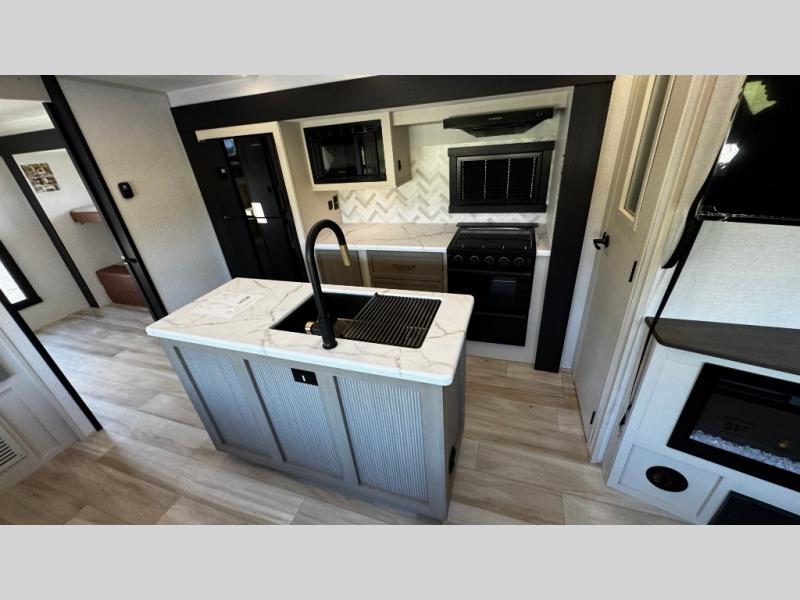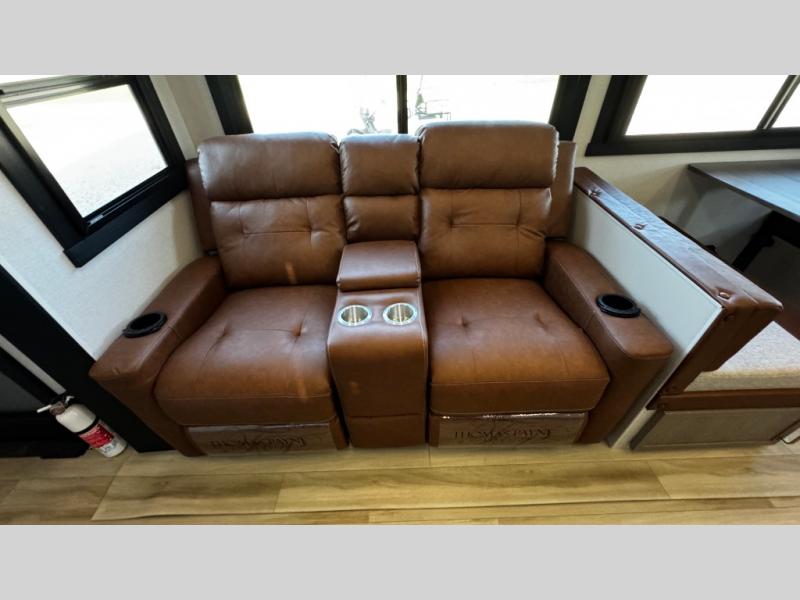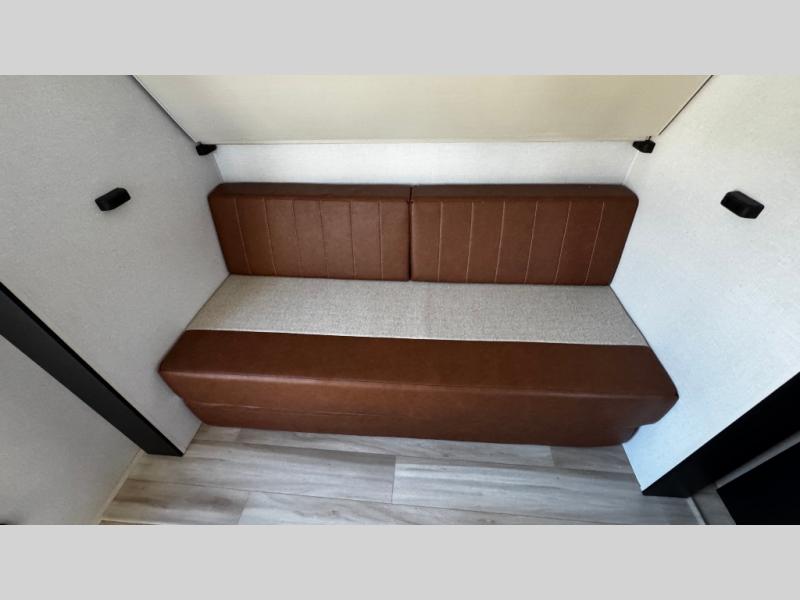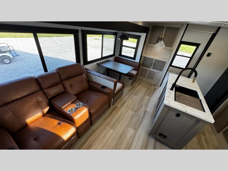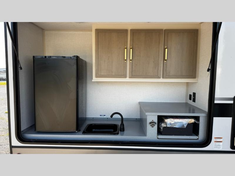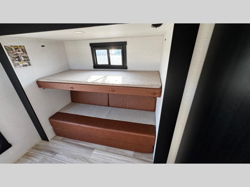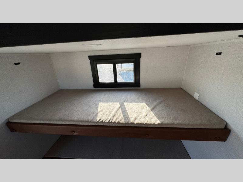Your kids or friends are ready for a trip in this Wildwood Heritage Glen travel trailer, but are you? As the kiddos or your buddies claim the private bunkhouse for themselves, which includes two bunk beds and a convertible sofa bed, you can escape to your own privacy in the front bedroom with a queen bed with Versa Tilt and lots of storage. There is even washer/dryer prep for added convenience. The main living area and kitchen might be the next indoor hangout spot thanks to the chef-size walk-in pantry and 12V refrigerator. The cook even has a choice of making meals on the outside kitchen/bar which also includes an LP quick connect nearby. On rainy days, the theatre seats and booth dinette will offer a place to watch TV and play games, and the panoramic windows will always offer beautiful scenery no matter the weather conditions.