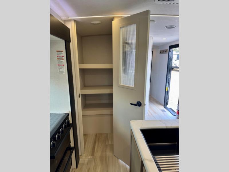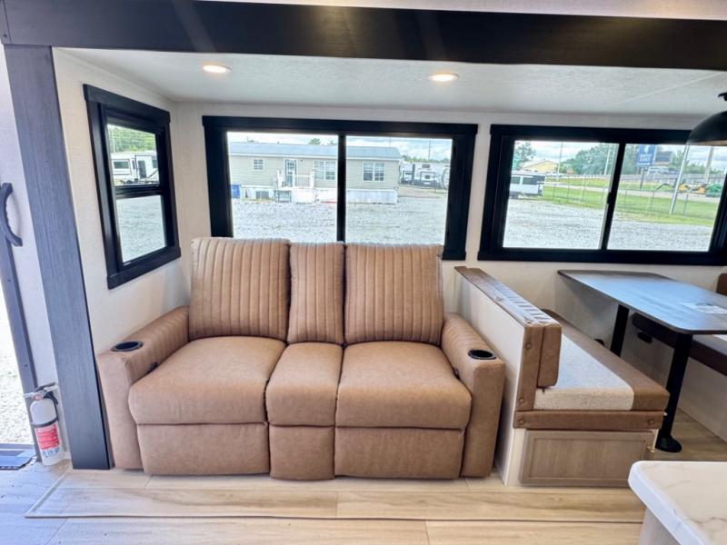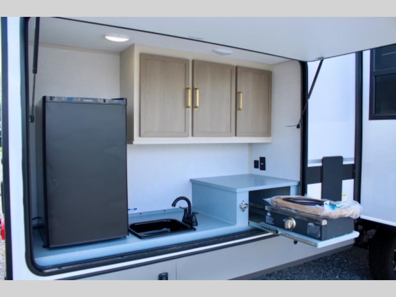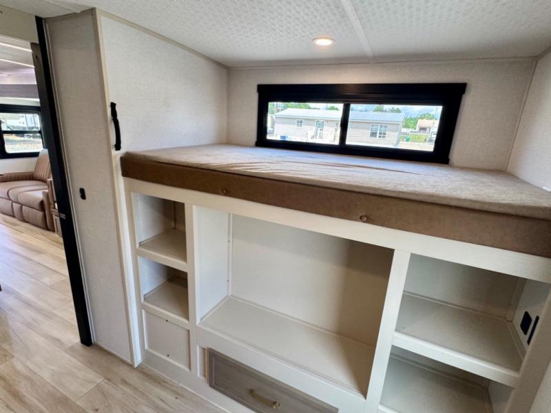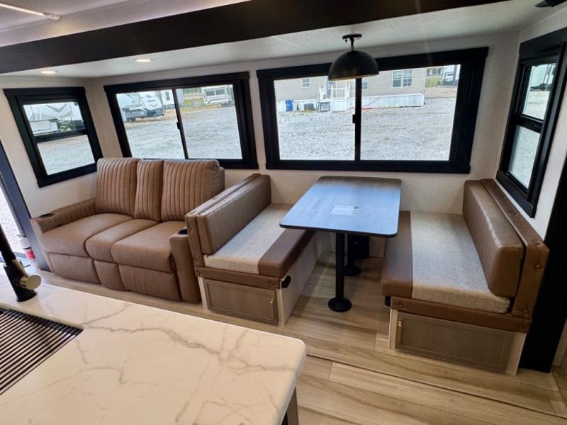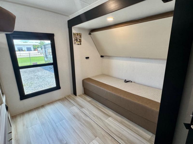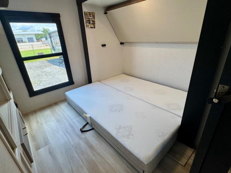Your kids or friends are ready for a trip in this Wildwood Heritage Glen travel trailer, but are you? As the kiddos or your buddies claim the private bunkhouse for themselves, which includes two bunk beds and a convertible sofa bed, you can escape to your own privacy in the front bedroom with a queen bed with Versa Tilt and lots of storage. There is even washer/dryer prep for added convenience. The main living area and kitchen might be the next indoor hangout spot thanks to the chef-size walk-in pantry and 12V refrigerator. The cook even has a choice of making meals on the outside kitchen/bar which also includes an LP quick connect nearby. On rainy days, the theatre seats and booth dinette will offer a place to watch TV and play games, and the panoramic windows will always offer beautiful scenery no matter the weather conditions.