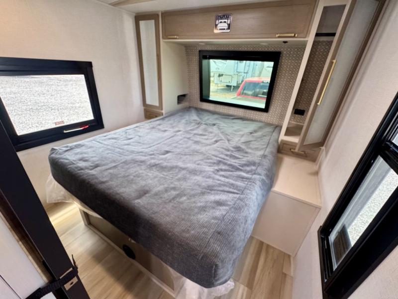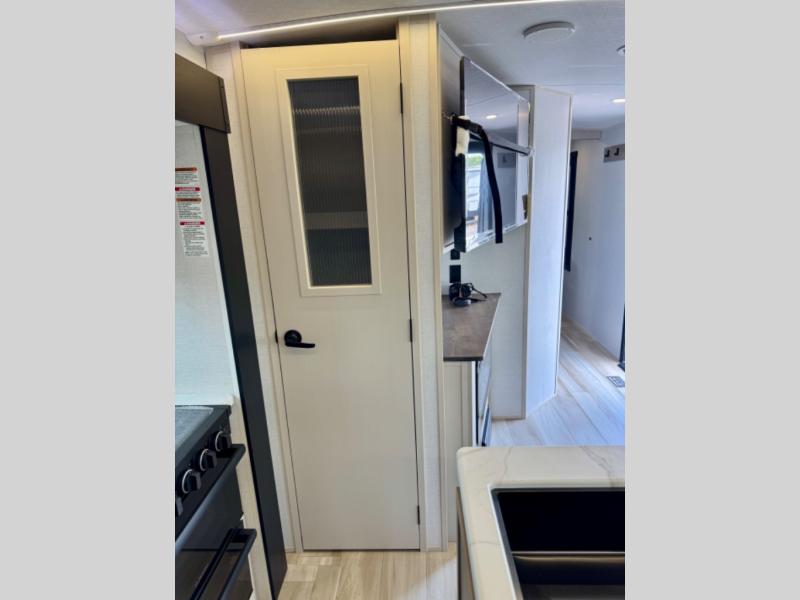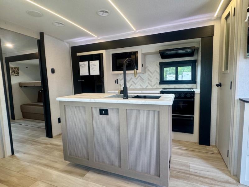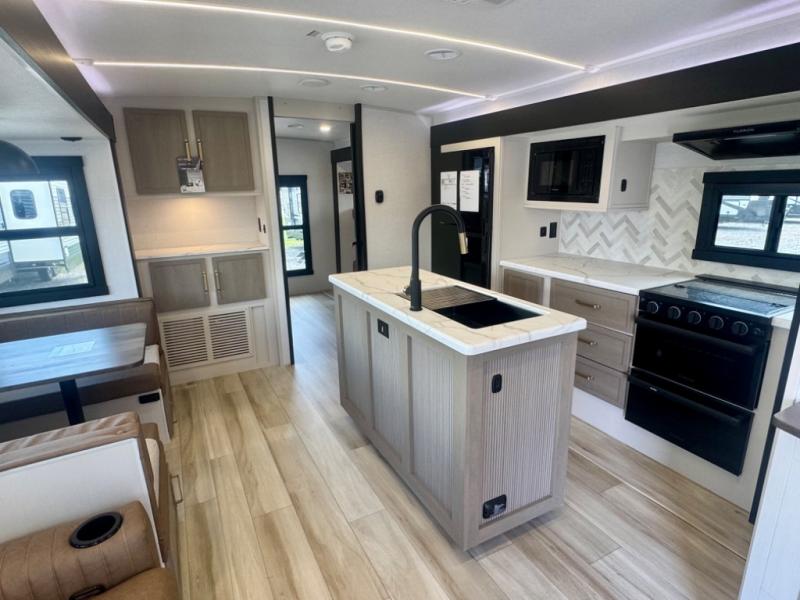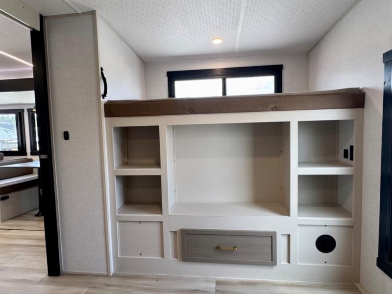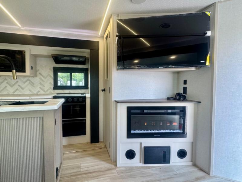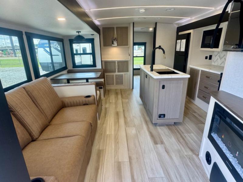 Your kids or friends are ready for a trip in this Wildwood Heritage Glen travel trailer, but are you? As the kiddos or your buddies claim the private bunkhouse for themselves, which includes two bunk beds and a convertible sofa bed, you can escape to your own privacy in the front bedroom with a queen bed with Versa Tilt and lots of storage. There is even washer/dryer prep for added convenience. The main living area and kitchen might be the next indoor hangout spot thanks to the chef-size walk-in pantry and 12V refrigerator. The cook even has a choice of making meals on the outside kitchen/bar which also includes an LP quick connect nearby. On rainy days, the theatre seats and booth dinette will offer a place to watch TV and play games, and the panoramic windows will always offer beautiful scenery no matter the weather conditions.