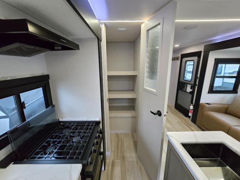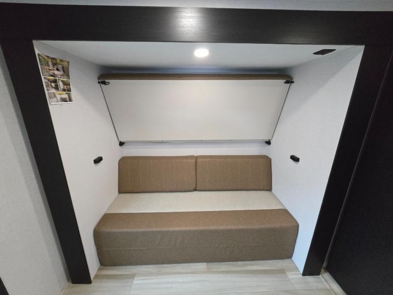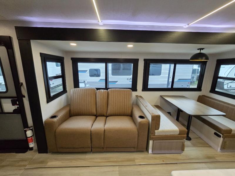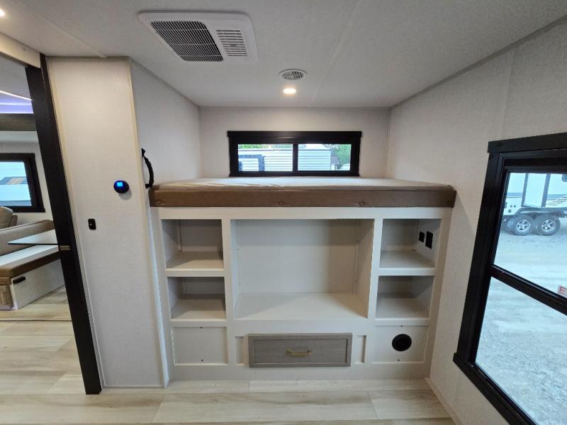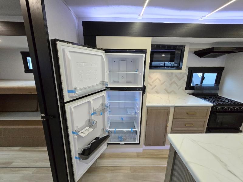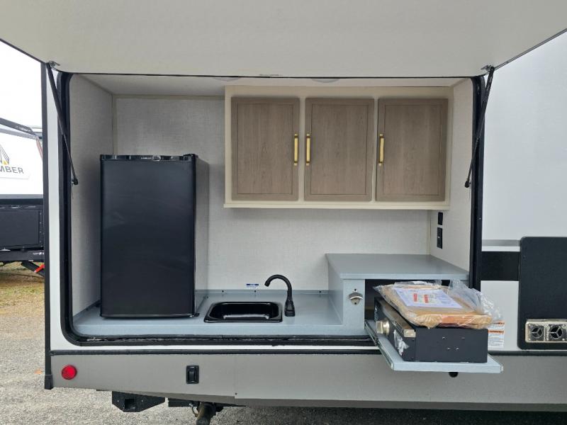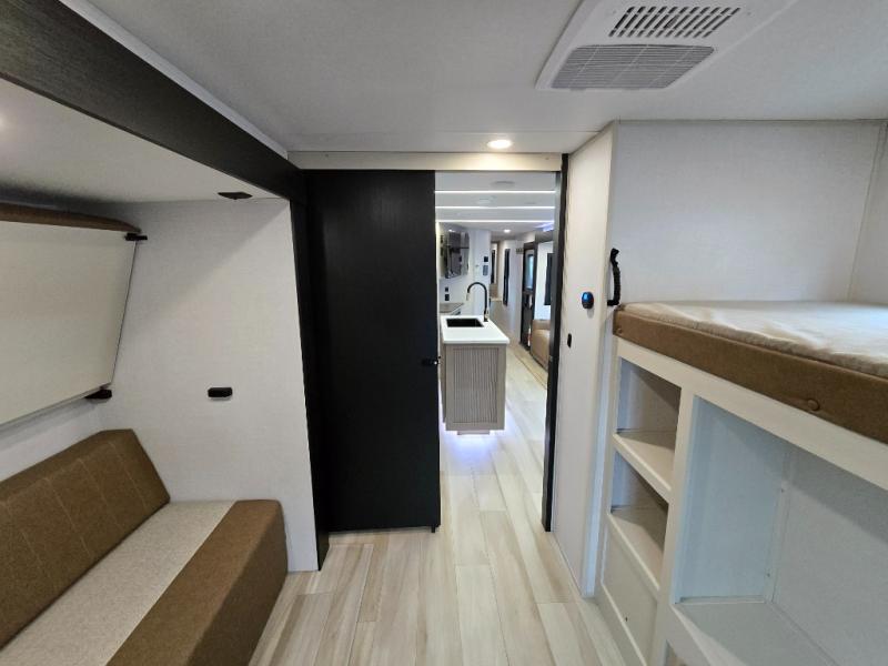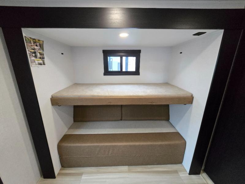 Your kids or friends are ready for a trip in this Wildwood Heritage Glen travel trailer, but are you? As the kiddos or your buddies claim the private bunkhouse for themselves, which includes two bunk beds and a convertible sofa bed, you can escape to your own privacy in the front bedroom with a queen bed with Versa Tilt and lots of storage. There is even washer/dryer prep for added convenience. The main living area and kitchen might be the next indoor hangout spot thanks to the chef-size walk-in pantry and 12V refrigerator. The cook even has a choice of making meals on the outside kitchen/bar which also includes an LP quick connect nearby. On rainy days, the theatre seats and booth dinette will offer a place to watch TV and play games, and the panoramic windows will always offer beautiful scenery no matter the weather conditions.