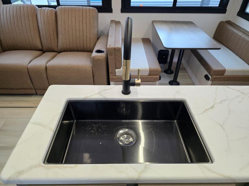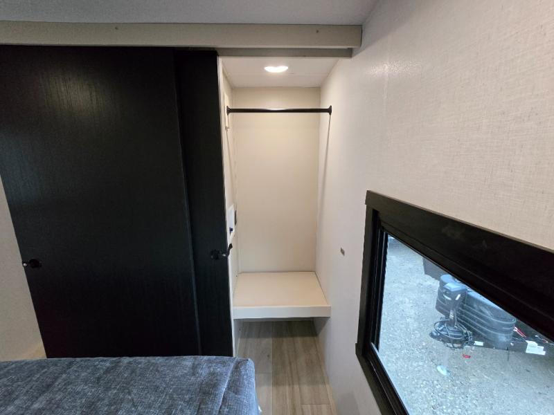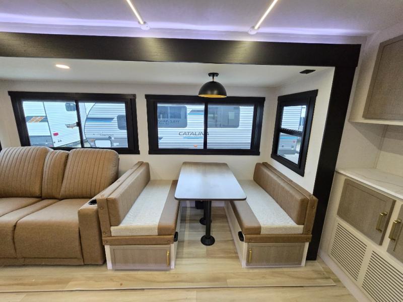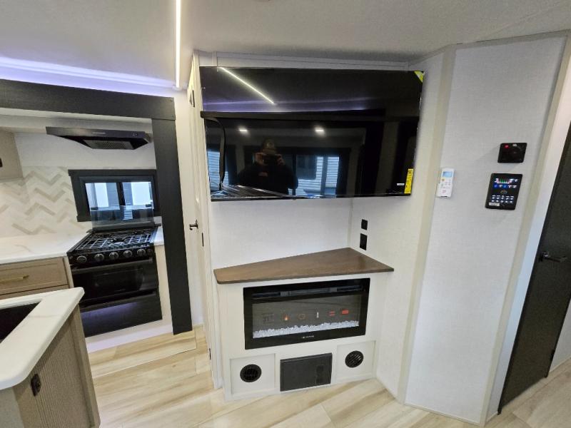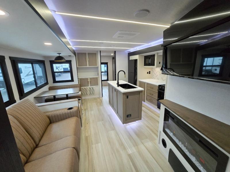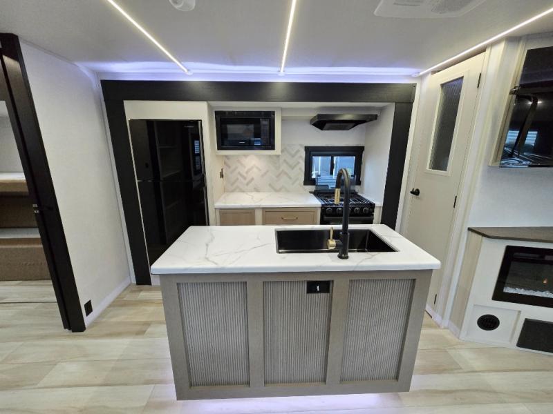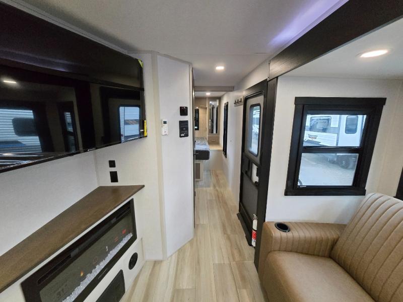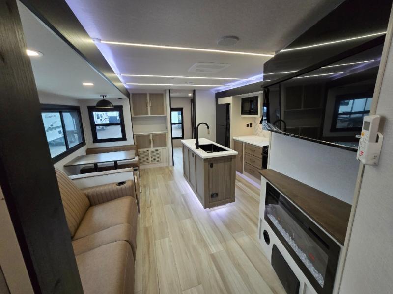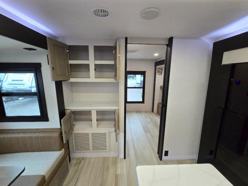 Your kids or friends are ready for a trip in this Wildwood Heritage Glen travel trailer, but are you? As the kiddos or your buddies claim the private bunkhouse for themselves, which includes two bunk beds and a convertible sofa bed, you can escape to your own privacy in the front bedroom with a queen bed with Versa Tilt and lots of storage. There is even washer/dryer prep for added convenience. The main living area and kitchen might be the next indoor hangout spot thanks to the chef-size walk-in pantry and 12V refrigerator. The cook even has a choice of making meals on the outside kitchen/bar which also includes an LP quick connect nearby. On rainy days, the theatre seats and booth dinette will offer a place to watch TV and play games, and the panoramic windows will always offer beautiful scenery no matter the weather conditions.