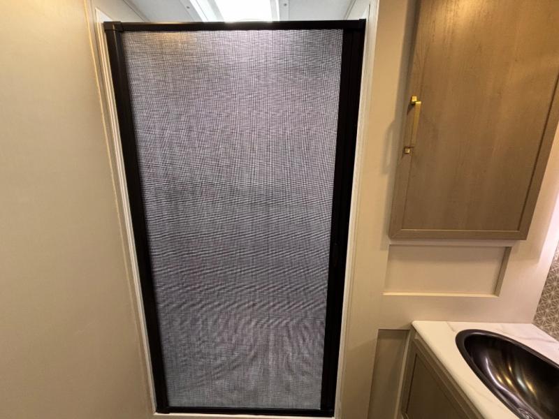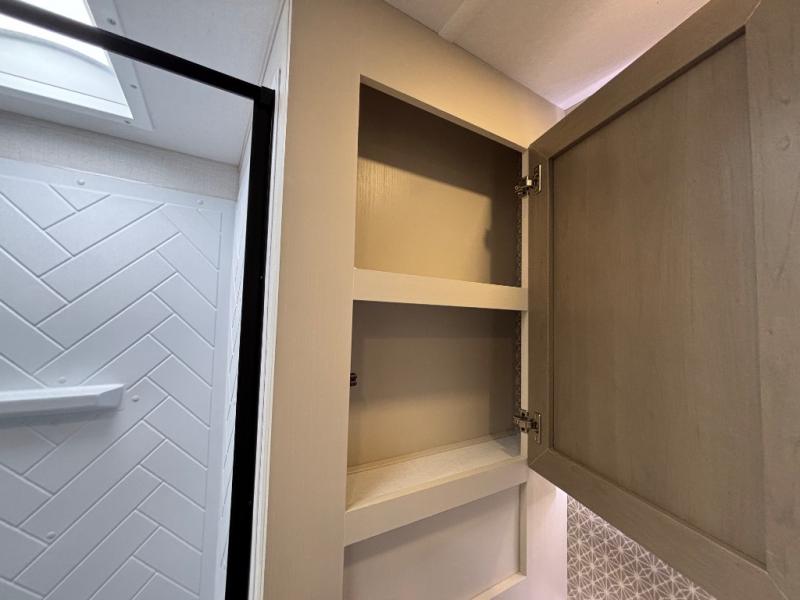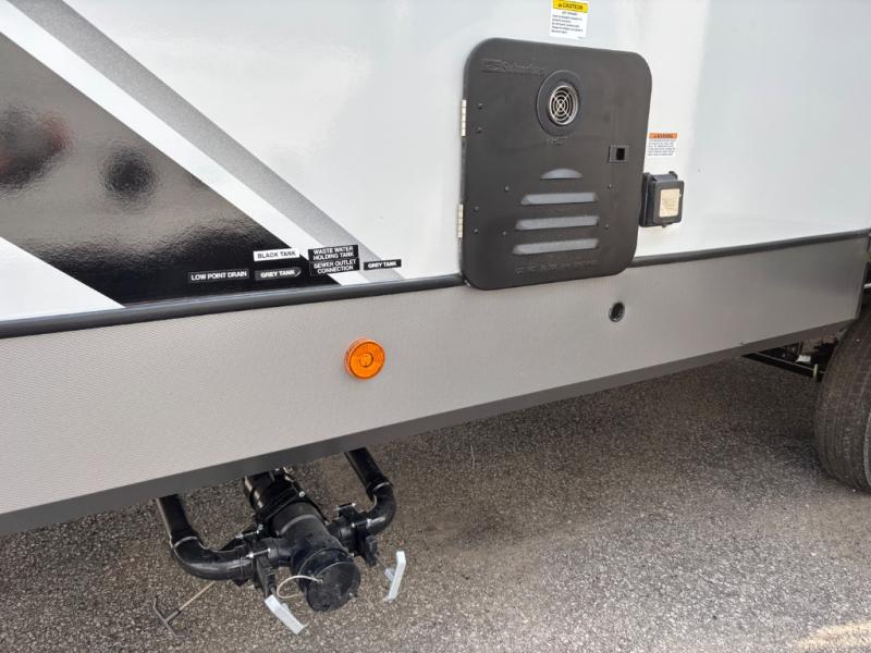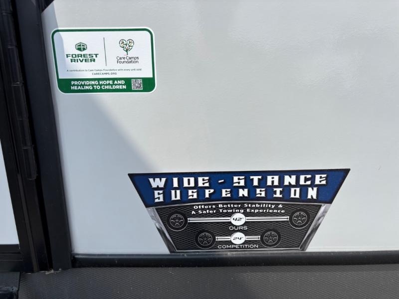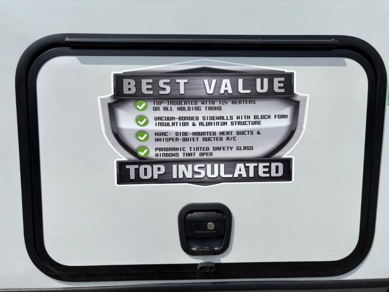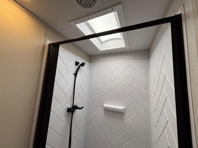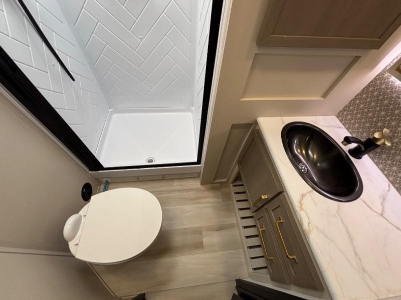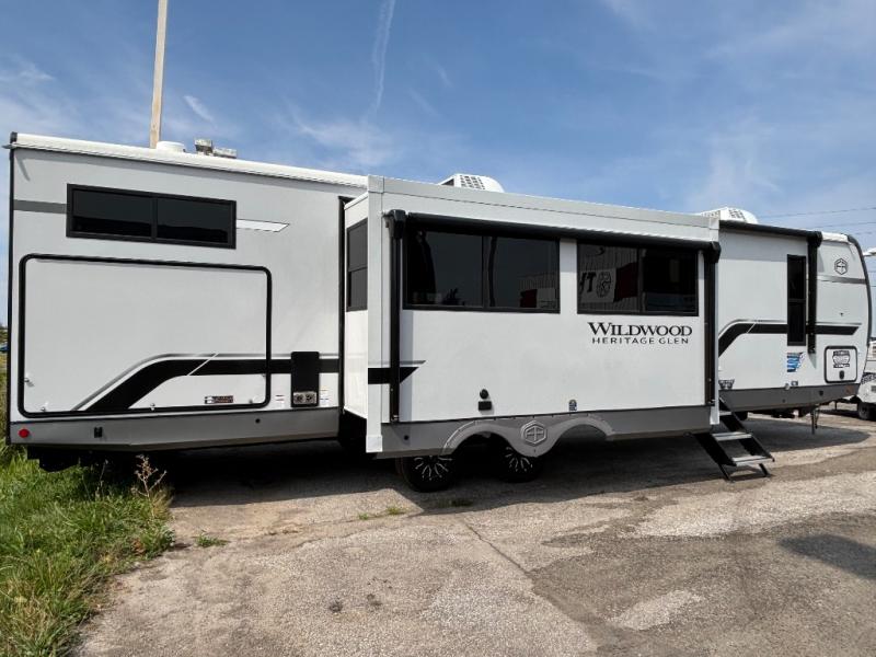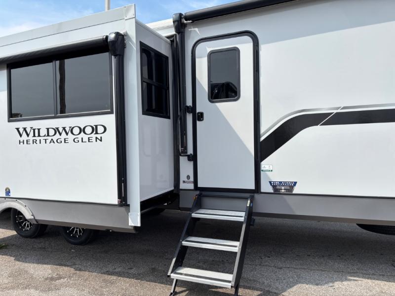 With any Wildwood Heritage Glen travel trailer by Forest River, the quality construction, attention to detail and design along with a bright and welcoming interior allows you to relax in comfort. Each model includes a WeatherShield one piece fiberglass roof, nitrogen-filled radial tires, and an enclosed underbelly with 12V tank heaters on all holding tanks for added protection. You will appreciate the on-demand tankless water heater, along with power stabilizer and tongue jacks, and an extra-large pass-thru storage with slam latch baggage doors. Head inside to enjoy matte gold hardware, wood door casings in place of plastic door casings, and an ultimate interior lighting upgrade with 4k puck/strip lights and a stylish LED back-lit bath mirror!