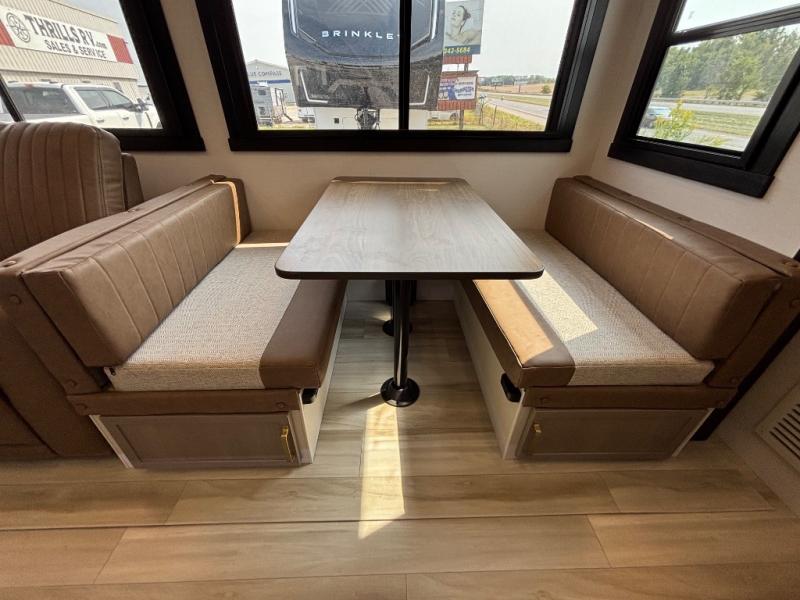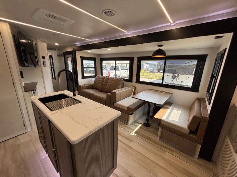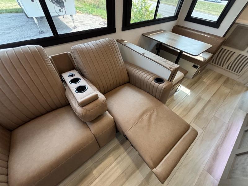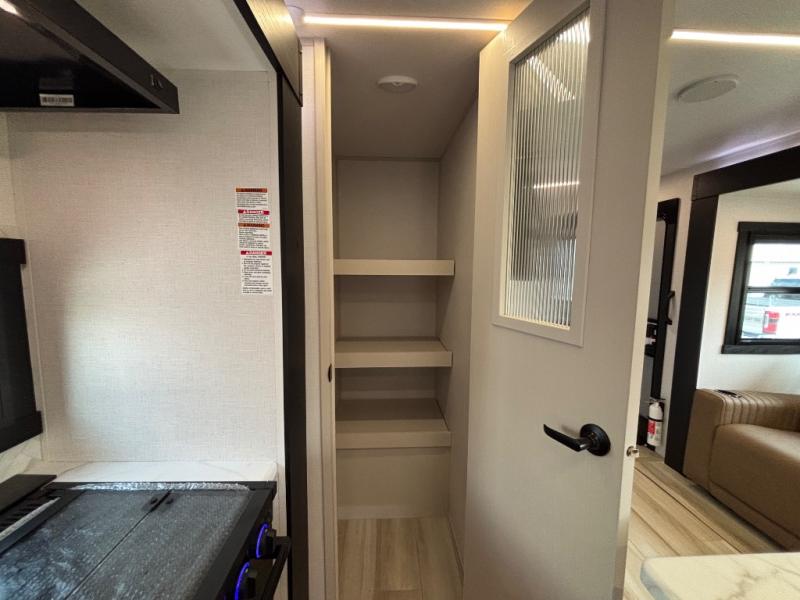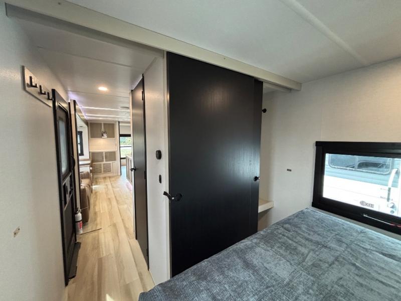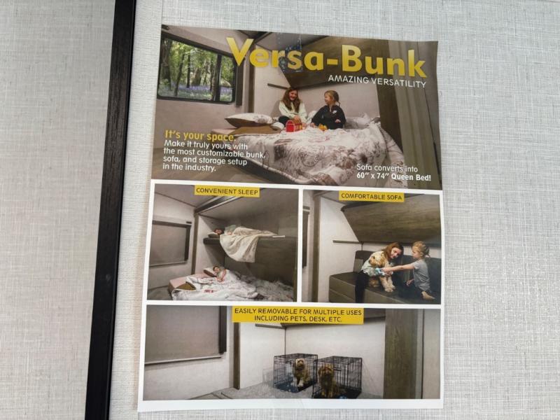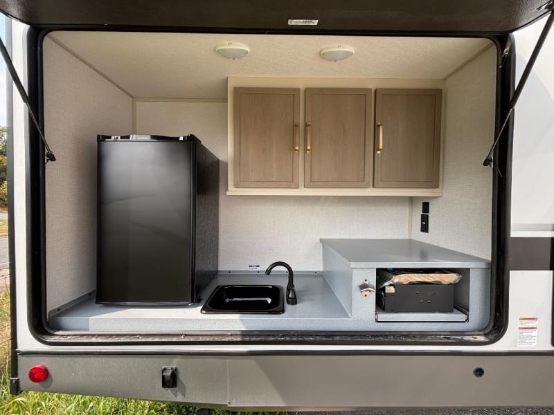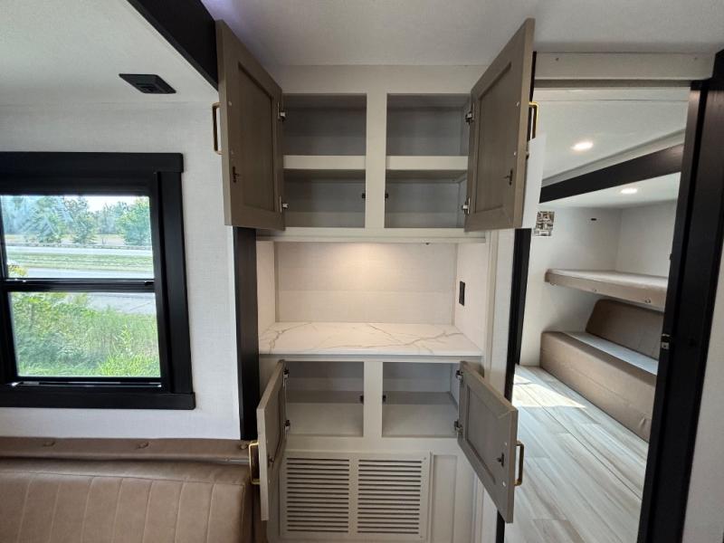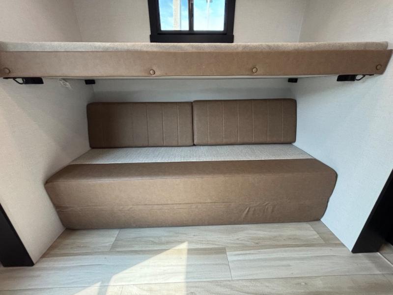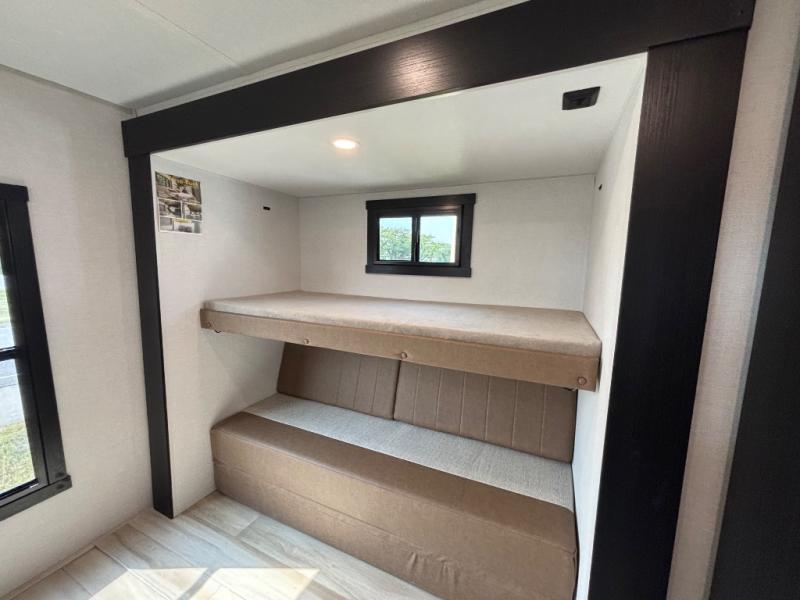 Your kids or friends are ready for a trip in this Wildwood Heritage Glen travel trailer, but are you? As the kiddos or your buddies claim the private bunkhouse for themselves, which includes two bunk beds and a convertible sofa bed, you can escape to your own privacy in the front bedroom with a queen bed and lots of storage. There is even washer/dryer prep for added convenience. The main living area and kitchen might be the next indoor hangout spot thanks to the chef-size walk-in pantry and 12V refrigerator. The cook even has a choice of making meals on the outside kitchen/bar which also includes an LP quick connect nearby. On rainy days, the theatre seats and booth dinette will offer a place to watch TV and play games, and the panoramic windows will always offer beautiful scenery no matter the weather conditions.