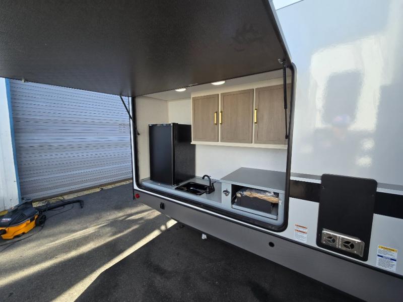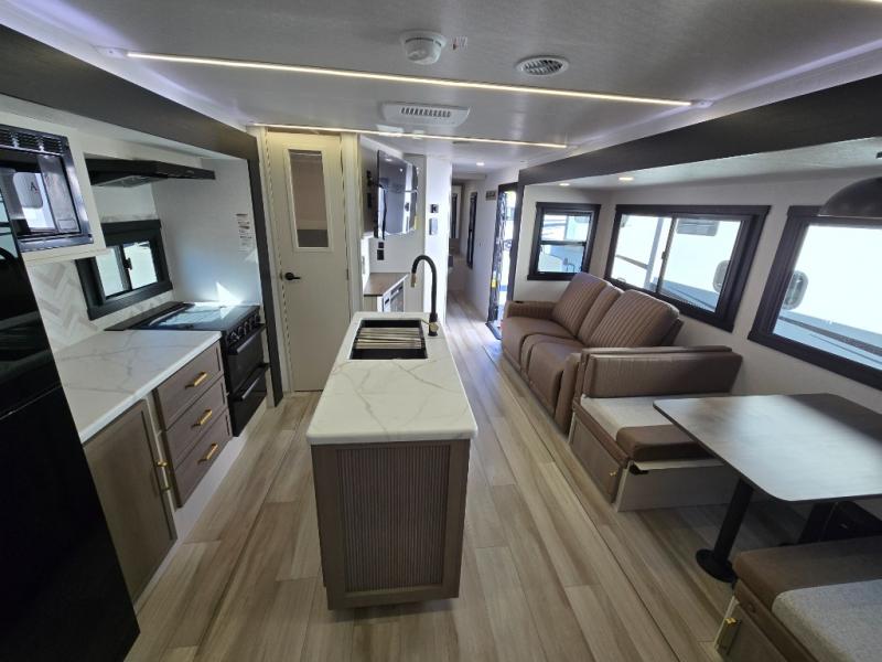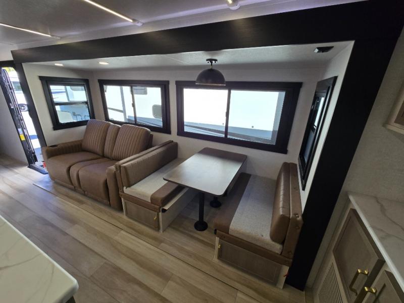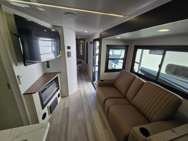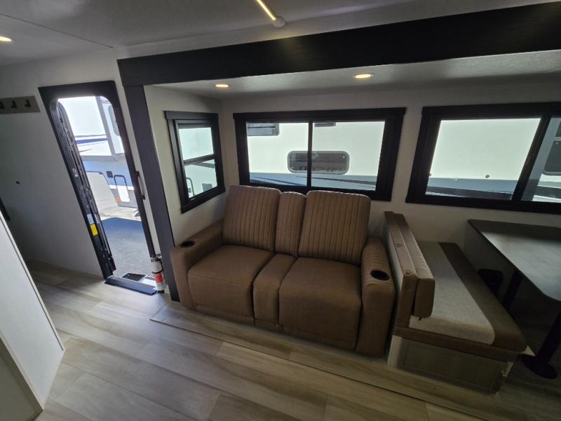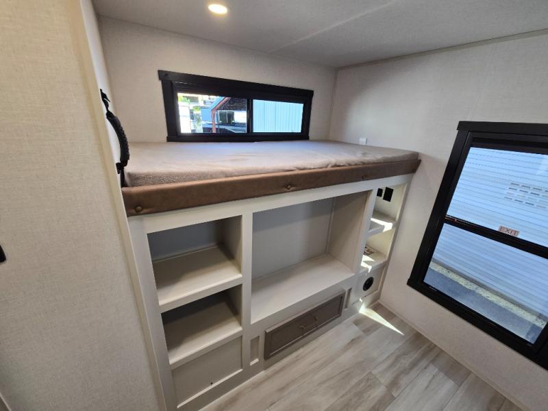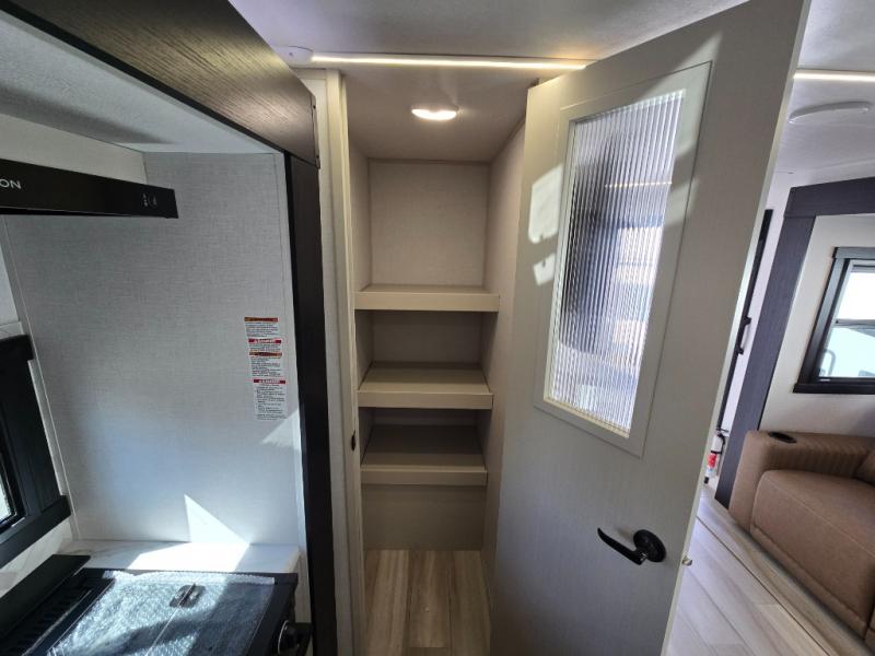Your kids or friends are ready for a trip in this Wildwood Heritage Glen travel trailer, but are you? As the kiddos or your buddies claim the private bunkhouse for themselves, which includes two bunk beds and a convertible sofa bed, you can escape to your own privacy in the front bedroom with a queen bed and lots of storage. There is even washer/dryer prep for added convenience. The main living area and kitchen might be the next indoor hangout spot thanks to the chef-size walk-in pantry and 12V refrigerator. The cook even has a choice of making meals on the outside kitchen/bar which also includes an LP quick connect nearby. On rainy days, the theatre seats and booth dinette will offer a place to watch TV and play games, and the panoramic windows will always offer beautiful scenery no matter the weather conditions.