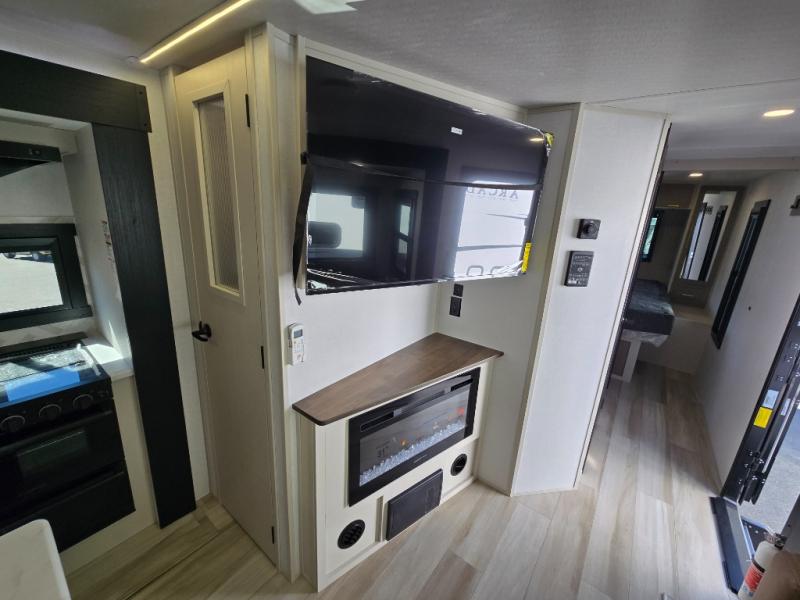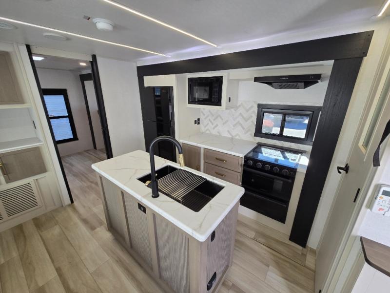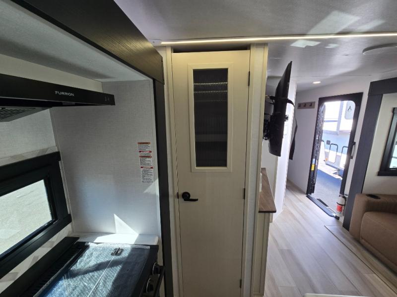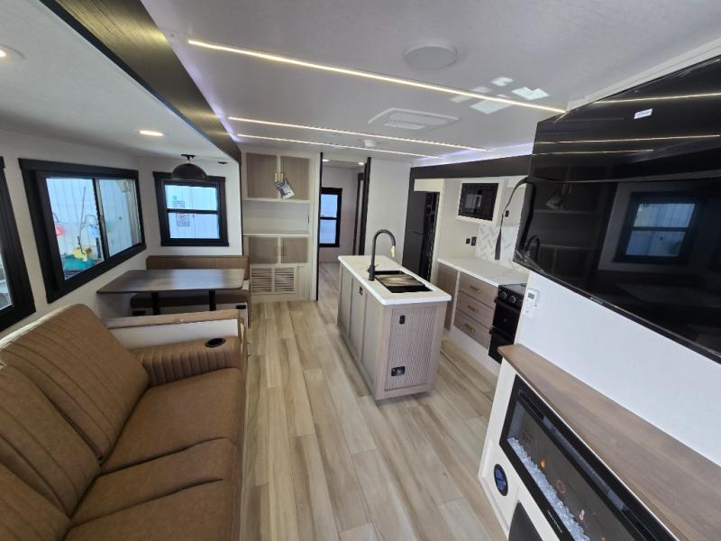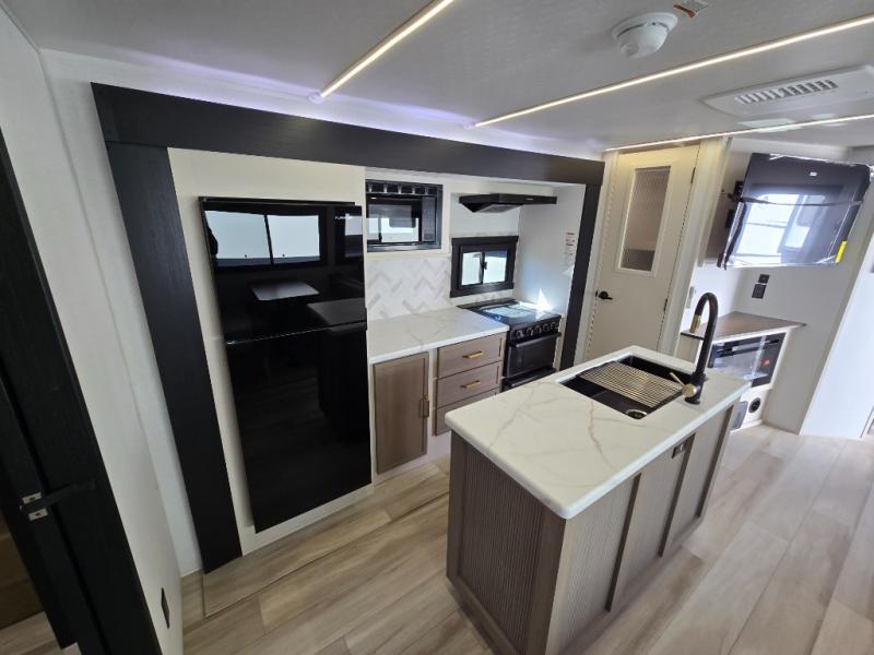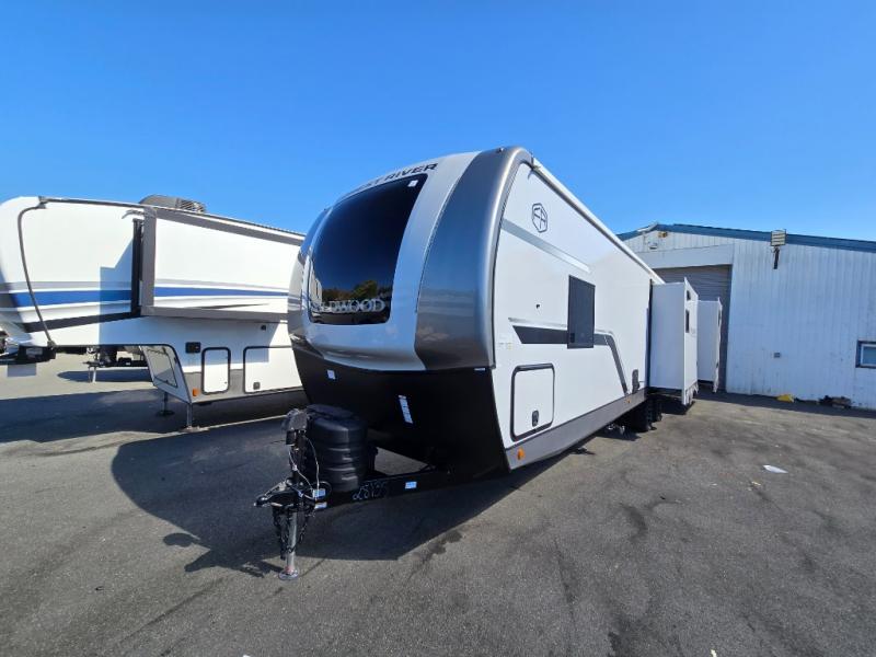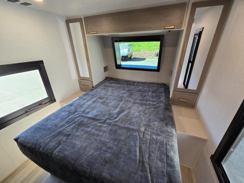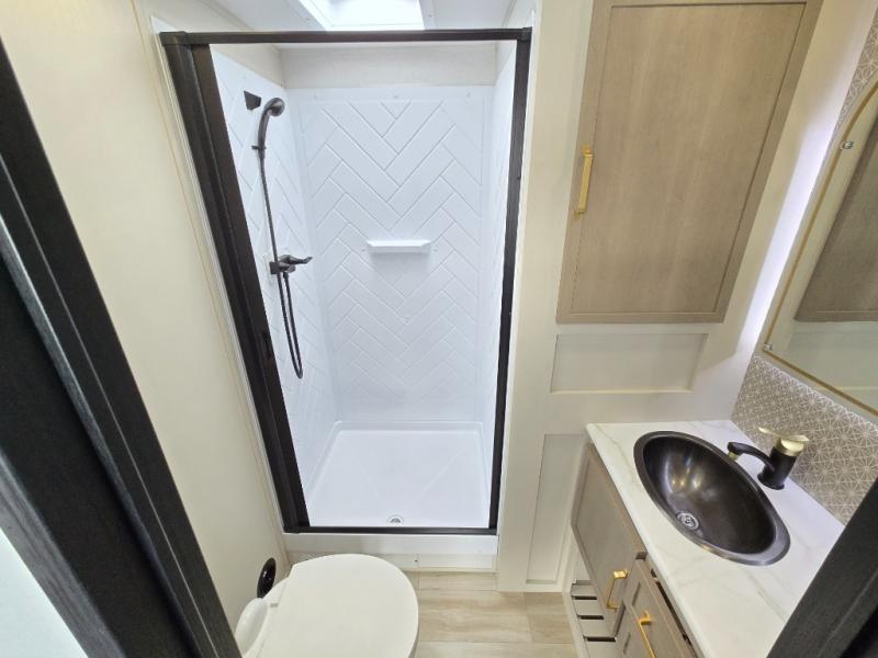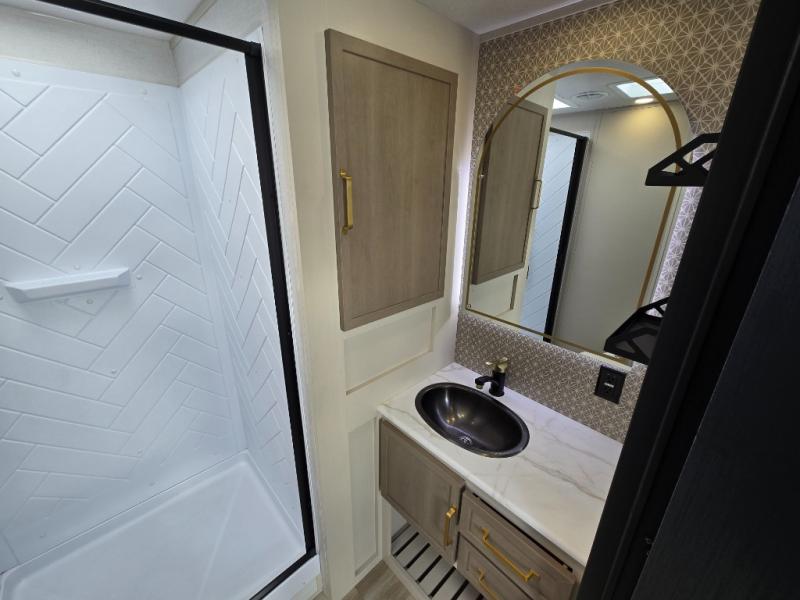 With any Wildwood Heritage Glen travel trailer by Forest River, the quality construction, attention to detail and design along with a bright and welcoming interior allows you to relax in comfort. Each model includes a WeatherShield one piece fiberglass roof, nitrogen-filled radial tires, and an enclosed underbelly with 12V tank heaters on all holding tanks for added protection. You will appreciate the on-demand tankless water heater, along with power stabilizer and tongue jacks, and an extra-large pass-thru storage with slam latch baggage doors. Head inside to enjoy matte gold hardware, wood door casings in place of plastic door casings, and an ultimate interior lighting upgrade with 4k puck/strip lights and a stylish LED back-lit bath mirror!