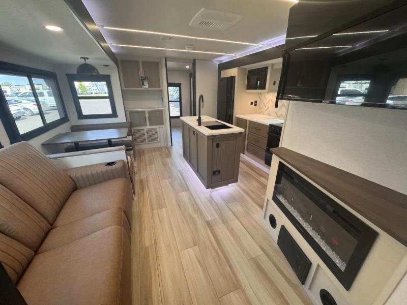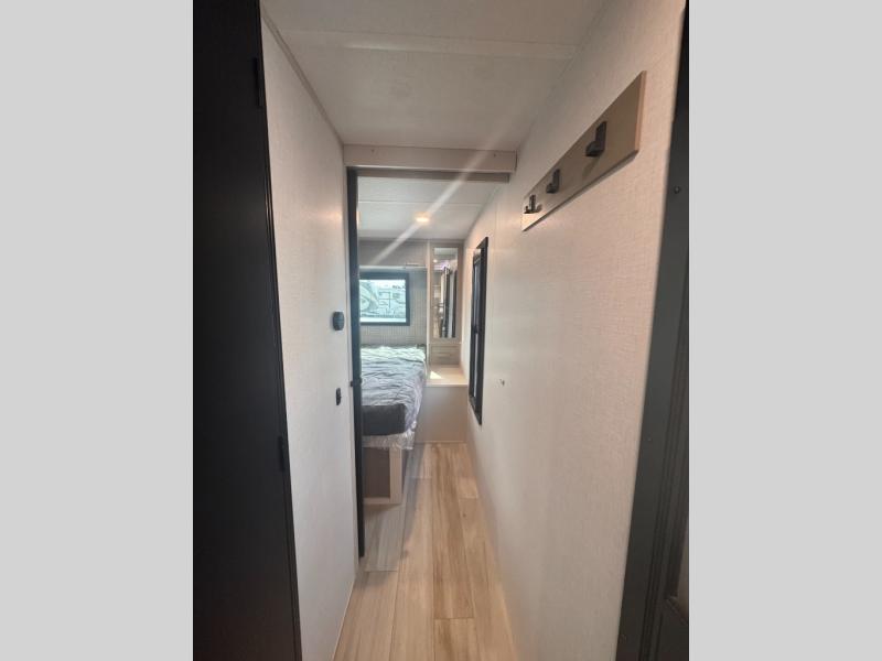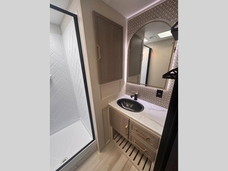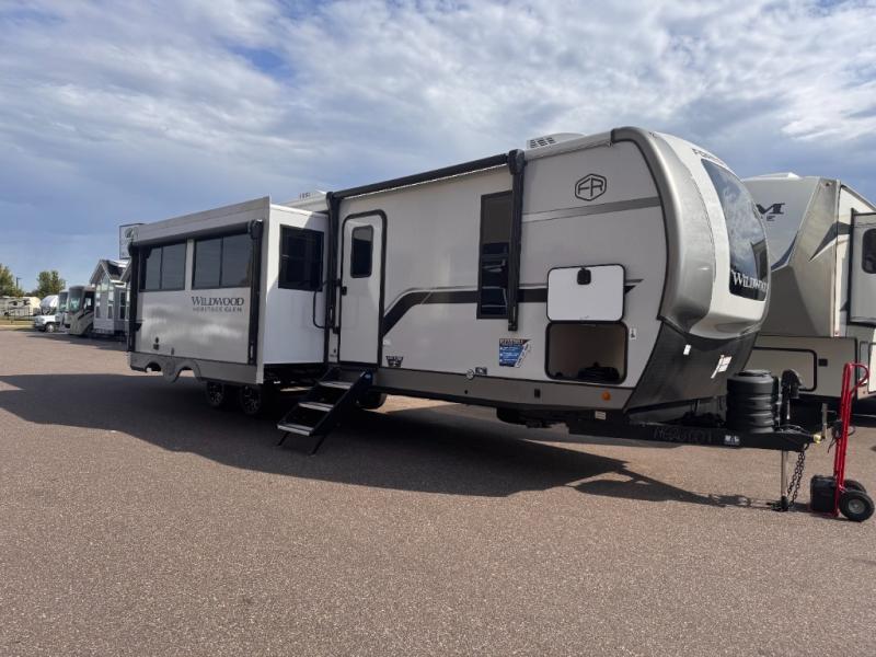 With any Wildwood Heritage Glen travel trailer by Forest River, the quality construction, attention to detail and design along with a bright and welcoming interior allows you to relax in comfort. Each model includes a WeatherShield one piece fiberglass roof, nitrogen-filled radial tires, and an enclosed underbelly with 12V tank heaters on all holding tanks for added protection. You will appreciate the on-demand tankless water heater, along with power stabilizer and tongue jacks, and an extra-large pass-thru storage with slam latch baggage doors. Head inside to enjoy matte gold hardware, wood door casings in place of plastic door casings, and an ultimate interior lighting upgrade with 4k puck/strip lights and a stylish LED back-lit bath mirror!