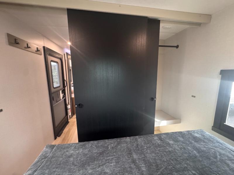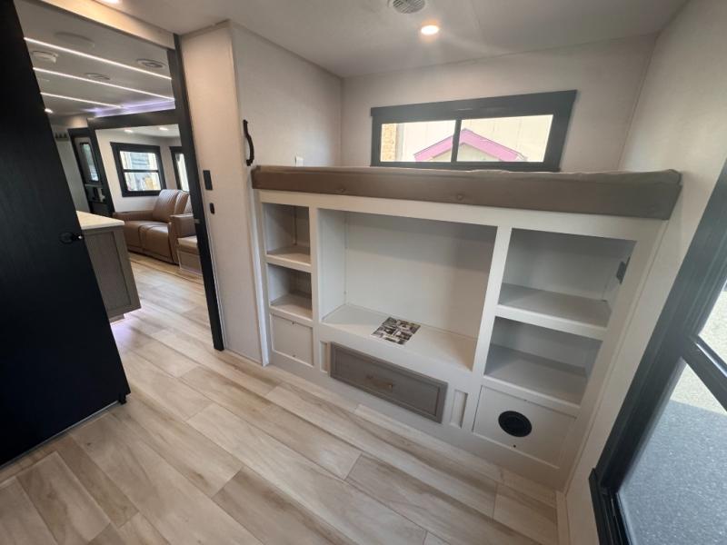 Your kids or friends are ready for a trip in this Wildwood Heritage Glen travel trailer, but are you? As the kiddos or your buddies claim the private bunkhouse for themselves, which includes two bunk beds and a convertible sofa bed, you can escape to your own privacy in the front bedroom with a queen bed and lots of storage. There is even washer/dryer prep for added convenience. The main living area and kitchen might be the next indoor hangout spot thanks to the chef-size walk-in pantry and 12V refrigerator. The cook even has a choice of making meals on the outside kitchen/bar which also includes an LP quick connect nearby. On rainy days, the theatre seats and booth dinette will offer a place to watch TV and play games, and the panoramic windows will always offer beautiful scenery no matter the weather conditions.