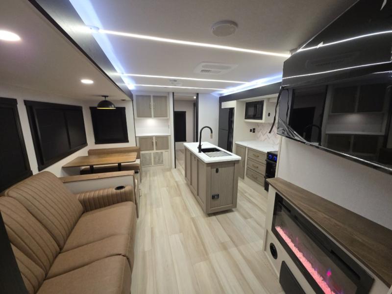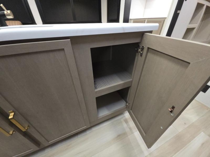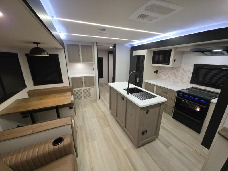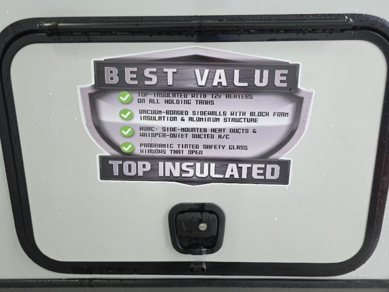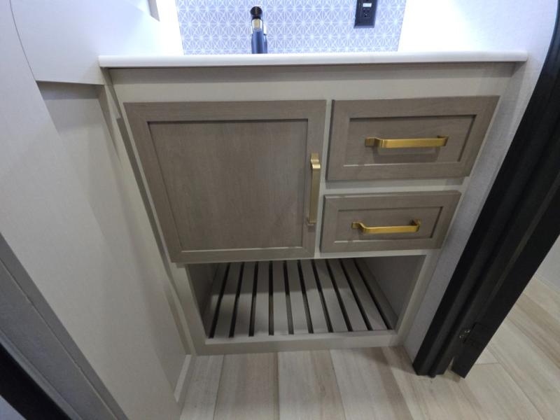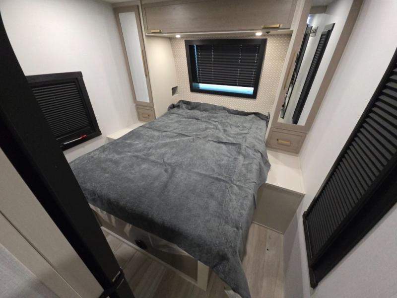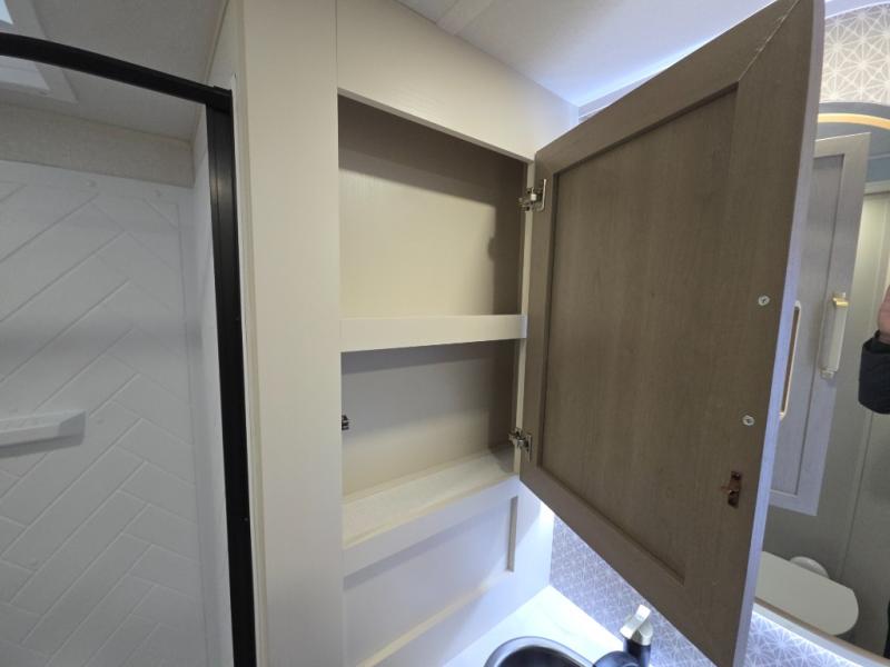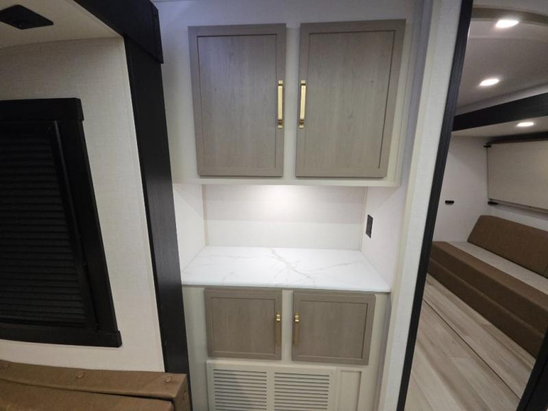With any Wildwood Heritage Glen travel trailer by Forest River, the quality construction, attention to detail and design along with a bright and welcoming interior allows you to relax in comfort. Each model includes a WeatherShield one piece fiberglass roof, nitrogen-filled radial tires, and an enclosed underbelly with 12V tank heaters on all holding tanks for added protection. You will appreciate the on-demand tankless water heater, along with power stabilizer and tongue jacks, and an extra-large pass-thru storage with slam latch baggage doors. Head inside to enjoy matte gold hardware, wood door casings in place of plastic door casings, and an ultimate interior lighting upgrade with 4k puck/strip lights and a stylish LED back-lit bath mirror!