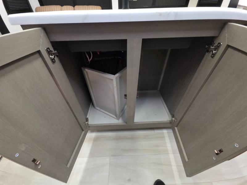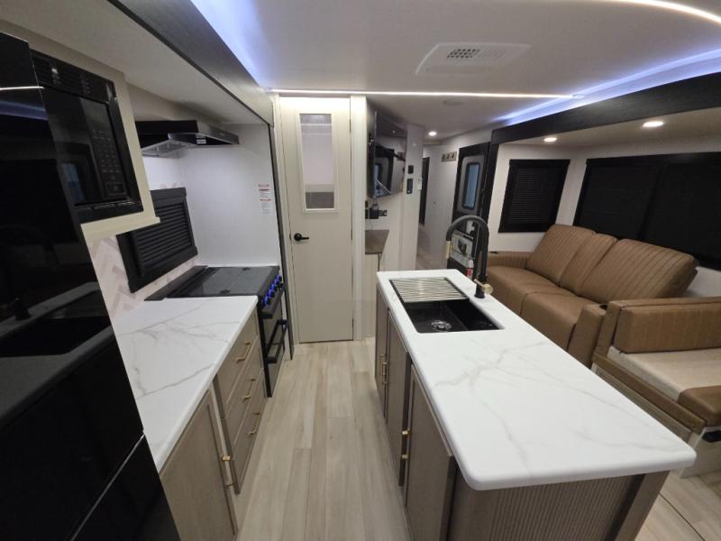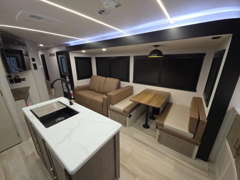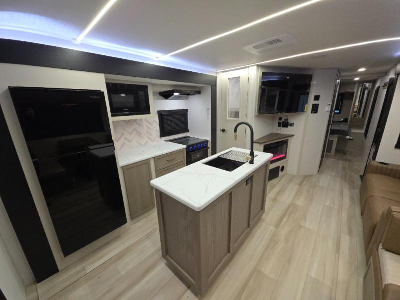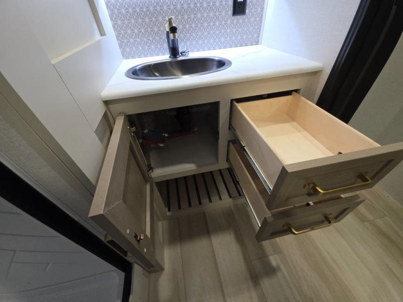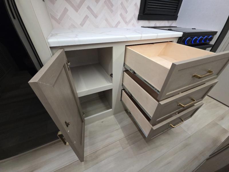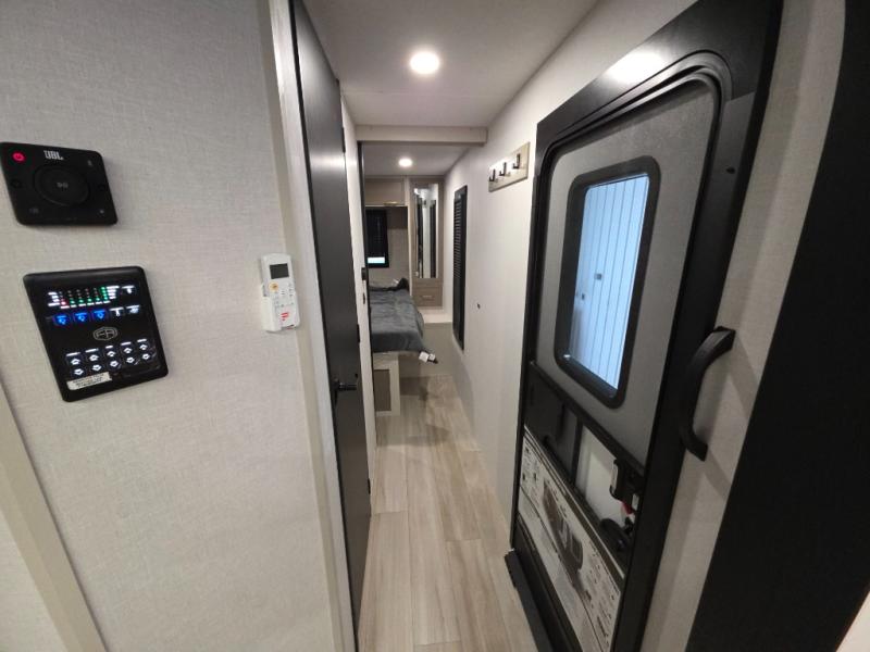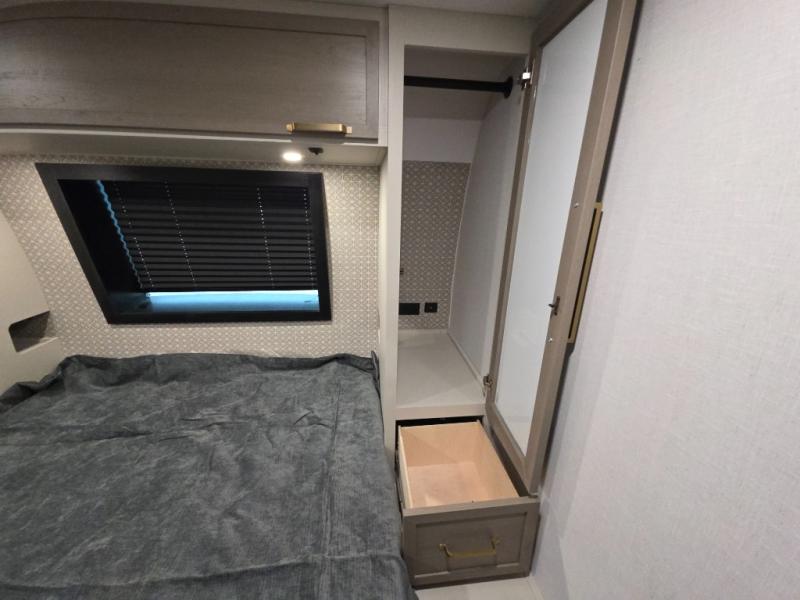 With any Wildwood Heritage Glen travel trailer by Forest River, the quality construction, attention to detail and design along with a bright and welcoming interior allows you to relax in comfort. Each model includes a WeatherShield one piece fiberglass roof, nitrogen-filled radial tires, and an enclosed underbelly with 12V tank heaters on all holding tanks for added protection. You will appreciate the on-demand tankless water heater, along with power stabilizer and tongue jacks, and an extra-large pass-thru storage with slam latch baggage doors. Head inside to enjoy matte gold hardware, wood door casings in place of plastic door casings, and an ultimate interior lighting upgrade with 4k puck/strip lights and a stylish LED back-lit bath mirror!