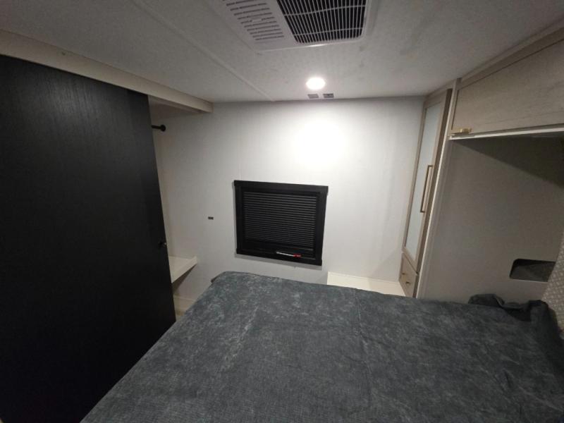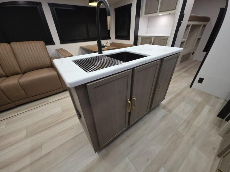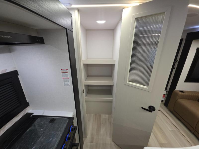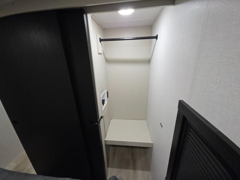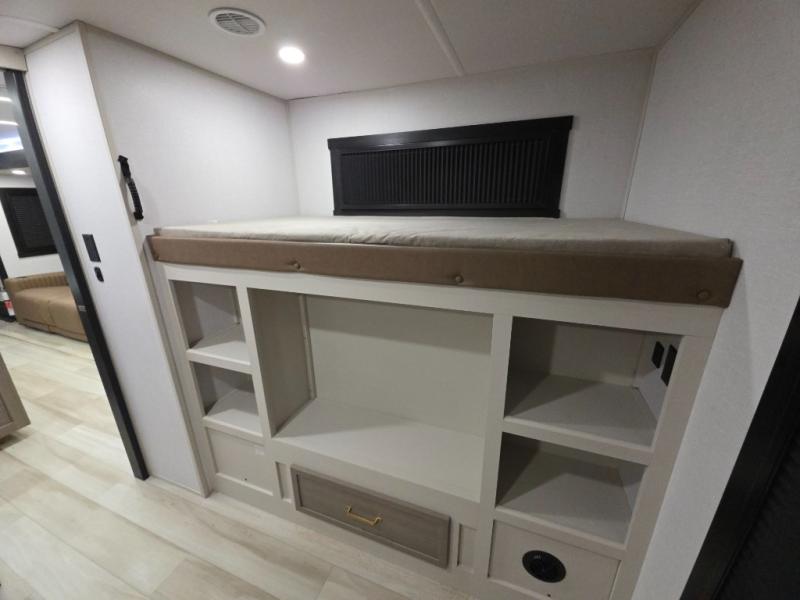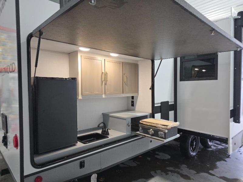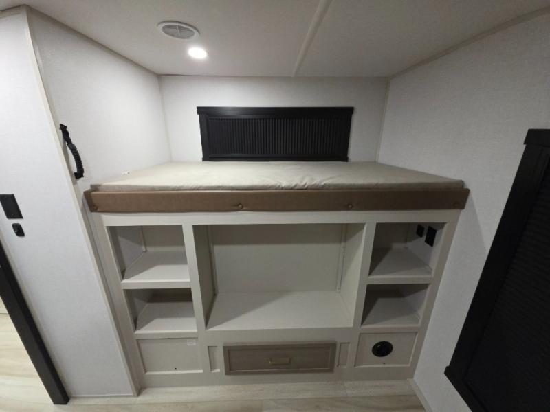 Your kids or friends are ready for a trip in this Wildwood Heritage Glen travel trailer, but are you? As the kiddos or your buddies claim the private bunkhouse for themselves, which includes two bunk beds and a convertible sofa bed, you can escape to your own privacy in the front bedroom with a queen bed and lots of storage. There is even washer/dryer prep for added convenience. The main living area and kitchen might be the next indoor hangout spot thanks to the chef-size walk-in pantry and 12V refrigerator. The cook even has a choice of making meals on the outside kitchen/bar which also includes an LP quick connect nearby. On rainy days, the theatre seats and booth dinette will offer a place to watch TV and play games, and the panoramic windows will always offer beautiful scenery no matter the weather conditions.