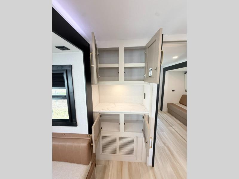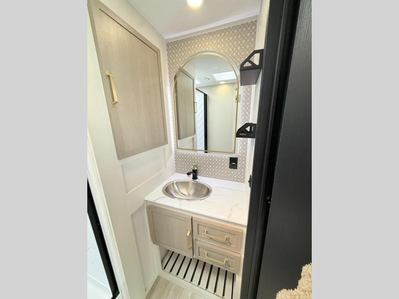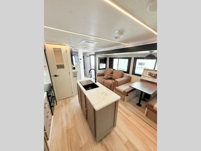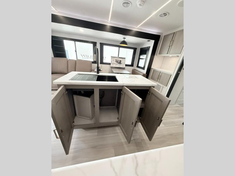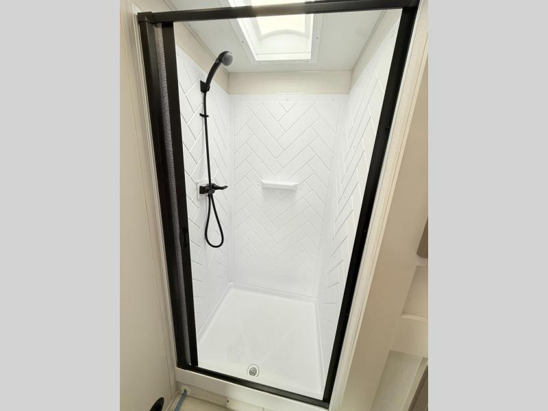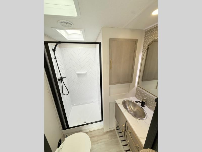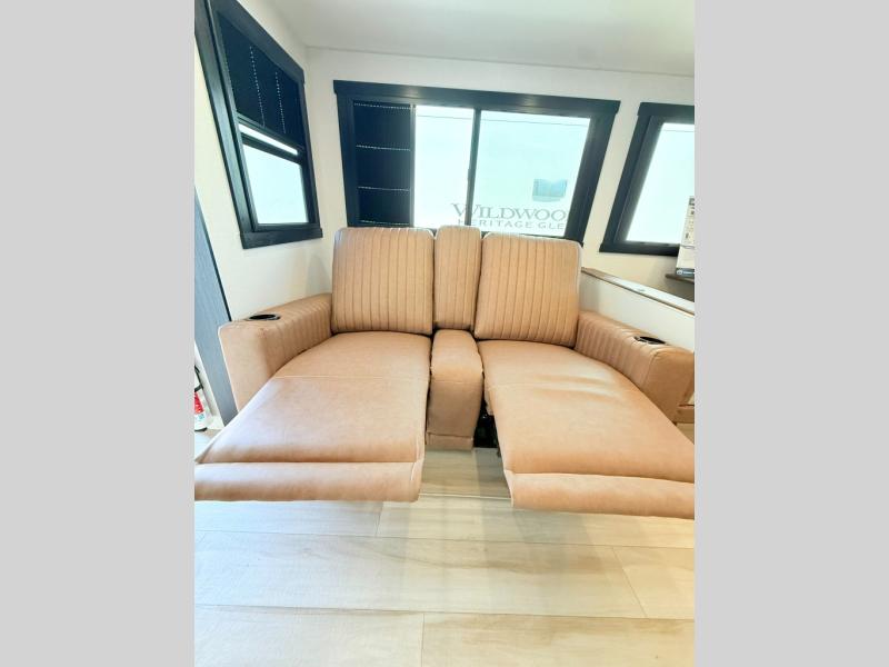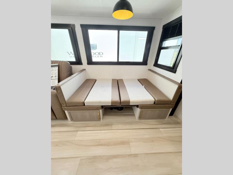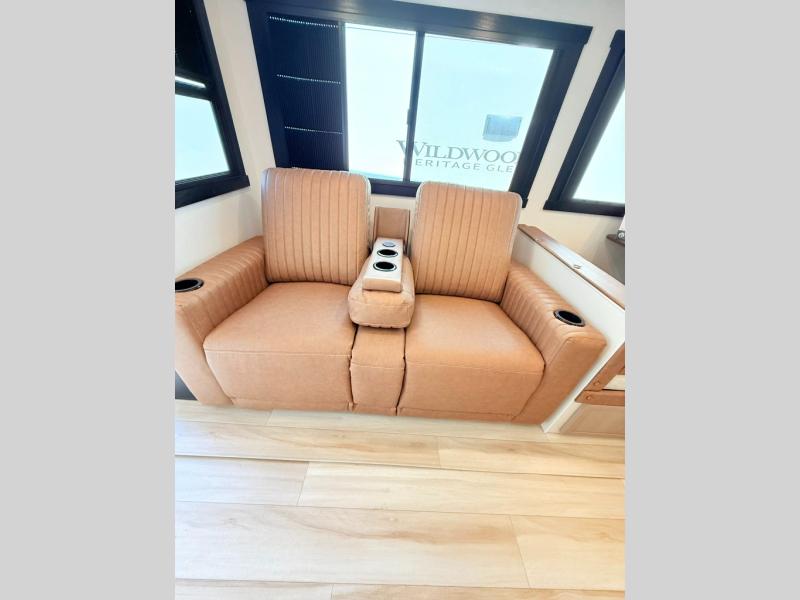 With any Wildwood Heritage Glen travel trailer by Forest River, the quality construction, attention to detail and design along with a bright and welcoming interior allows you to relax in comfort. Each model includes a WeatherShield one piece fiberglass roof, nitrogen-filled radial tires, and an enclosed underbelly with 12V tank heaters on all holding tanks for added protection. You will appreciate the on-demand tankless water heater, along with power stabilizer and tongue jacks, and an extra-large pass-thru storage with slam latch baggage doors. Head inside to enjoy matte gold hardware, wood door casings in place of plastic door casings, and an ultimate interior lighting upgrade with 4k puck/strip lights and a stylish LED back-lit bath mirror!