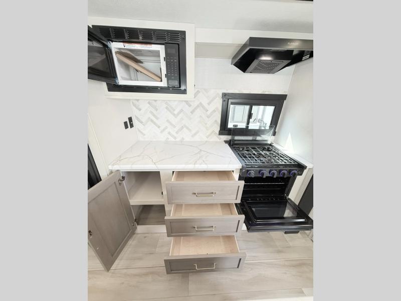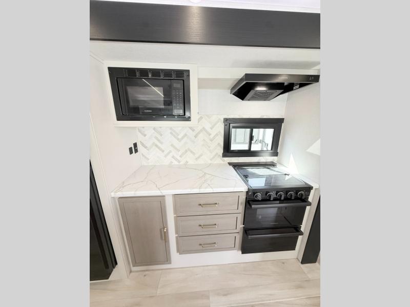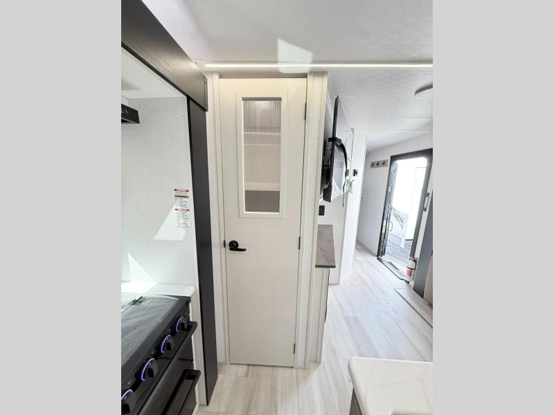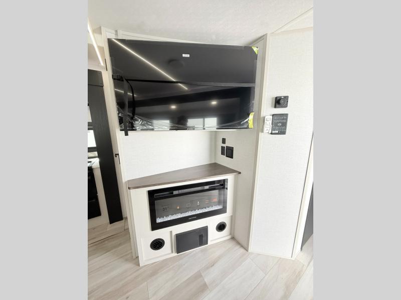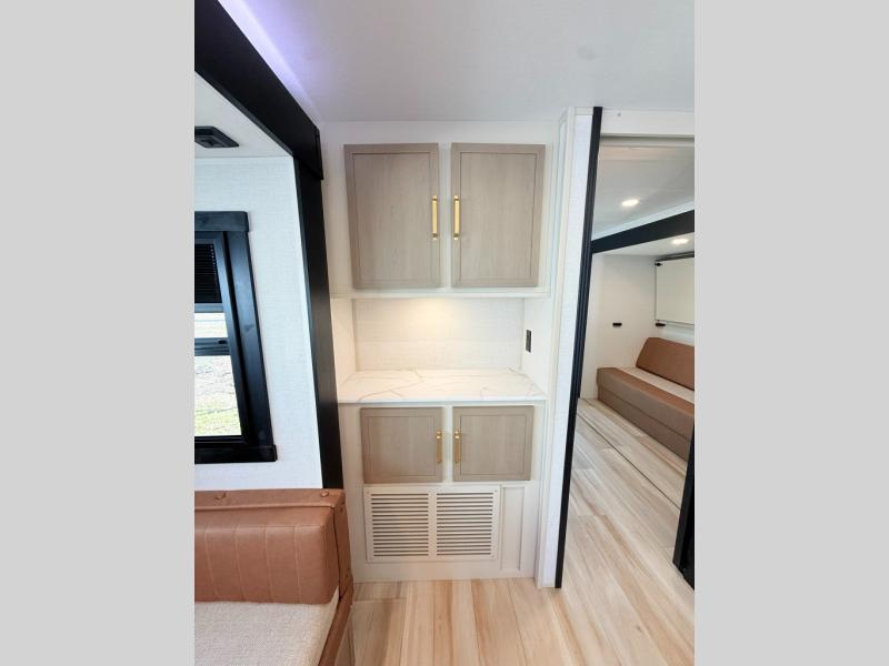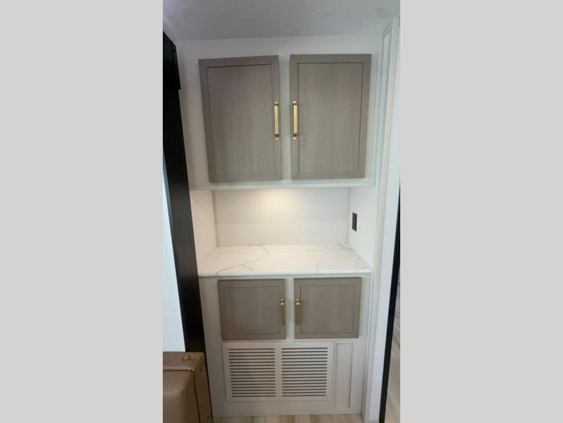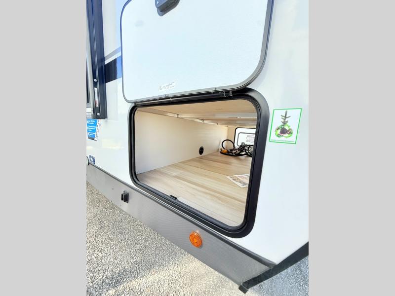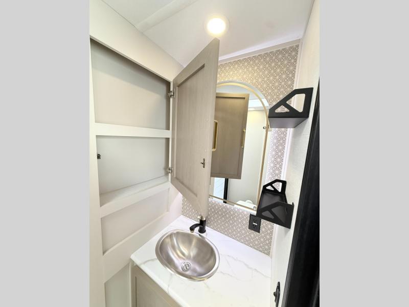 With any Wildwood Heritage Glen travel trailer by Forest River, the quality construction, attention to detail and design along with a bright and welcoming interior allows you to relax in comfort. Each model includes a WeatherShield one piece fiberglass roof, nitrogen-filled radial tires, and an enclosed underbelly with 12V tank heaters on all holding tanks for added protection. You will appreciate the on-demand tankless water heater, along with power stabilizer and tongue jacks, and an extra-large pass-thru storage with slam latch baggage doors. Head inside to enjoy matte gold hardware, wood door casings in place of plastic door casings, and an ultimate interior lighting upgrade with 4k puck/strip lights and a stylish LED back-lit bath mirror!
