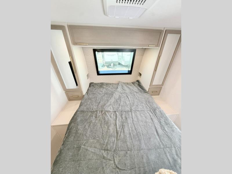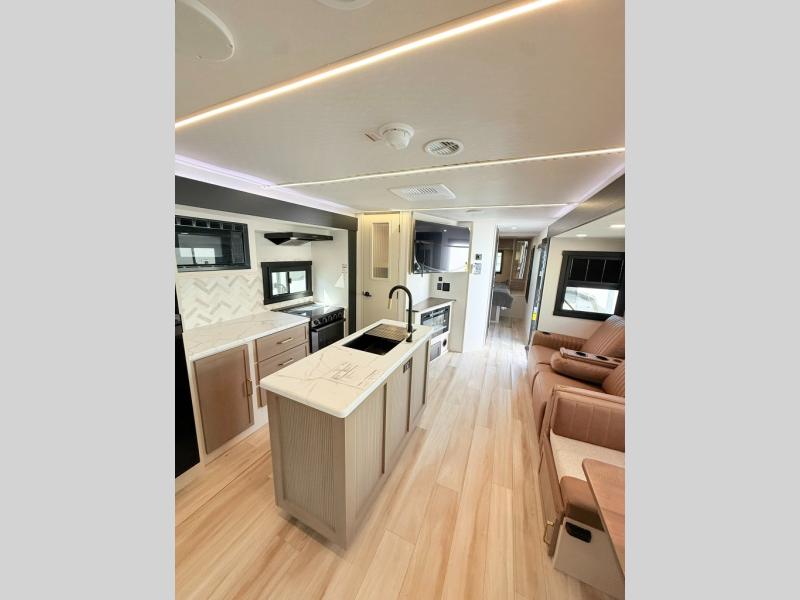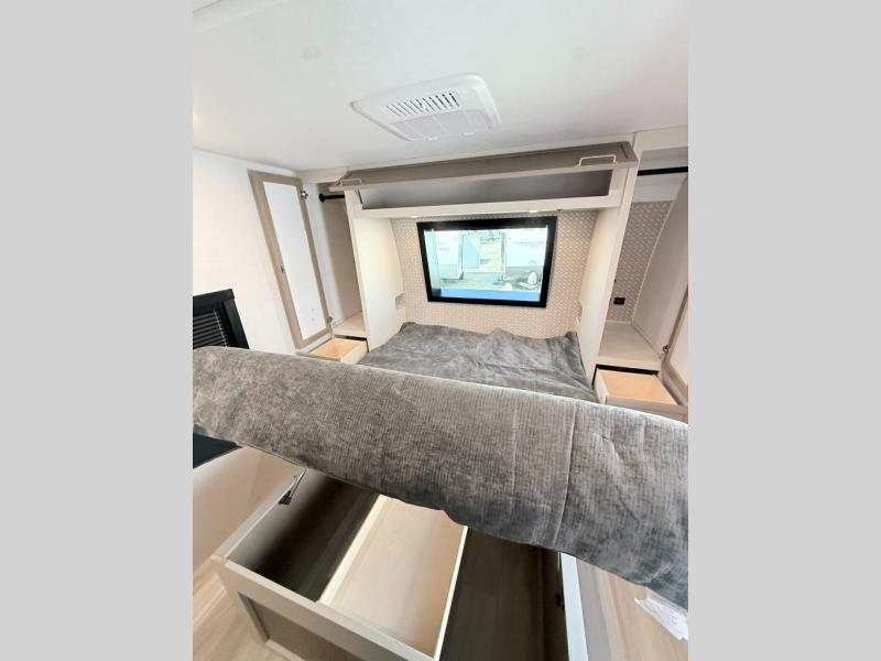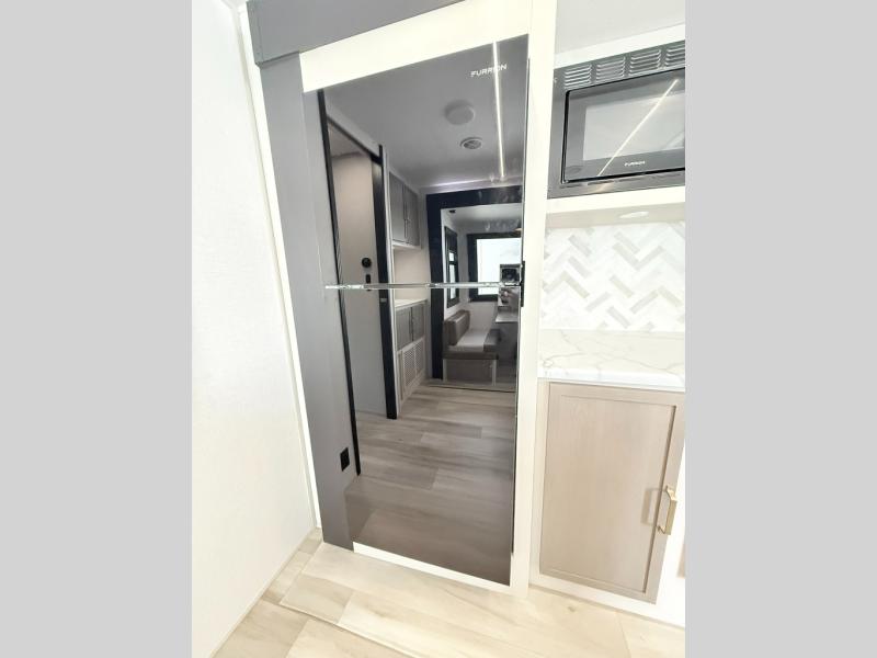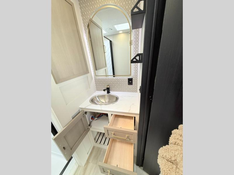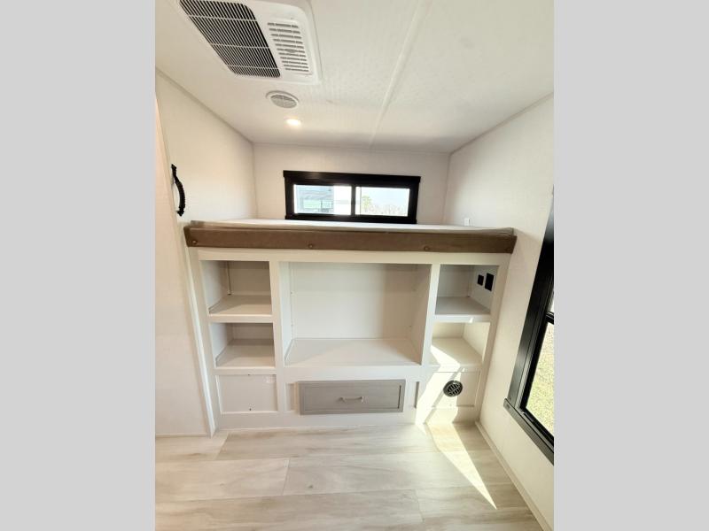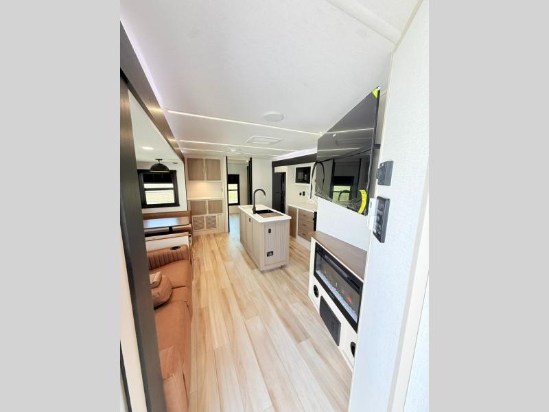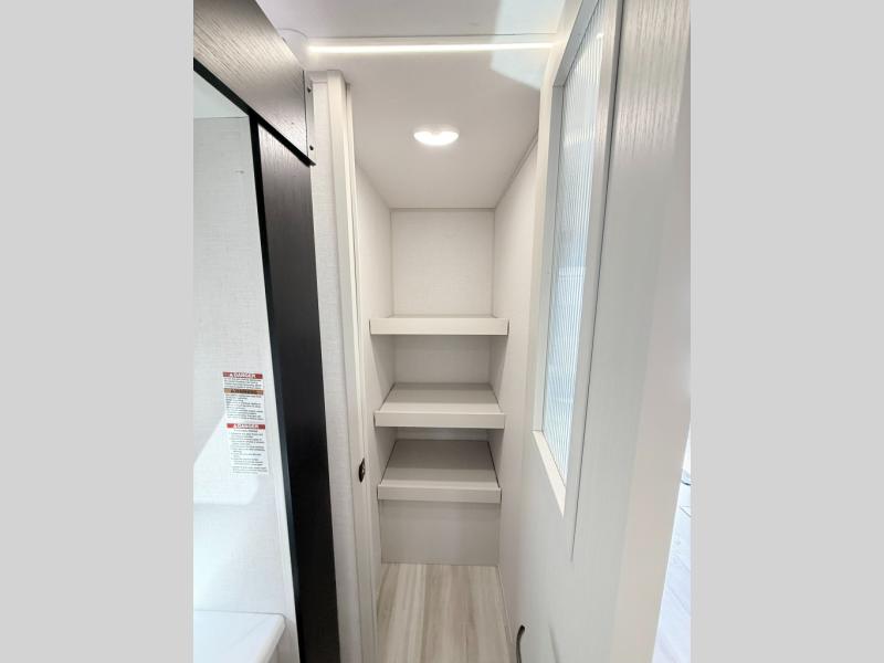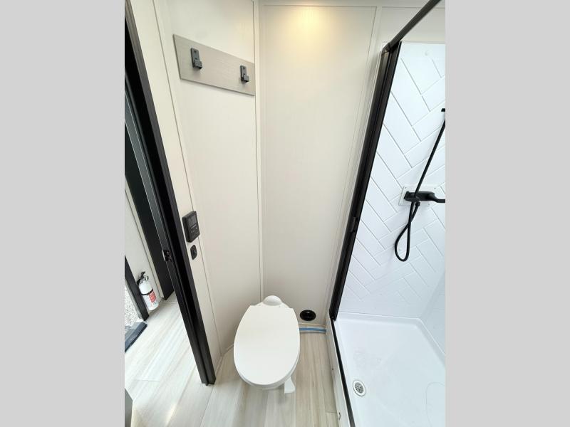 With any Wildwood Heritage Glen travel trailer by Forest River, the quality construction, attention to detail and design along with a bright and welcoming interior allows you to relax in comfort. Each model includes a WeatherShield one piece fiberglass roof, nitrogen-filled radial tires, and an enclosed underbelly with 12V tank heaters on all holding tanks for added protection. You will appreciate the on-demand tankless water heater, along with power stabilizer and tongue jacks, and an extra-large pass-thru storage with slam latch baggage doors. Head inside to enjoy matte gold hardware, wood door casings in place of plastic door casings, and an ultimate interior lighting upgrade with 4k puck/strip lights and a stylish LED back-lit bath mirror!