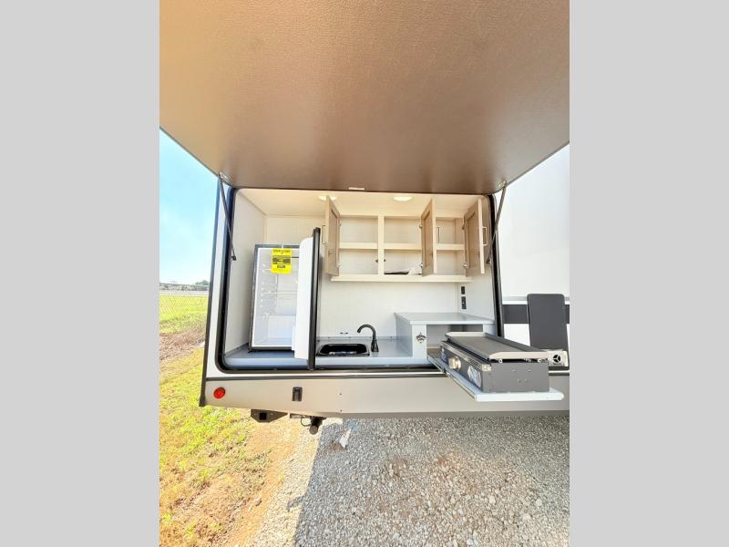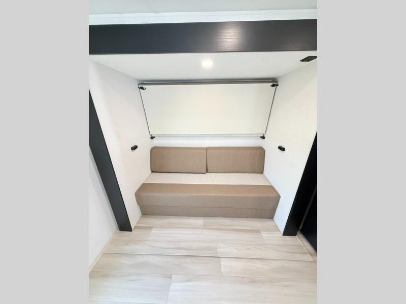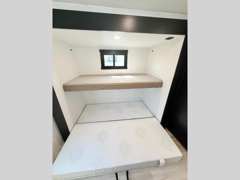 Your kids or friends are ready for a trip in this Wildwood Heritage Glen travel trailer, but are you? As the kiddos or your buddies claim the private bunkhouse for themselves, which includes two bunk beds and a convertible sofa bed, you can escape to your own privacy in the front bedroom with a queen bed and lots of storage. There is even washer/dryer prep for added convenience. The main living area and kitchen might be the next indoor hangout spot thanks to the chef-size walk-in pantry and 12V refrigerator. The cook even has a choice of making meals on the outside kitchen/bar which also includes an LP quick connect nearby. On rainy days, the theatre seats and booth dinette will offer a place to watch TV and play games, and the panoramic windows will always offer beautiful scenery no matter the weather conditions.