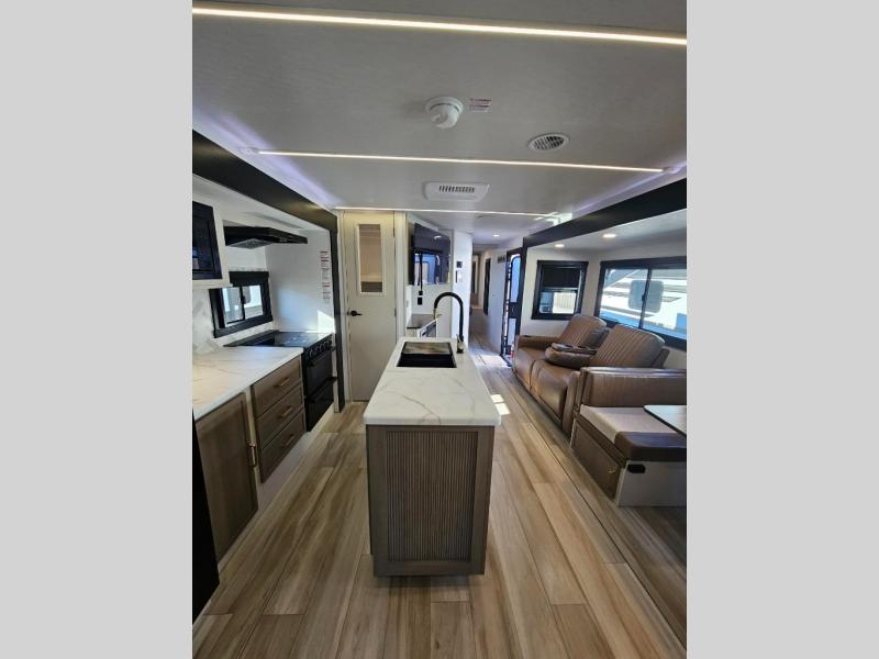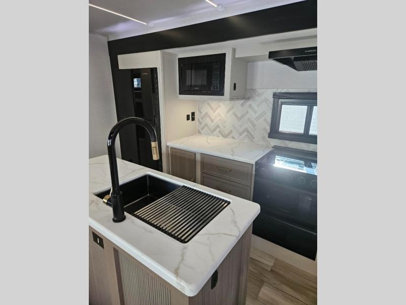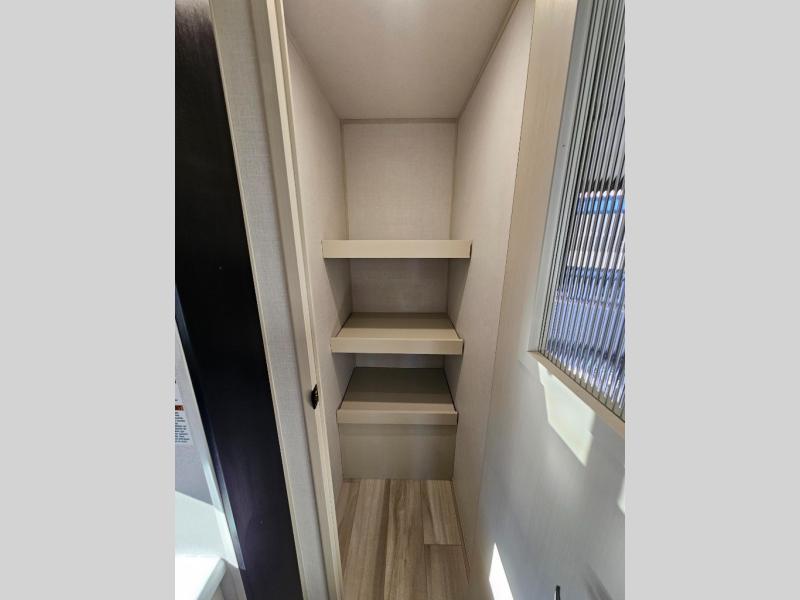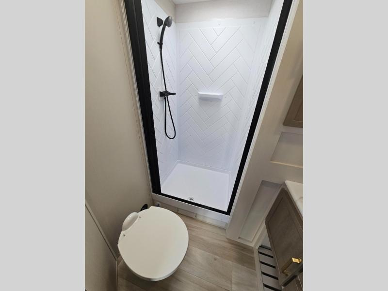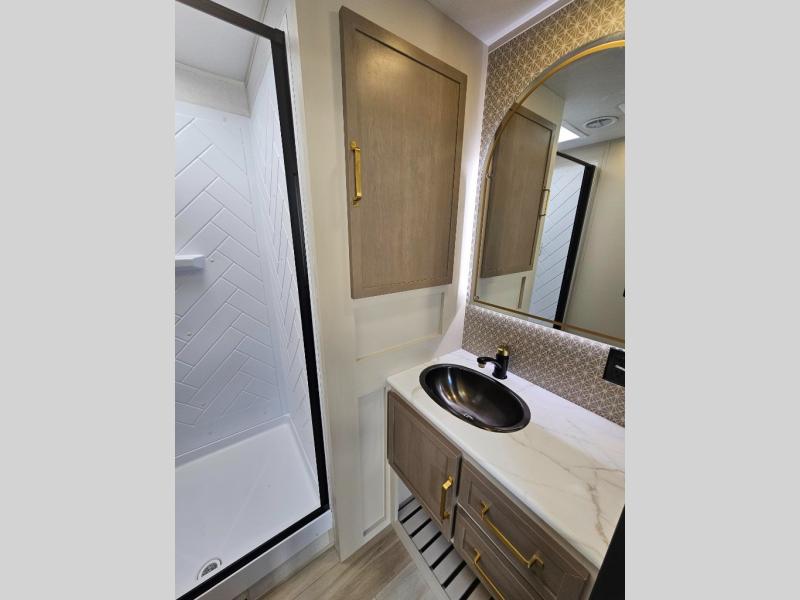 With any Wildwood Heritage Glen travel trailer by Forest River, the quality construction, attention to detail and design along with a bright and welcoming interior allows you to relax in comfort. Each model includes a WeatherShield one piece fiberglass roof, nitrogen-filled radial tires, and an enclosed underbelly with 12V tank heaters on all holding tanks for added protection. You will appreciate the on-demand tankless water heater, along with power stabilizer and tongue jacks, and an extra-large pass-thru storage with slam latch baggage doors. Head inside to enjoy matte gold hardware, wood door casings in place of plastic door casings, and an ultimate interior lighting upgrade with 4k puck/strip lights and a stylish LED back-lit bath mirror!