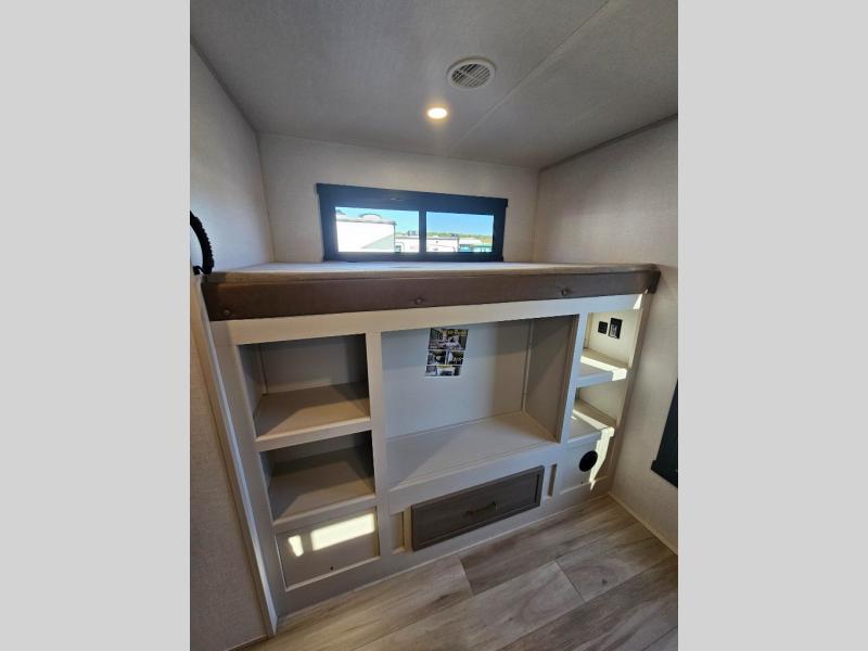 Your kids or friends are ready for a trip in this Wildwood Heritage Glen travel trailer, but are you? As the kiddos or your buddies claim the private bunkhouse for themselves, which includes two bunk beds and a convertible sofa bed, you can escape to your own privacy in the front bedroom with a queen bed and lots of storage. There is even washer/dryer prep for added convenience. The main living area and kitchen might be the next indoor hangout spot thanks to the chef-size walk-in pantry and 12V refrigerator. The cook even has a choice of making meals on the outside kitchen/bar which also includes an LP quick connect nearby. On rainy days, the theatre seats and booth dinette will offer a place to watch TV and play games, and the panoramic windows will always offer beautiful scenery no matter the weather conditions.
