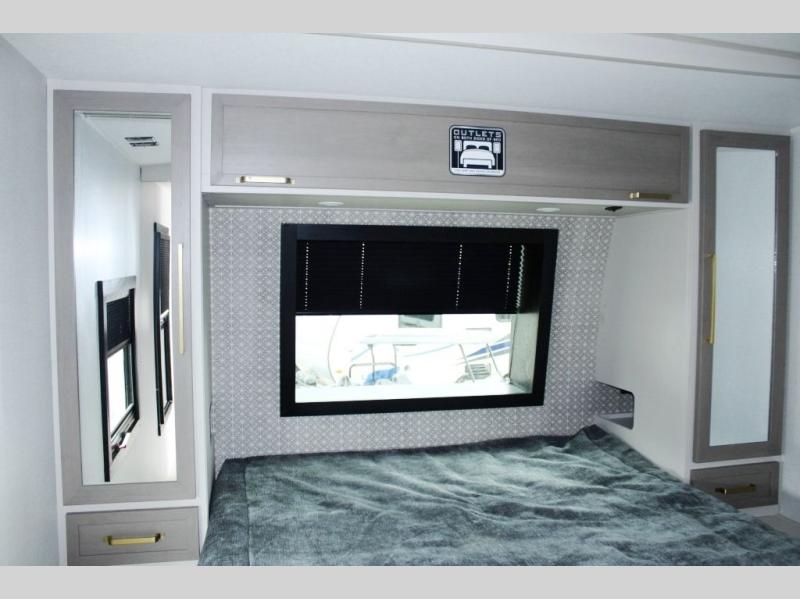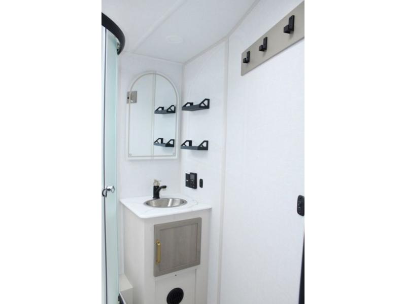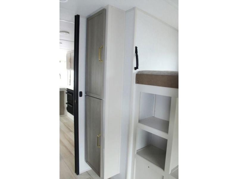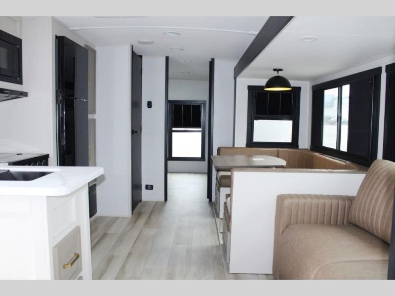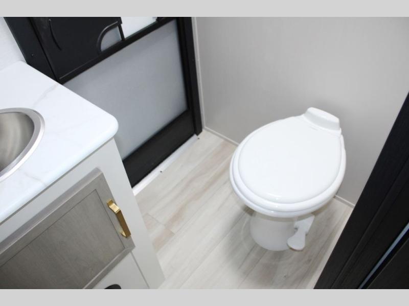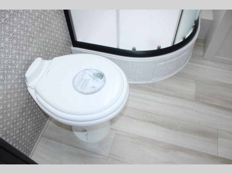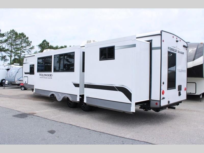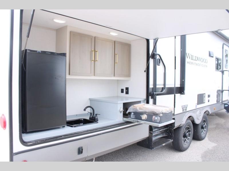 With any Wildwood Heritage Glen travel trailer by Forest River, the quality construction, attention to detail and design along with a bright and welcoming interior allows you to relax in comfort. Each model includes a WeatherShield one piece fiberglass roof, nitrogen-filled radial tires, and an enclosed underbelly with 12V tank heaters on all holding tanks for added protection. You will appreciate the on-demand tankless water heater, along with power stabilizer and tongue jacks, and an extra-large pass-thru storage with slam latch baggage doors. Head inside to enjoy matte gold hardware, wood door casings in place of plastic door casings, and an ultimate interior lighting upgrade with 4k puck/strip lights and a stylish LED back-lit bath mirror!