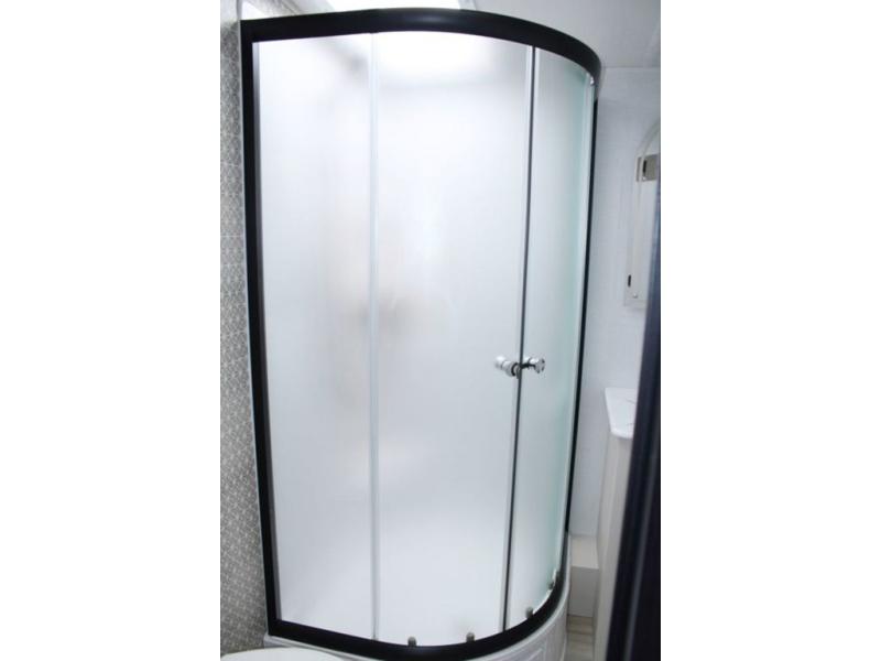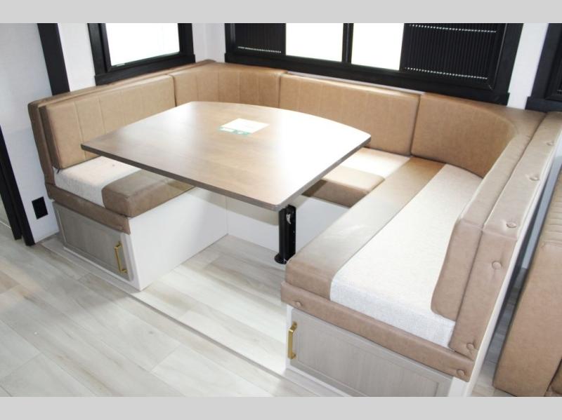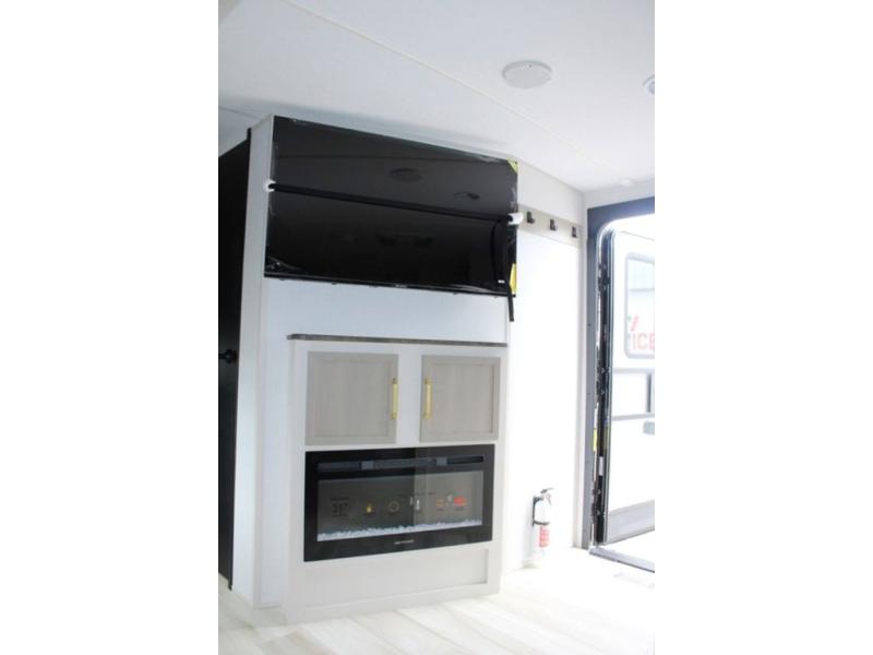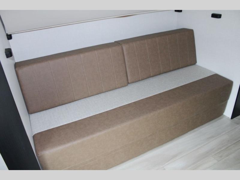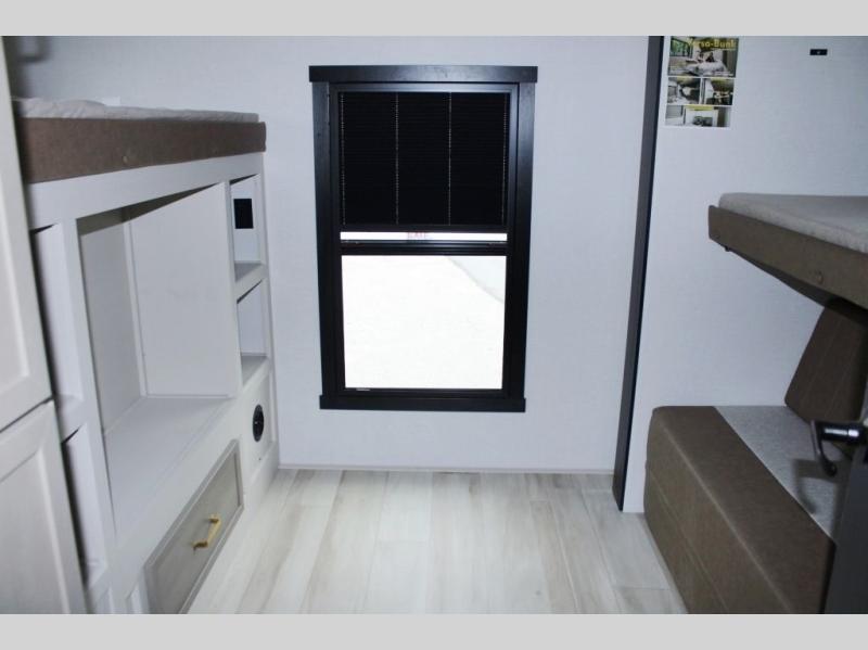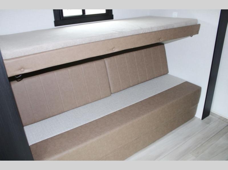 Get ready for some fun in this trailer that sleeps nine to ten happy campers! Everyone will be comfortable having access to a full bathroom near the front master bedroom and a half bath near the rear private bunkhouse, plus there are two entry doors into the trailer. The kids or your friends will get to choose from two 38" x 74" bunk beds and a convertible sofa bed, and the slide out in the bunkhouse offers more floor space to play games and such. The cook will have the choice of making meals on the outside kitchen/bar or inside with full amenities including a 12V refrigerator. Inside the main living area, everyone can watch TV, play games at the family size U-shaped dinette, and enjoy the views out of the panoramic windows. And don't overlook the front private bedroom with a queen bed with dual wardrobes, where you can store clothing and essentials.