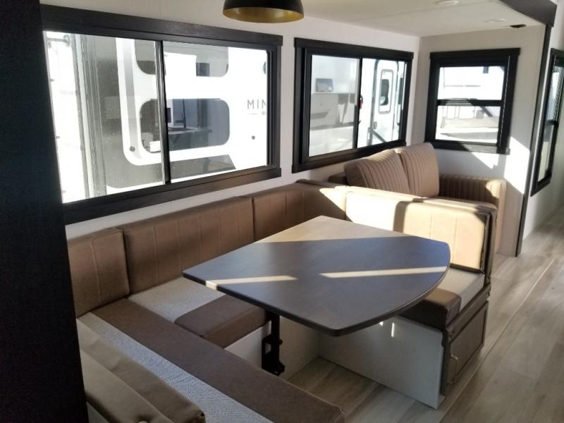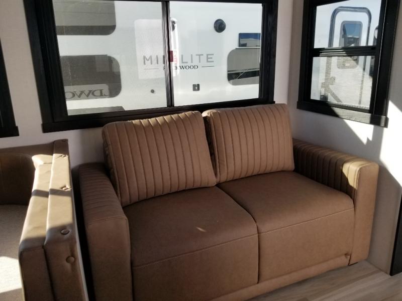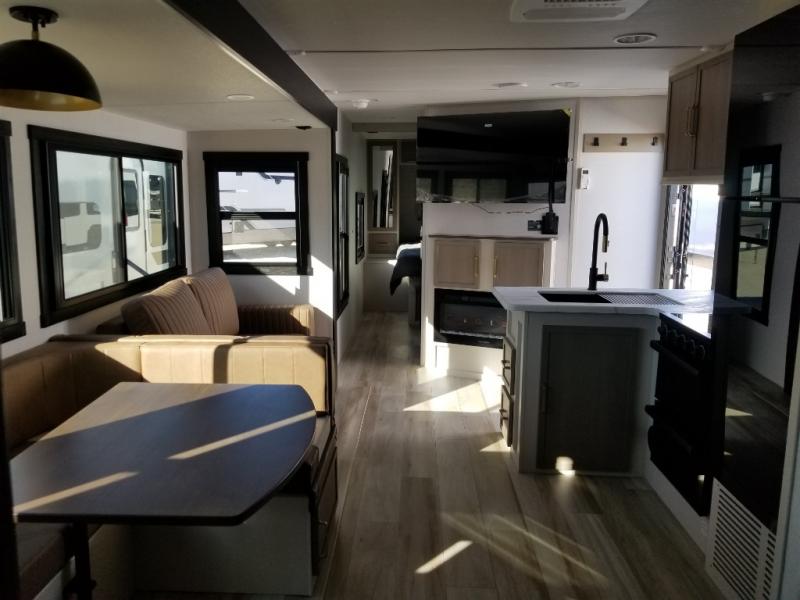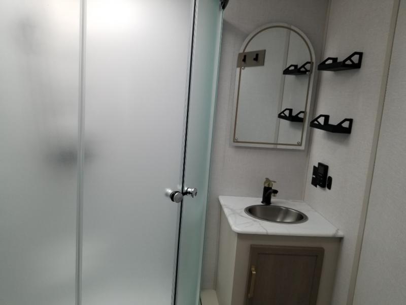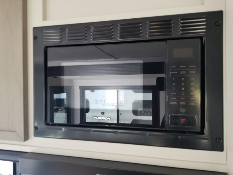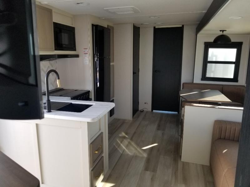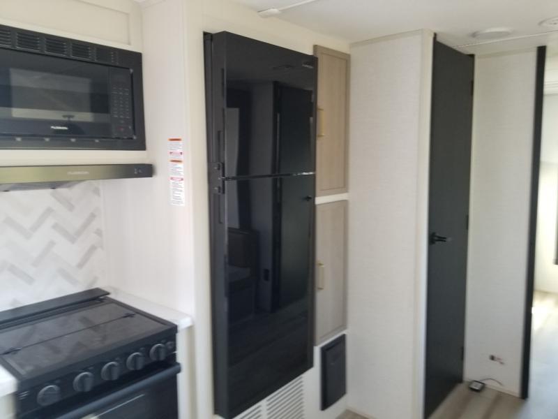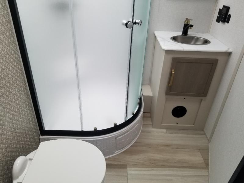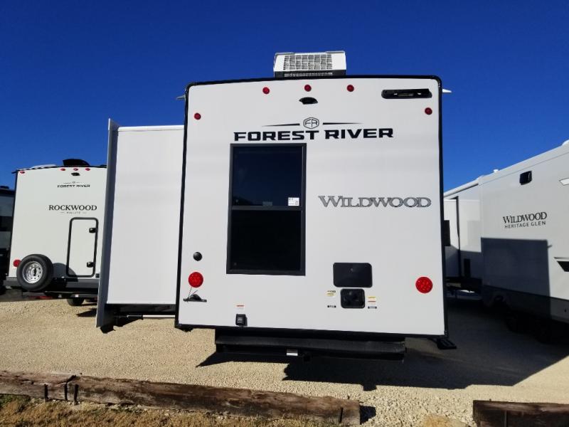 With any Wildwood Heritage Glen travel trailer by Forest River, the quality construction, attention to detail and design along with a bright and welcoming interior allows you to relax in comfort. Each model includes a WeatherShield one piece fiberglass roof, nitrogen-filled radial tires, and an enclosed underbelly with 12V tank heaters on all holding tanks for added protection. You will appreciate the on-demand tankless water heater, along with power stabilizer and tongue jacks, and an extra-large pass-thru storage with slam latch baggage doors. Head inside to enjoy matte gold hardware, wood door casings in place of plastic door casings, and an ultimate interior lighting upgrade with 4k puck/strip lights and a stylish LED back-lit bath mirror!
