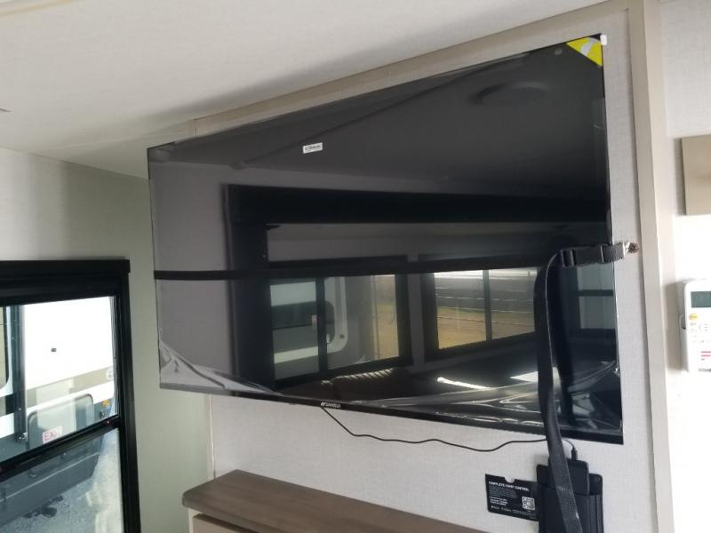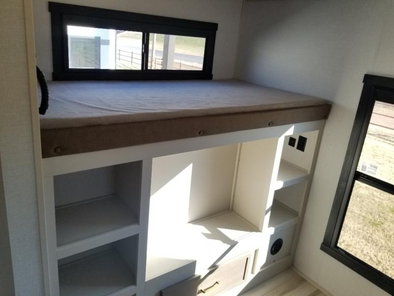 Get ready for some fun in this trailer that sleeps nine to ten happy campers! Everyone will be comfortable having access to a full bathroom near the front master bedroom and a half bath near the rear private bunkhouse, plus there are two entry doors into the trailer. The kids or your friends will get to choose from two 38" x 74" bunk beds and a convertible sofa bed, and the slide out in the bunkhouse offers more floor space to play games and such. The cook will have the choice of making meals on the outside kitchen/bar or inside with full amenities including a 12V refrigerator. Inside the main living area, everyone can watch TV, play games at the family size U-shaped dinette, and enjoy the views out of the panoramic windows. And don't overlook the front private bedroom with a queen bed with dual wardrobes, a shelf, plus USB/CPAP hookups!