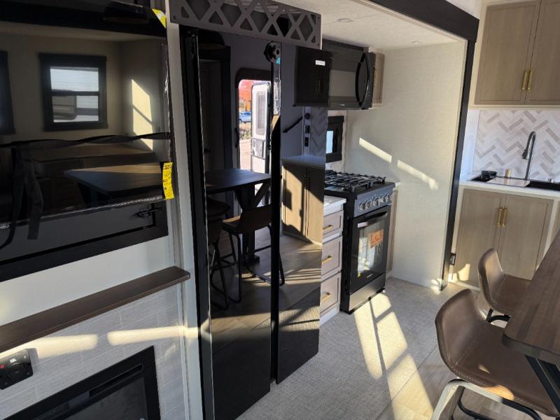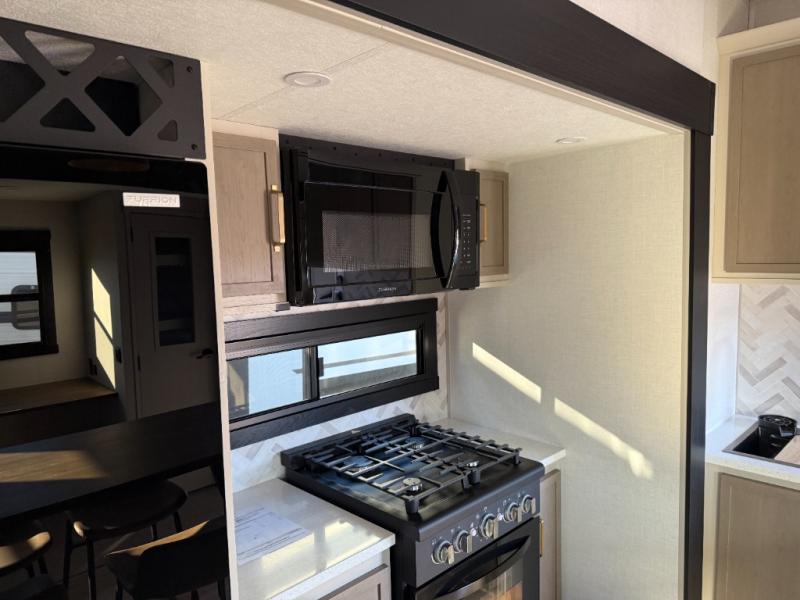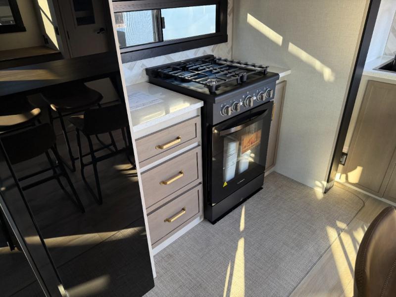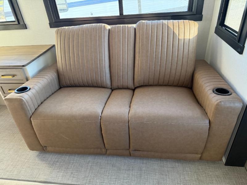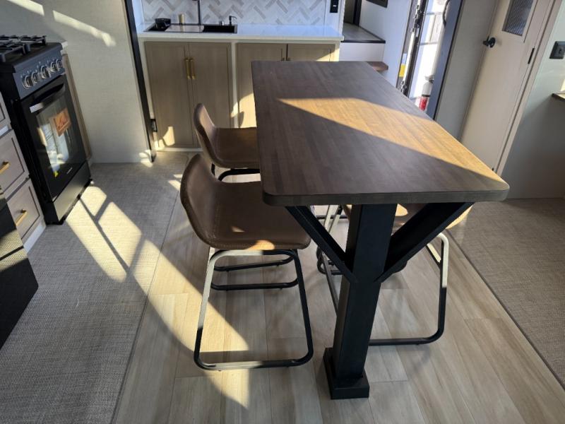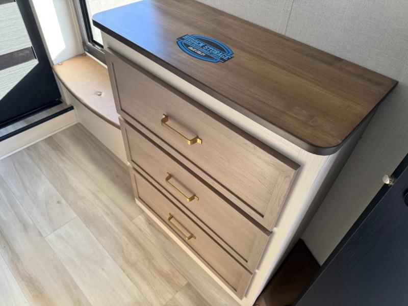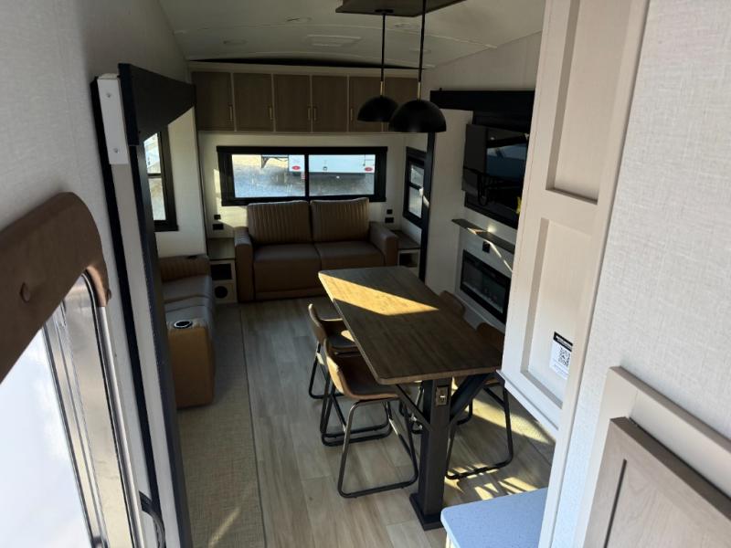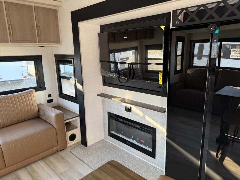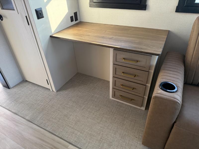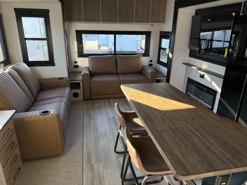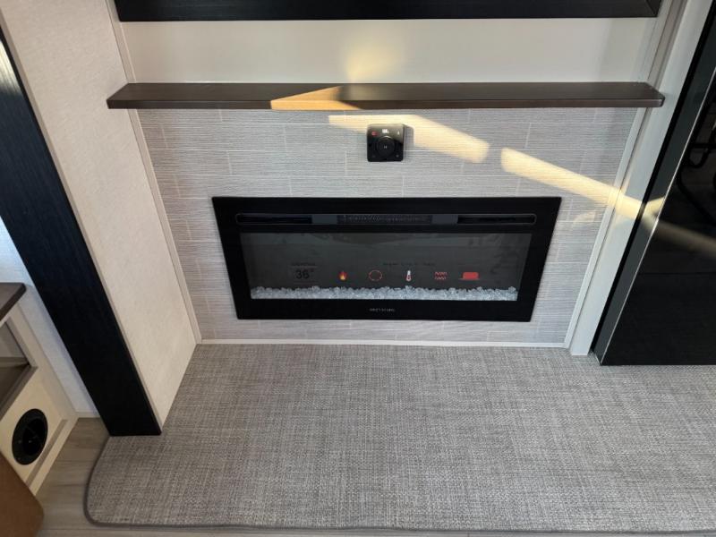 It won't be hard to find comfort in this spacious fifth wheel for four! Once you've unloaded the pass-thru storage, you can head inside to make lunch in the full kitchen. There is a 16-cu. ft. 12V refrigerator here to keep food fresh, and everyone can dine at the kitchen island with four chairs. The theater seating is directly across from the 50" TV and fireplace, and you'll appreciate the hidden storage behind the TV for movies, games, and books! A desk with a chair is also found in the combined kitchen and living area if you need to get some work done, and a rear tri-fold sofa provides sleeping space for guests. Don't overlook the spacious full bath with dual sinks and the front private bedroom with a custom king bed slide. A front wardrobe plus a dresser will let you keep your space tidy, and there is washer/dryer prep if you plan to add those appliances!