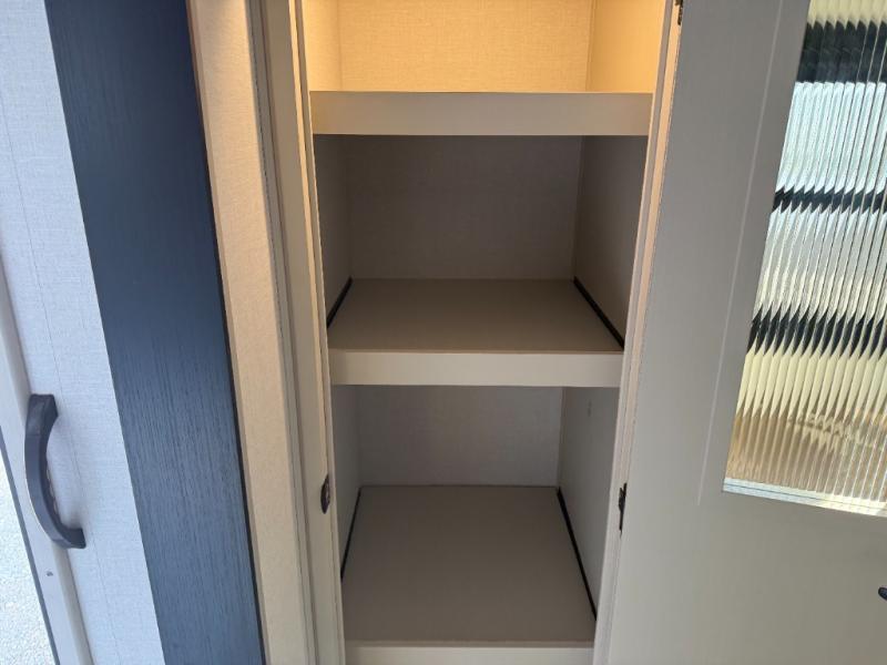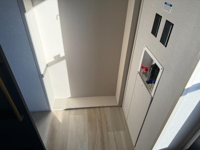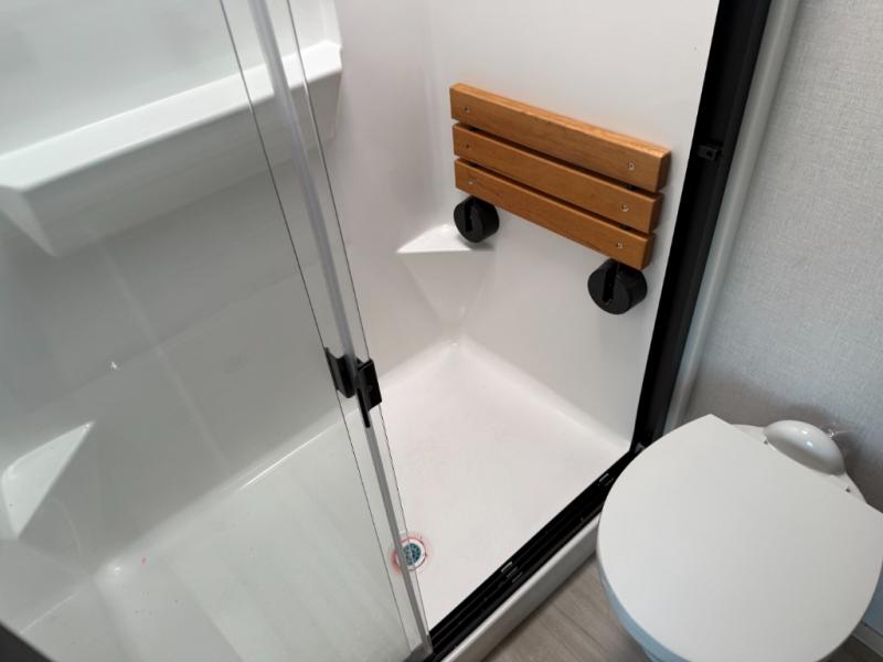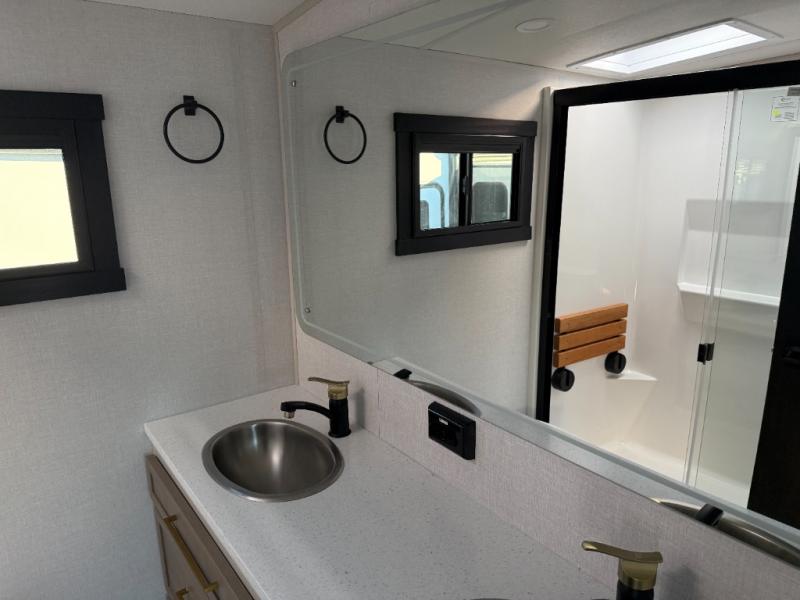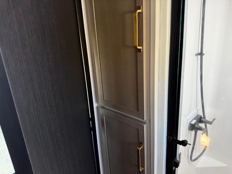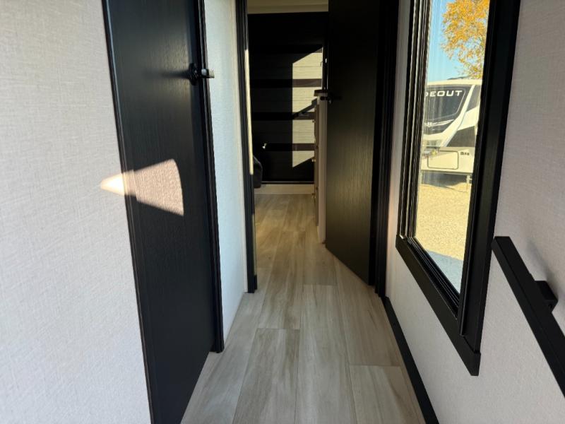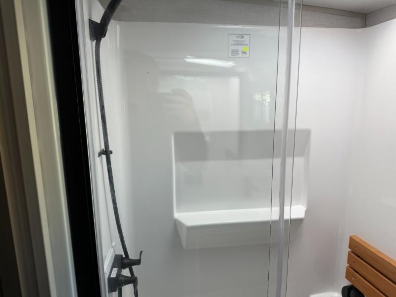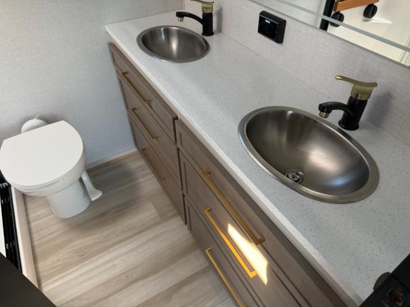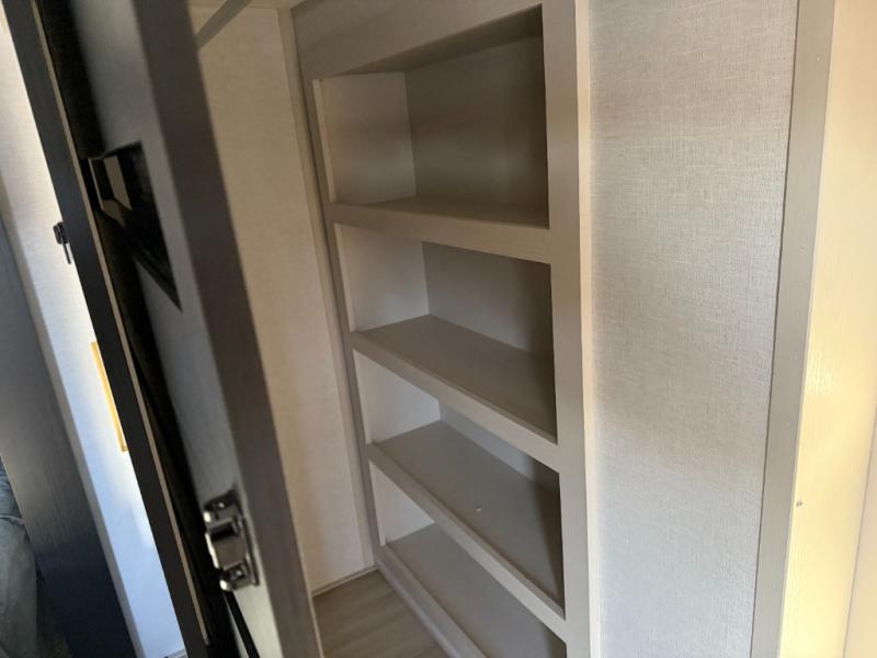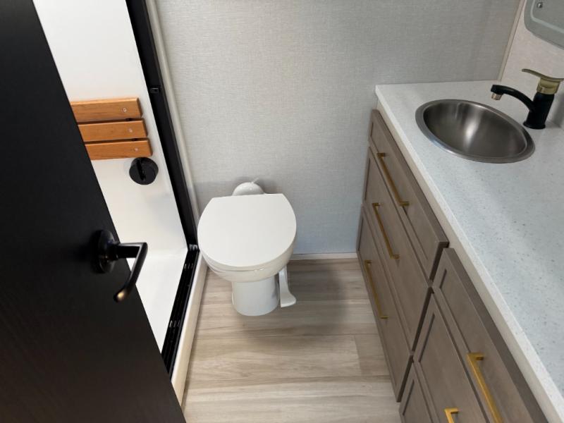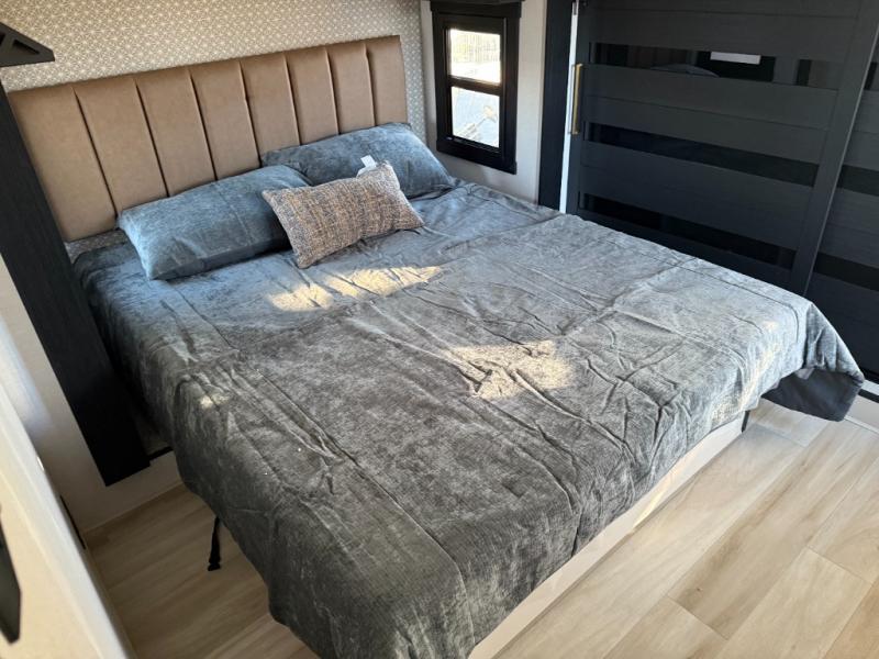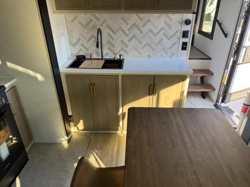 It won't be hard to find comfort in this spacious fifth wheel for four! Once you've unloaded the pass-thru storage, you can head inside to make lunch in the full kitchen. There is a 16-cu. ft. 12V refrigerator here to keep food fresh, and everyone can dine at the kitchen island with four chairs. The theater seating is directly across from the 50" TV and fireplace, and you'll appreciate the hidden storage behind the TV for movies, games, and books! A desk with a chair is also found in the combined kitchen and living area if you need to get some work done, and a rear tri-fold sofa provides sleeping space for guests. Don't overlook the spacious full bath with dual sinks and the front private bedroom with a custom king bed slide. A front wardrobe plus a dresser will let you keep your space tidy, and there is washer/dryer prep if you plan to add those appliances!