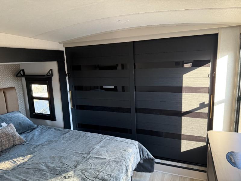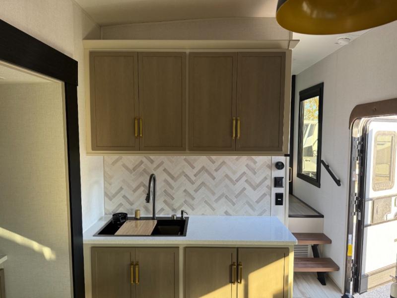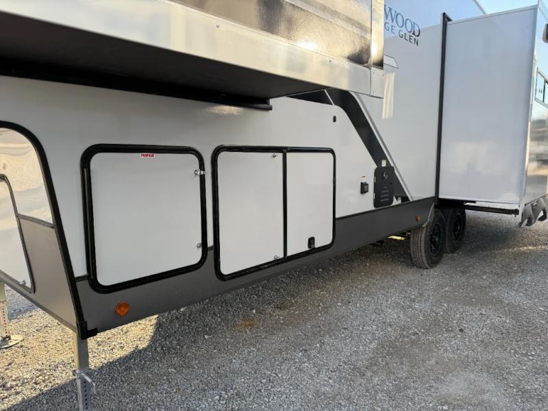 With any Wildwood Heritage Glen fifth wheel by Forest River, the quality construction, attention to detail and design along with a bright and welcoming interior allows you to relax in comfort. You'll love the high-end solid surface countertops included in the Elevated Value Package, along with a JBL sound system, full-length barreled ceilings, and an ultimate interior lighting upgrade. The included Expedition Package features an Accesibelly underbelly panel with 12V tank heaters, nitrogen-filled tires with aluminum rims, and a spacious 30" wide main entry door with a window. The Lippert On-The-Go ladder prep and back-up camera prep let you customize your fifth wheel even more, and the LED awning, front cap, marker and taillights will make it easier than ever to set up camp!