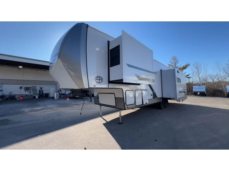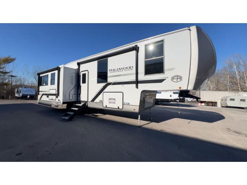 With any Wildwood Heritage Glen fifth wheel by Forest River, the quality construction, attention to detail and design along with a bright and welcoming interior allows you to relax in comfort. You'll love the high-end solid surface countertops included in the Elevated Value Package, along with a JBL sound system, full-length barreled ceilings, and an ultimate interior lighting upgrade. The included Expedition Package features an Accesibelly underbelly panel with 12V tank heaters, nitrogen-filled tires with aluminum rims, and a spacious 30" wide main entry door with a window. The Lippert On-The-Go ladder prep and back-up camera prep let you customize your fifth wheel even more, and the LED awning, front cap, marker and taillights will make it easier than ever to set up camp!