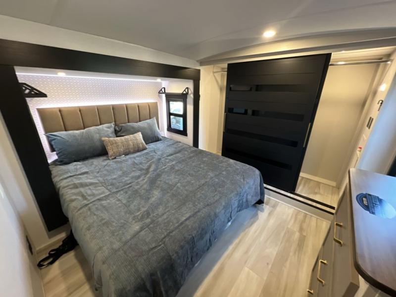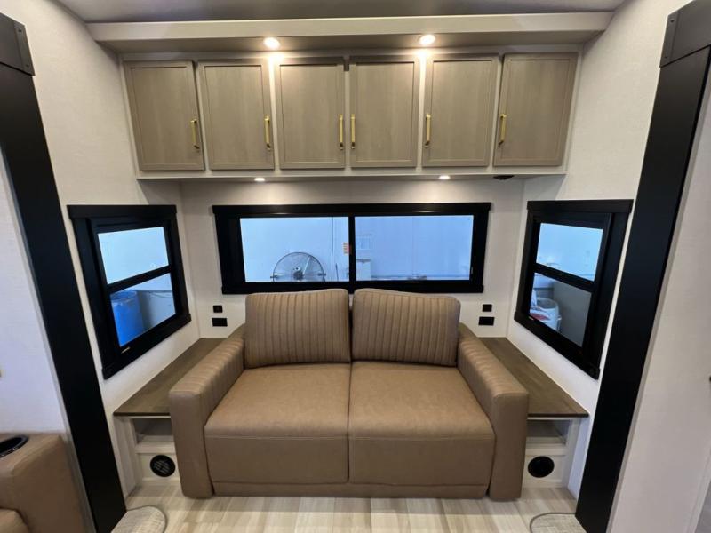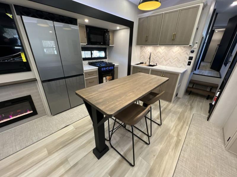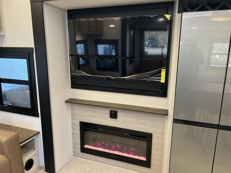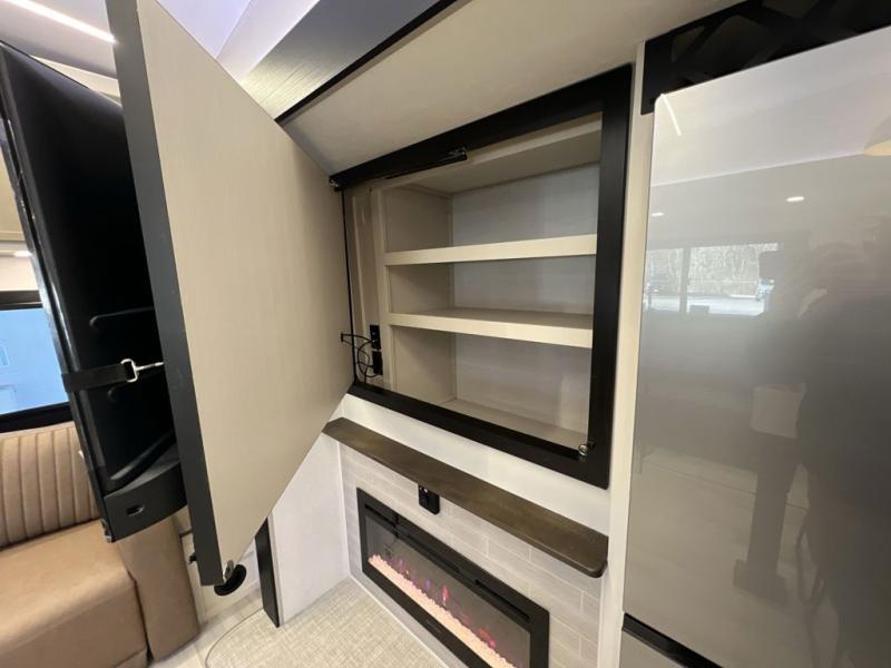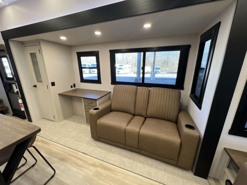 It won't be hard to find comfort in this spacious fifth wheel for four! Once you've unloaded the pass-thru storage, you can head inside to make lunch in the full kitchen. There is a 16-cu. ft. 12V refrigerator here to keep food fresh, and everyone can dine at the kitchen island with four chairs. The theater seating is directly across from the 50" TV and fireplace, and you'll appreciate the hidden storage behind the TV for movies, games, and books! A desk with a chair is also found in the combined kitchen and living area if you need to get some work done, and a rear tri-fold sofa provides sleeping space for guests. Don't overlook the spacious full bath with dual sinks and the front private bedroom with a custom king bed slide. A front wardrobe plus a dresser will let you keep your space tidy, and there is washer/dryer prep if you plan to add those appliances!