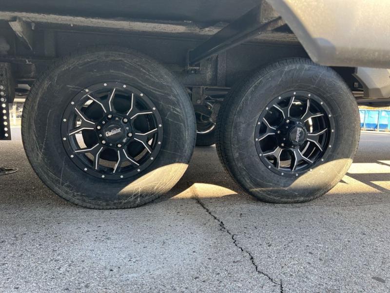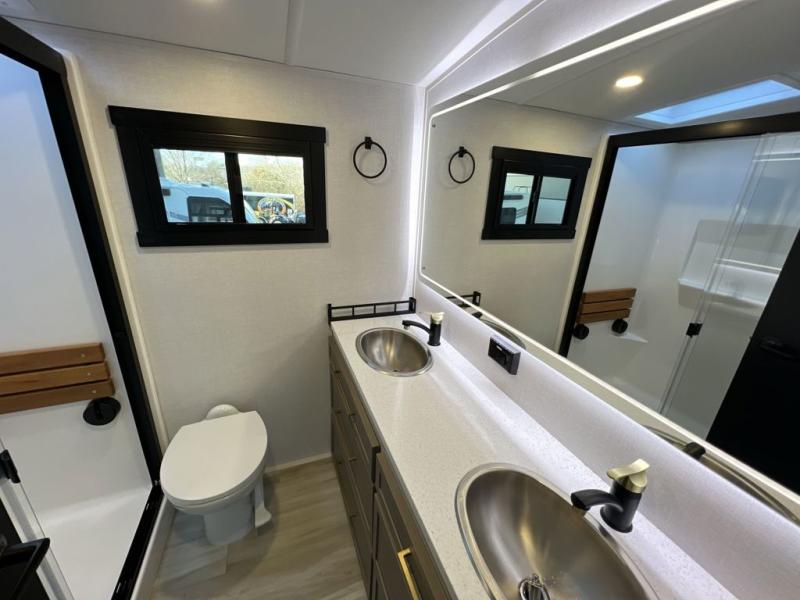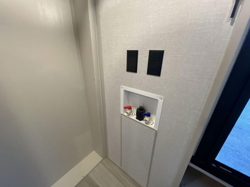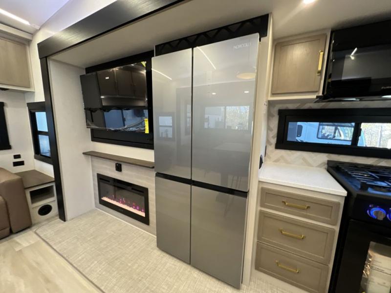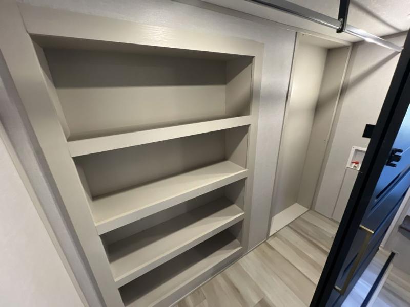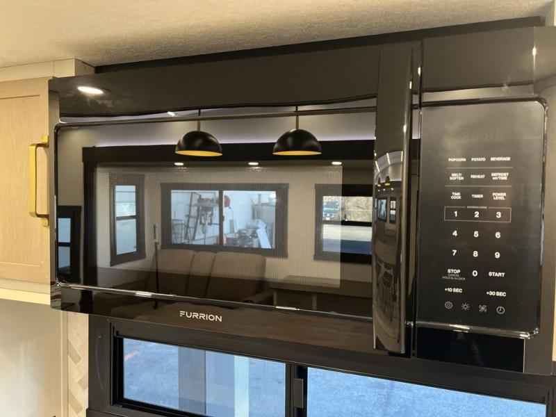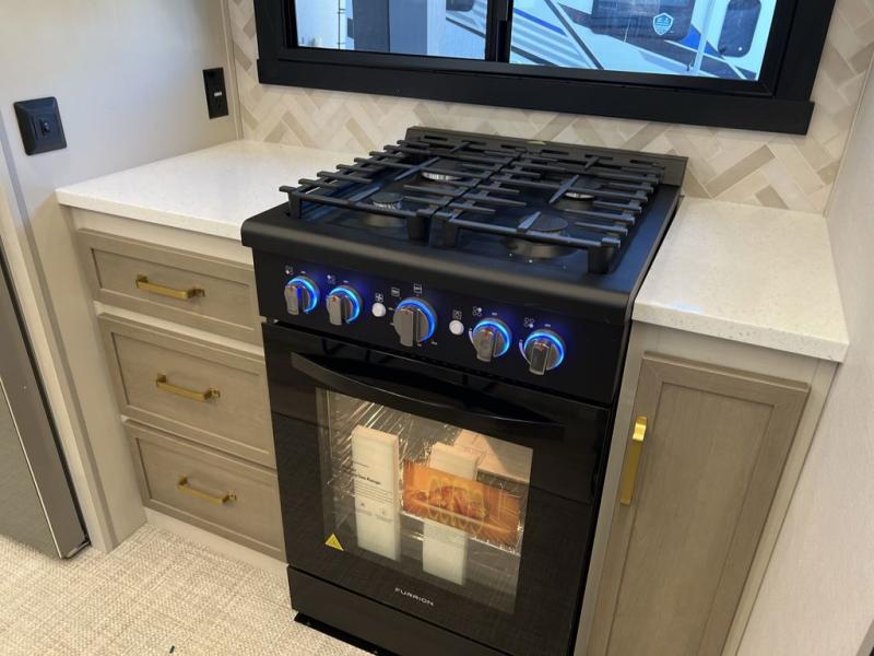 It won't be hard to find comfort in this spacious fifth wheel for four! Once you've unloaded the pass-thru storage, you can head inside to make lunch in the full kitchen. There is a 16-cu. ft. 12V refrigerator here to keep food fresh, and everyone can dine at the kitchen island with four chairs. The theater seating is directly across from the 50" TV and fireplace, and you'll appreciate the hidden storage behind the TV for movies, games, and books! A desk with a chair is also found in the combined kitchen and living area if you need to get some work done, and a rear tri-fold sofa provides sleeping space for guests. Don't overlook the spacious full bath with dual sinks and the front private bedroom with a custom king bed slide. A front wardrobe plus a dresser will let you keep your space tidy, and there is washer/dryer prep if you plan to add those appliances!