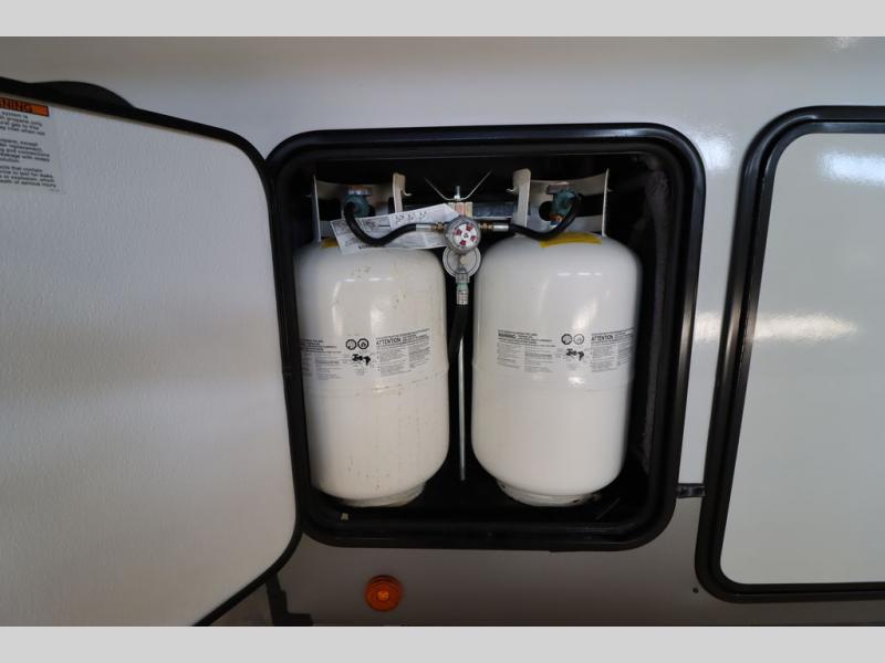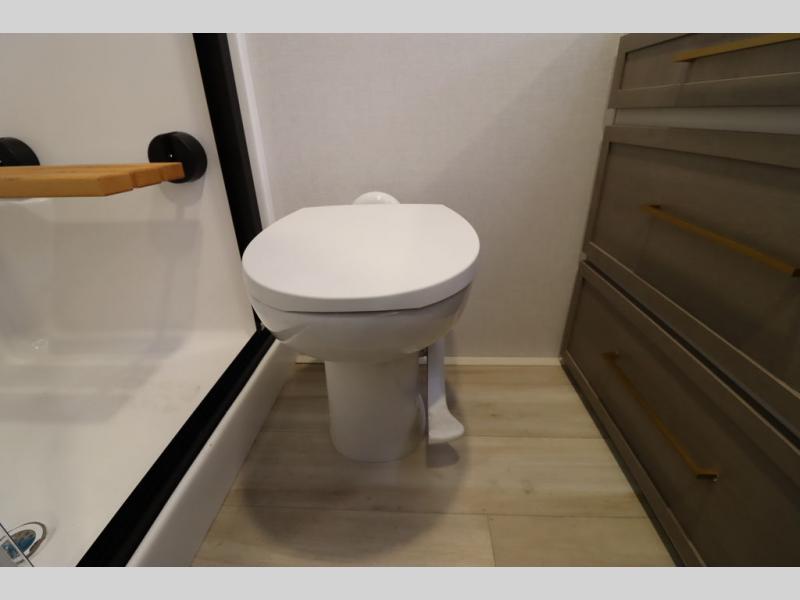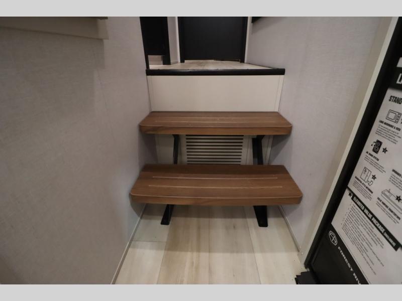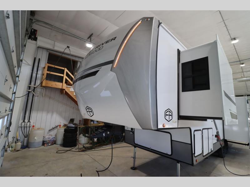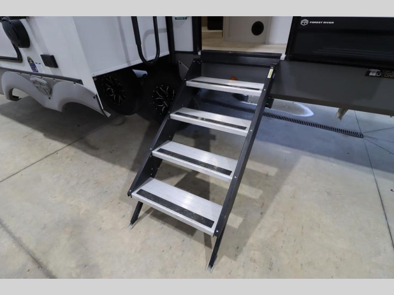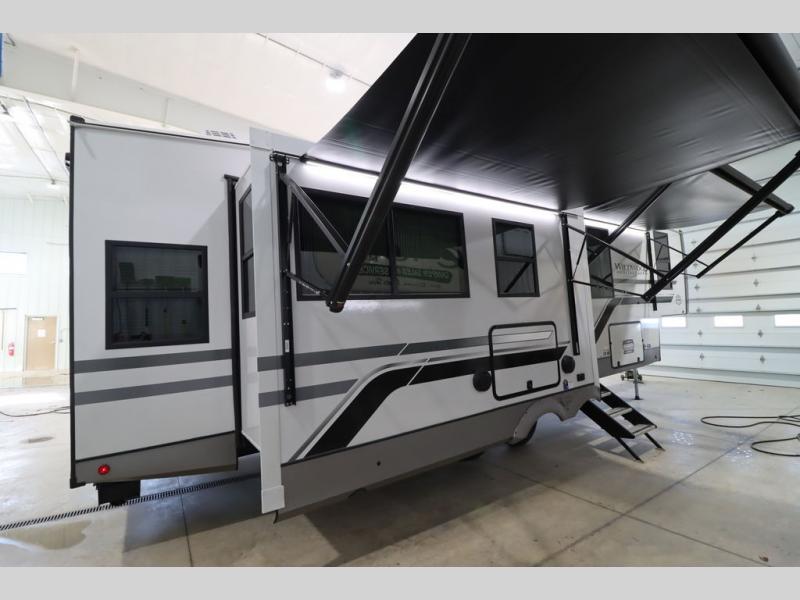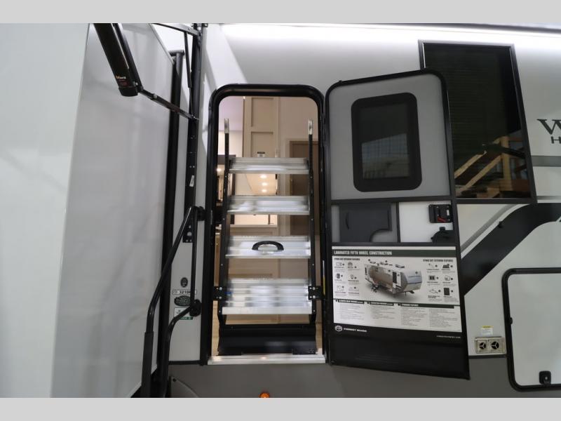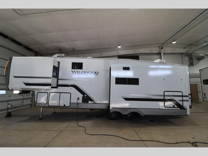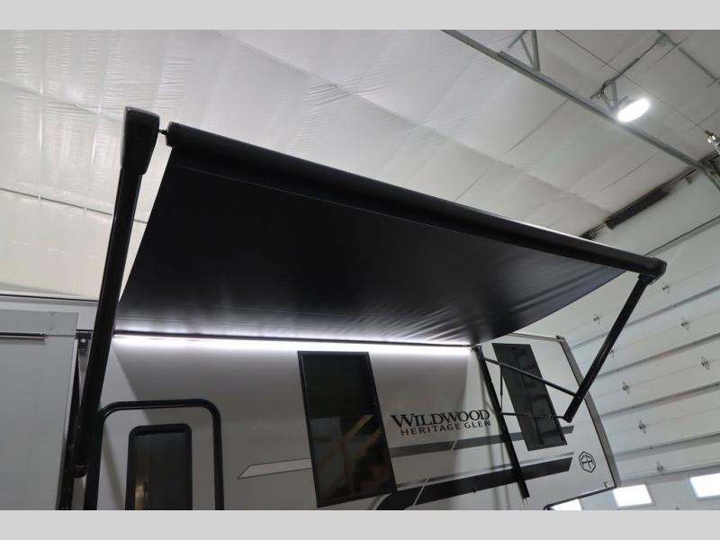 With any Wildwood Heritage Glen fifth wheel by Forest River, the quality construction, attention to detail and design along with a bright and welcoming interior allows you to relax in comfort. You'll love the high-end solid surface countertops included in the Elevated Value Package, along with a JBL sound system, full-length barreled ceilings, and an ultimate interior lighting upgrade. The included Expedition Package features an Accesibelly underbelly panel with 12V tank heaters, nitrogen-filled tires with aluminum rims, and a spacious 30" wide main entry door with a window. The Lippert On-The-Go ladder prep and back-up camera prep let you customize your fifth wheel even more, and the LED awning, front cap, marker and taillights will make it easier than ever to set up camp!