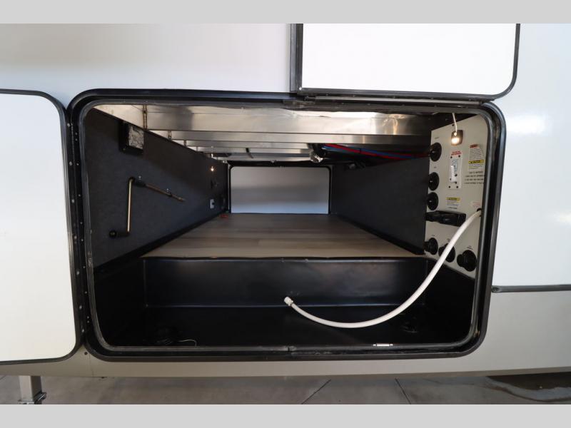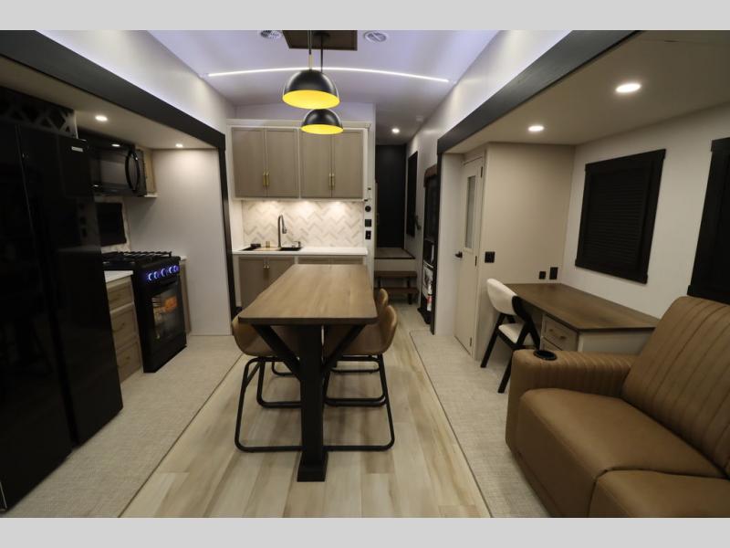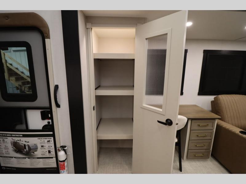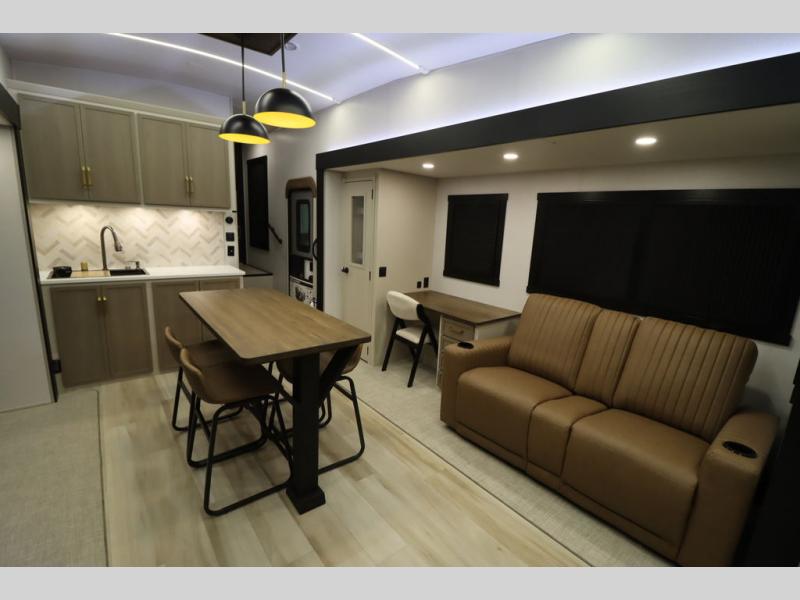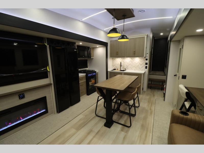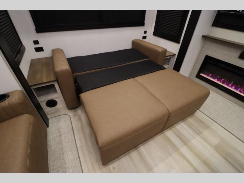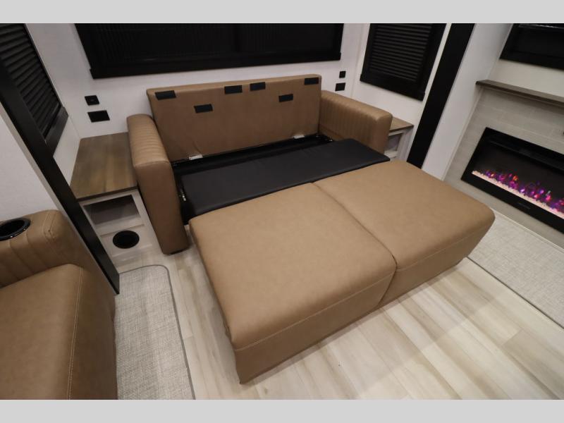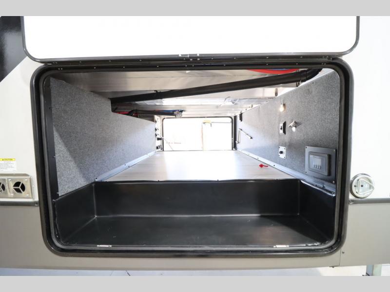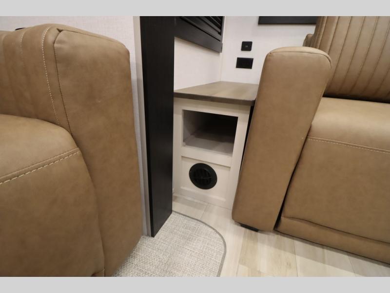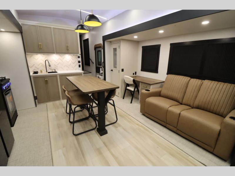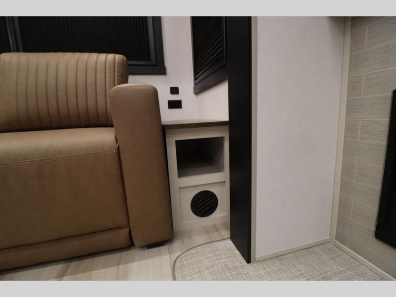 It won't be hard to find comfort in this spacious fifth wheel for four! Once you've unloaded the pass-thru storage, you can head inside to make lunch in the full kitchen. There is a 16-cu. ft. 12V refrigerator here to keep food fresh, and everyone can dine at the kitchen island with four chairs. The theater seating is directly across from the 50" TV and fireplace, and you'll appreciate the hidden storage behind the TV for movies, games, and books! A desk with a chair is also found in the combined kitchen and living area if you need to get some work done, and a rear tri-fold sofa provides sleeping space for guests. Don't overlook the spacious full bath with dual sinks and the front private bedroom with a custom king bed slide. A front wardrobe plus a dresser will let you keep your space tidy, and there is washer/dryer prep if you plan to add those appliances!