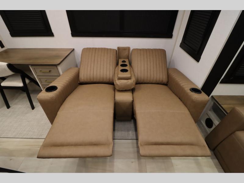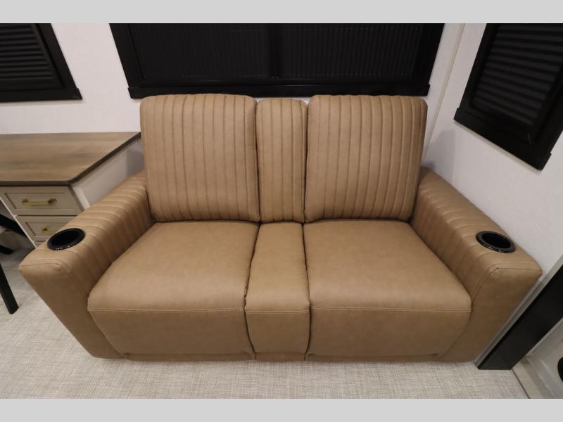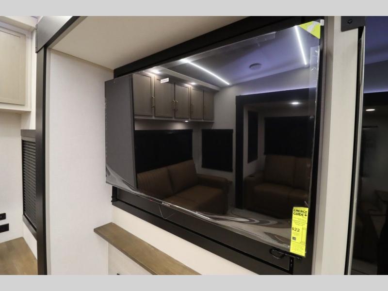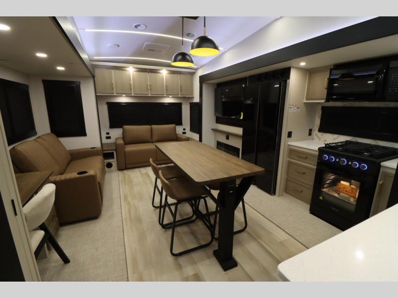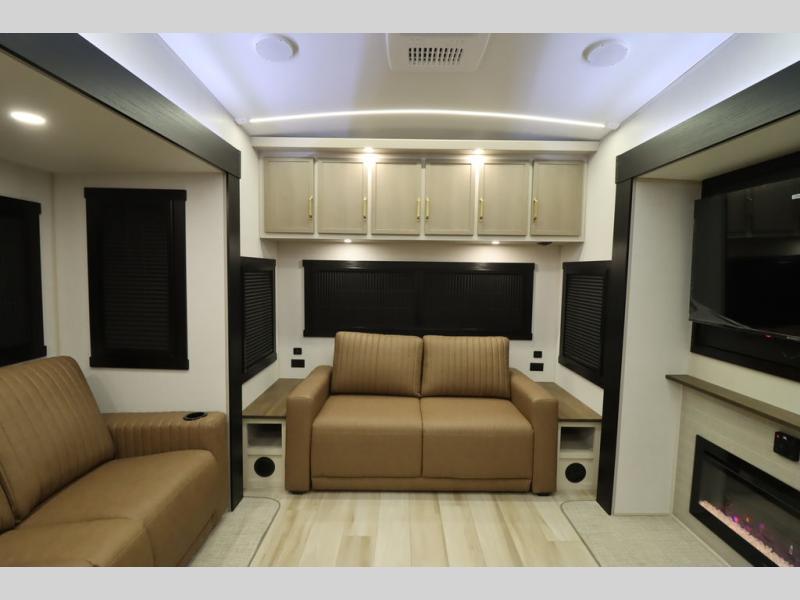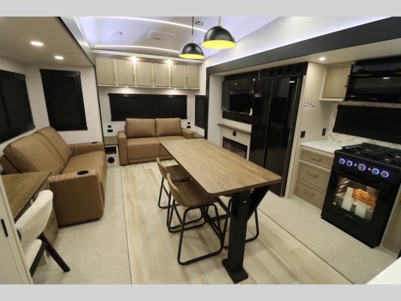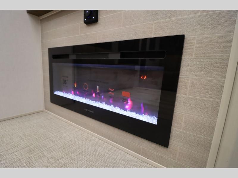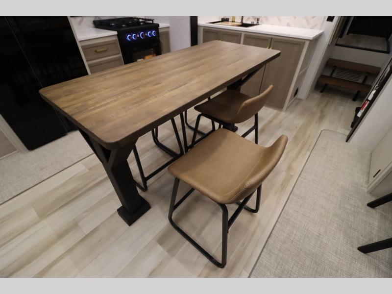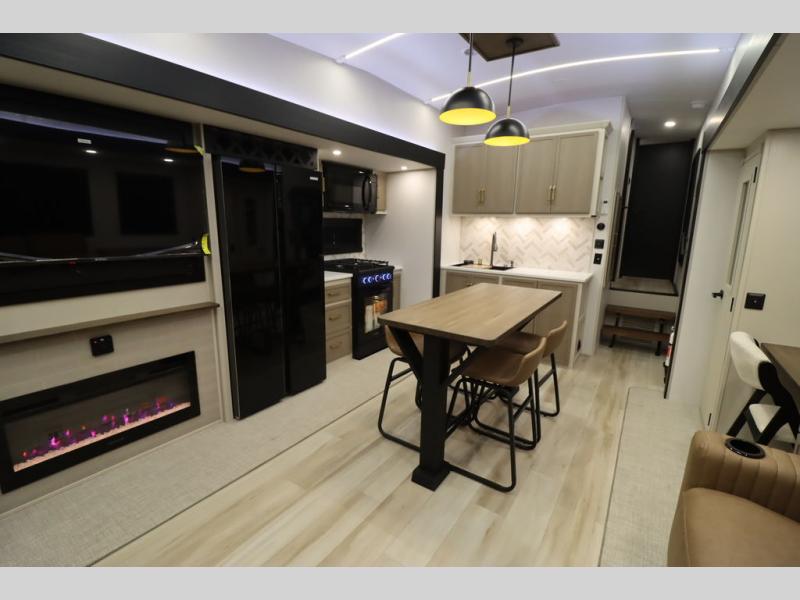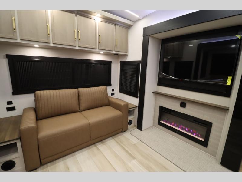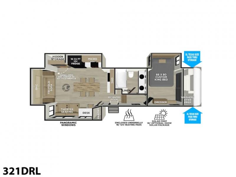 It won't be hard to find comfort in this spacious fifth wheel for four! Once you've unloaded the pass-thru storage, you can head inside to make lunch in the full kitchen. There is a 16-cu. ft. 12V refrigerator here to keep food fresh, and everyone can dine at the kitchen island with four chairs. The theater seating is directly across from the 50" TV and fireplace, and you'll appreciate the hidden storage behind the TV for movies, games, and books! A desk with a chair is also found in the combined kitchen and living area if you need to get some work done, and a rear tri-fold sofa provides sleeping space for guests. Don't overlook the spacious full bath with dual sinks and the front private bedroom with a custom king bed slide. A front wardrobe plus a dresser will let you keep your space tidy, and there is washer/dryer prep if you plan to add those appliances!