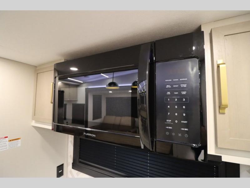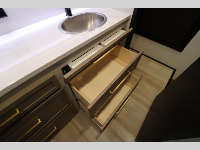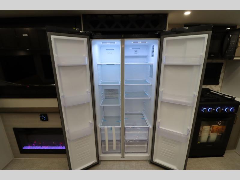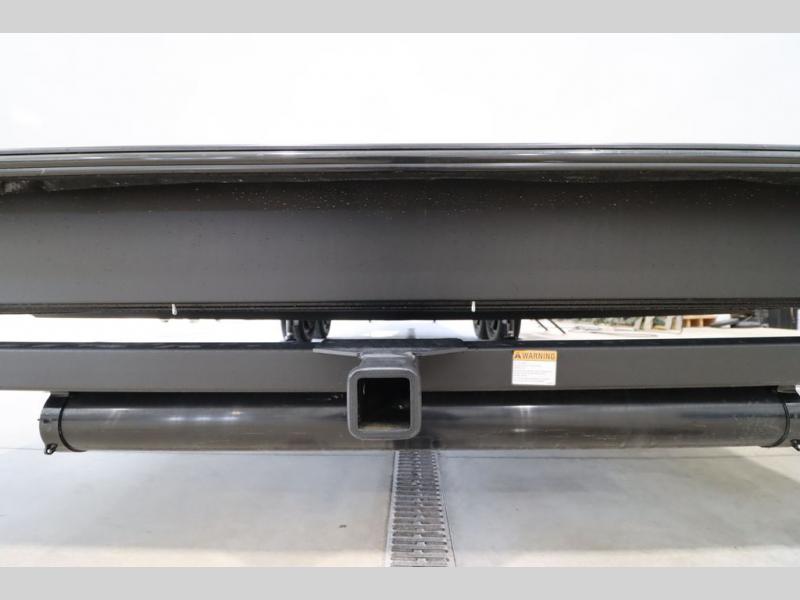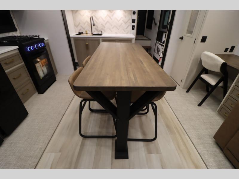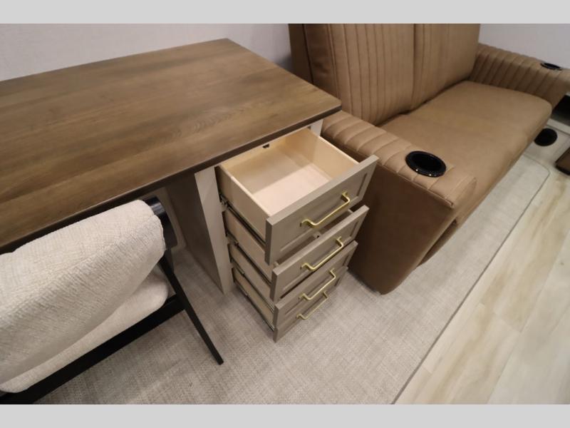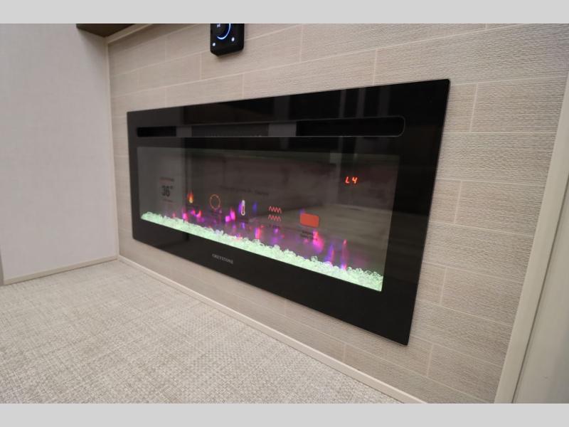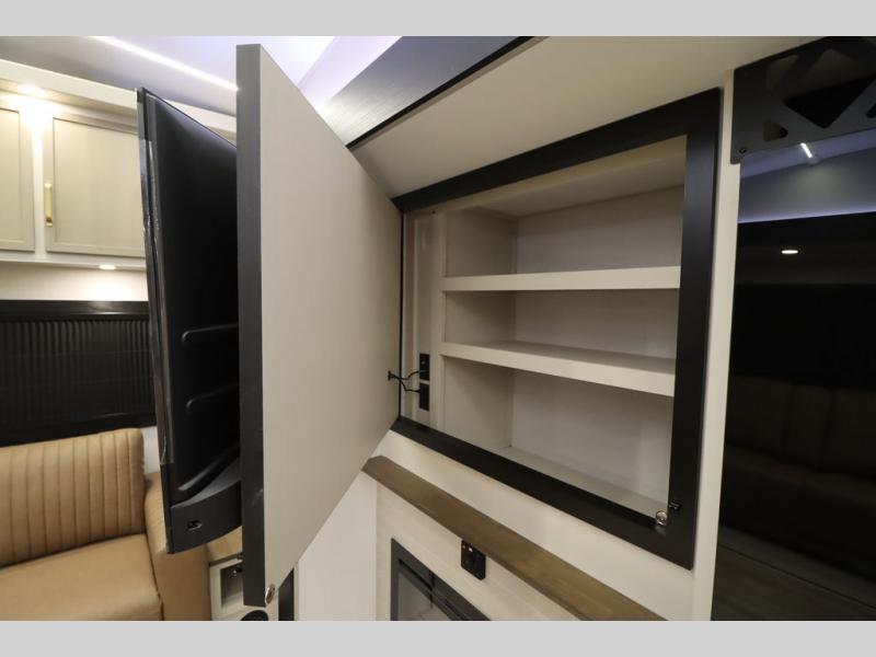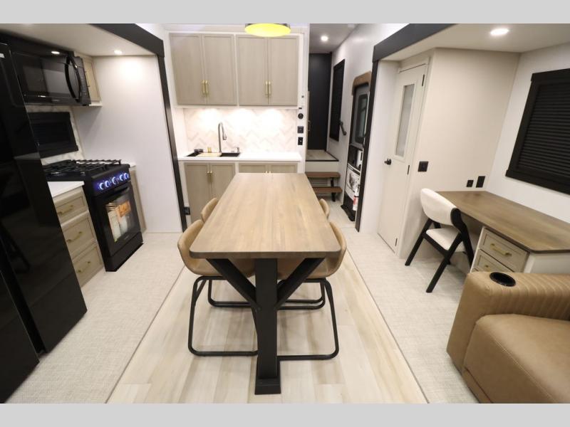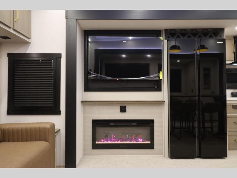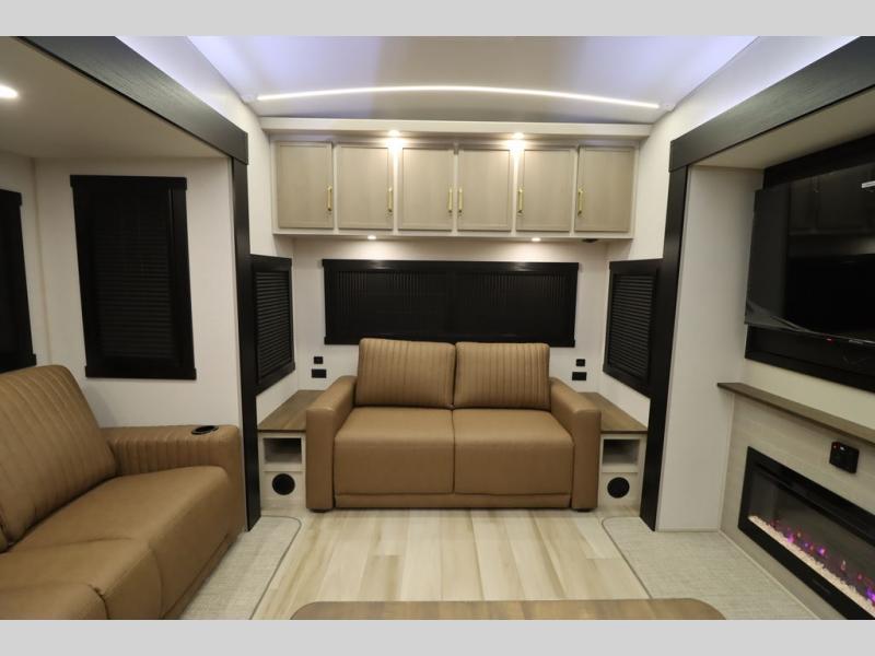 It won't be hard to find comfort in this spacious fifth wheel for four! Once you've unloaded the pass-thru storage, you can head inside to make lunch in the full kitchen. There is a 16-cu. ft. 12V refrigerator here to keep food fresh, and everyone can dine at the kitchen island with four chairs. The theater seating is directly across from the 50" TV and fireplace, and you'll appreciate the hidden storage behind the TV for movies, games, and books! A desk with a chair is also found in the combined kitchen and living area if you need to get some work done, and a rear tri-fold sofa provides sleeping space for guests. Don't overlook the spacious full bath with dual sinks and the front private bedroom with a custom king bed slide. A front wardrobe plus a dresser will let you keep your space tidy, and there is washer/dryer prep if you plan to add those appliances!