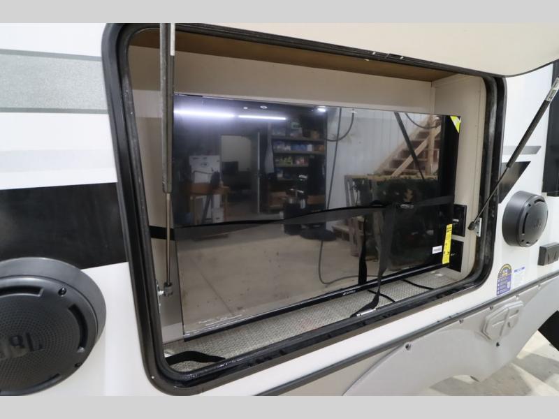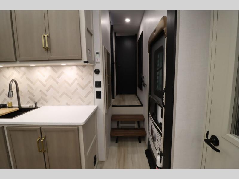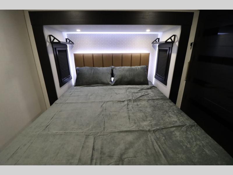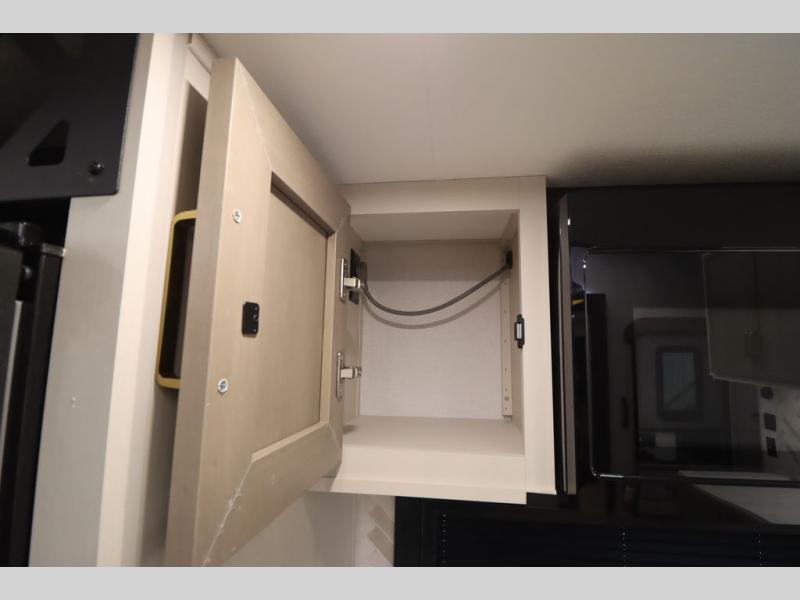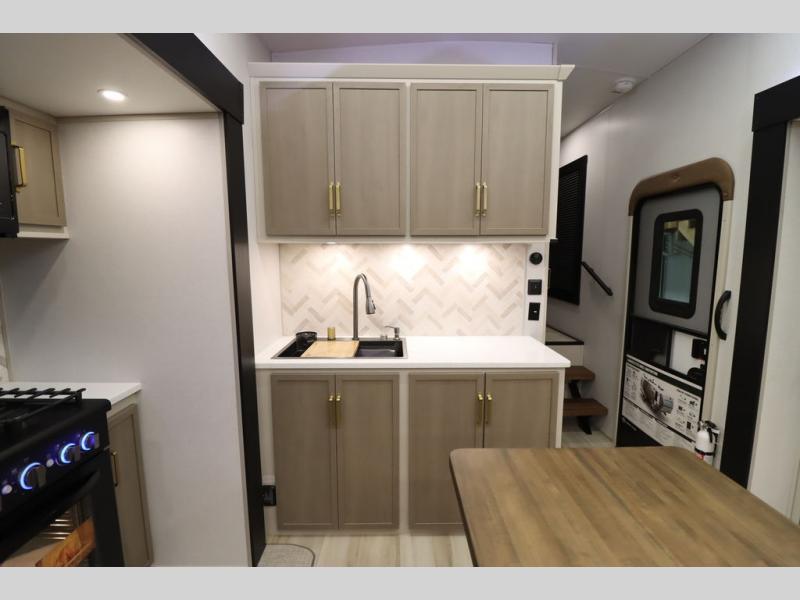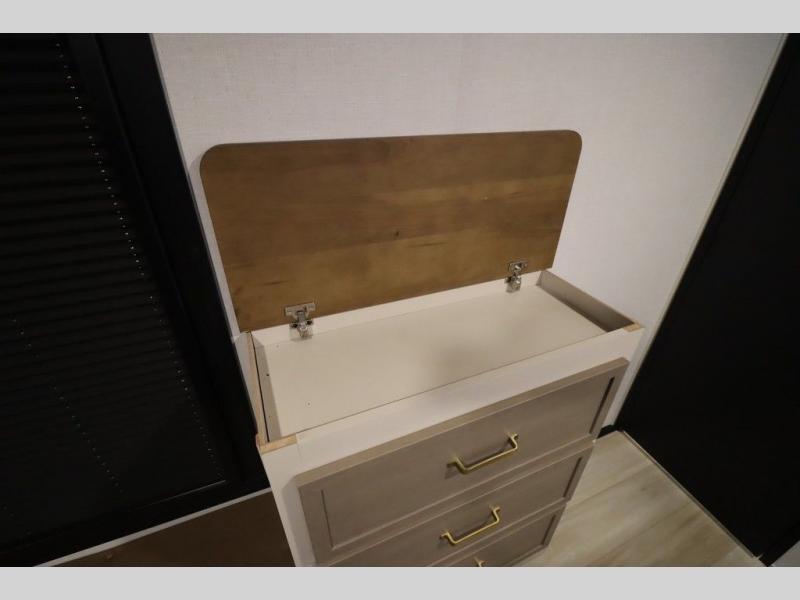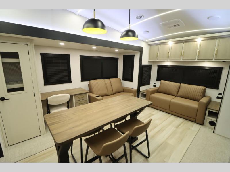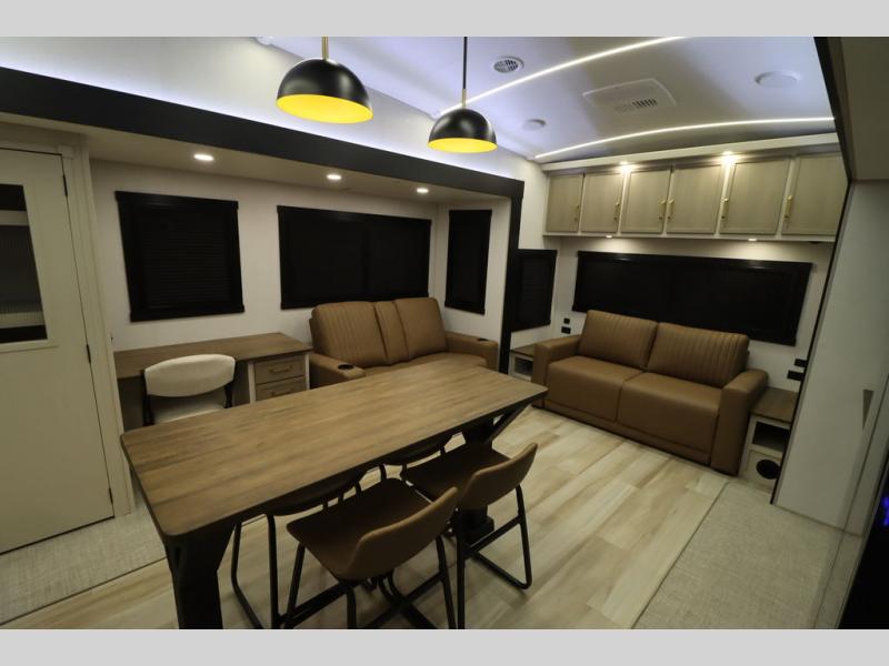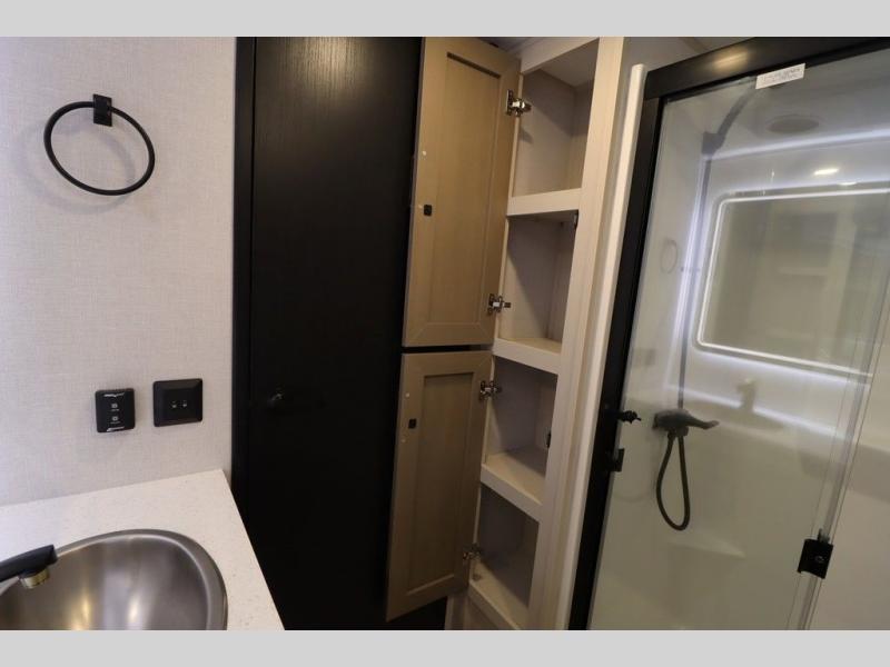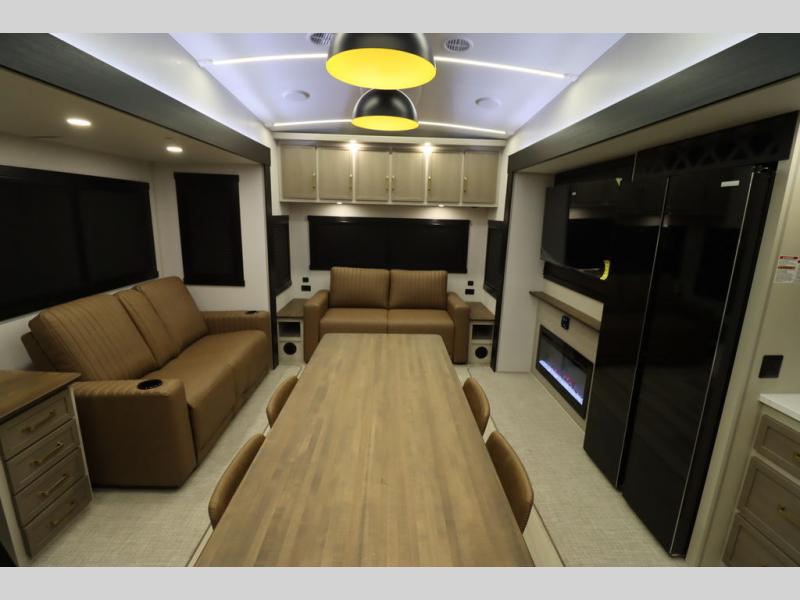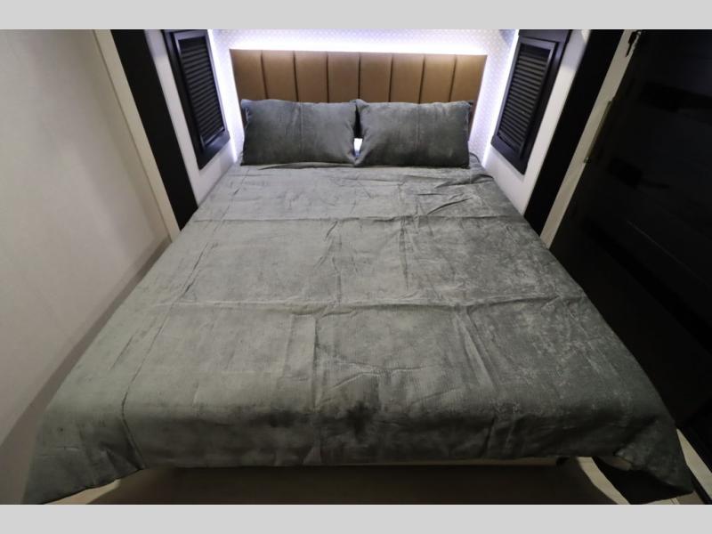 It won't be hard to find comfort in this spacious fifth wheel for four! Once you've unloaded the pass-thru storage, you can head inside to make lunch in the full kitchen. There is a 16-cu. ft. 12V refrigerator here to keep food fresh, and everyone can dine at the kitchen island with four chairs. The theater seating is directly across from the 50" TV and fireplace, and you'll appreciate the hidden storage behind the TV for movies, games, and books! A desk with a chair is also found in the combined kitchen and living area if you need to get some work done, and a rear tri-fold sofa provides sleeping space for guests. Don't overlook the spacious full bath with dual sinks and the front private bedroom with a custom king bed slide. A front wardrobe plus a dresser will let you keep your space tidy, and there is washer/dryer prep if you plan to add those appliances!
