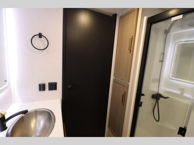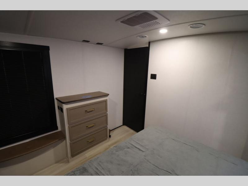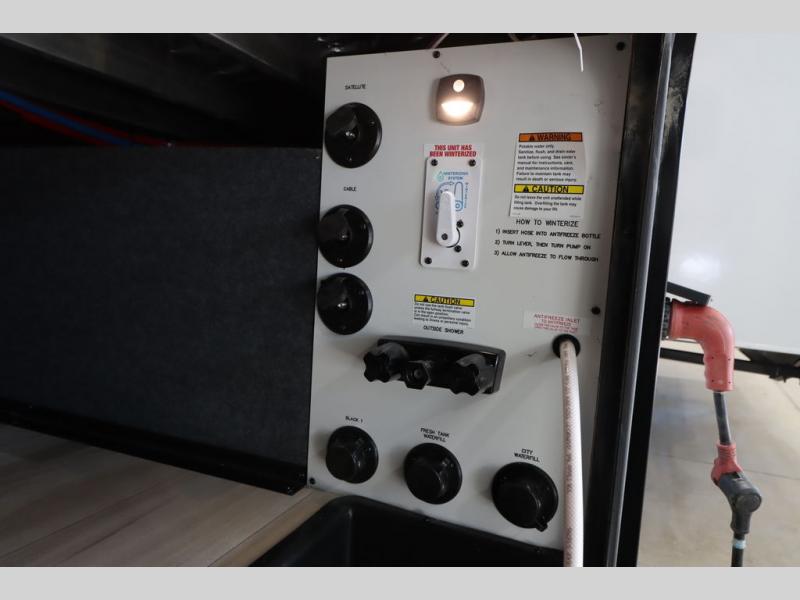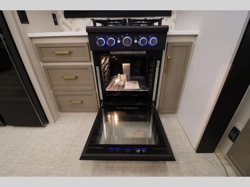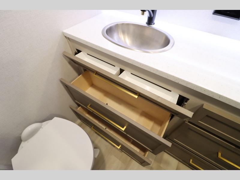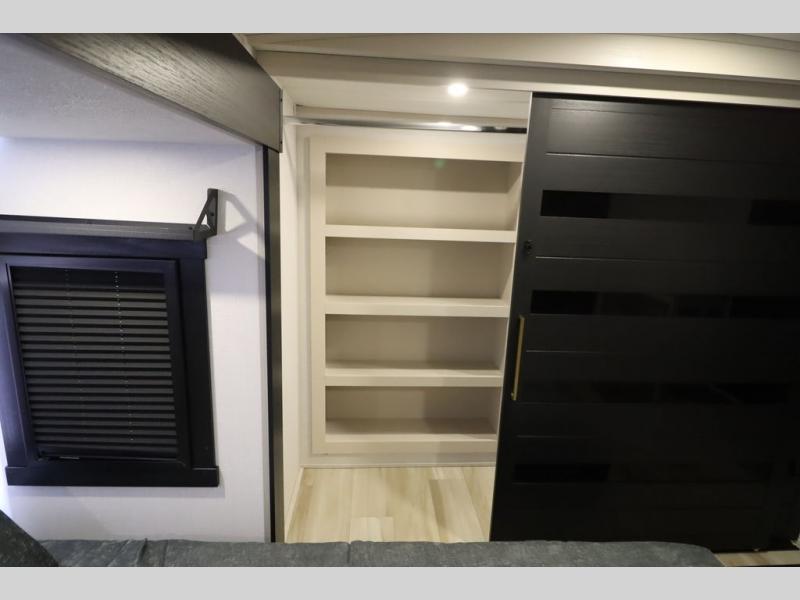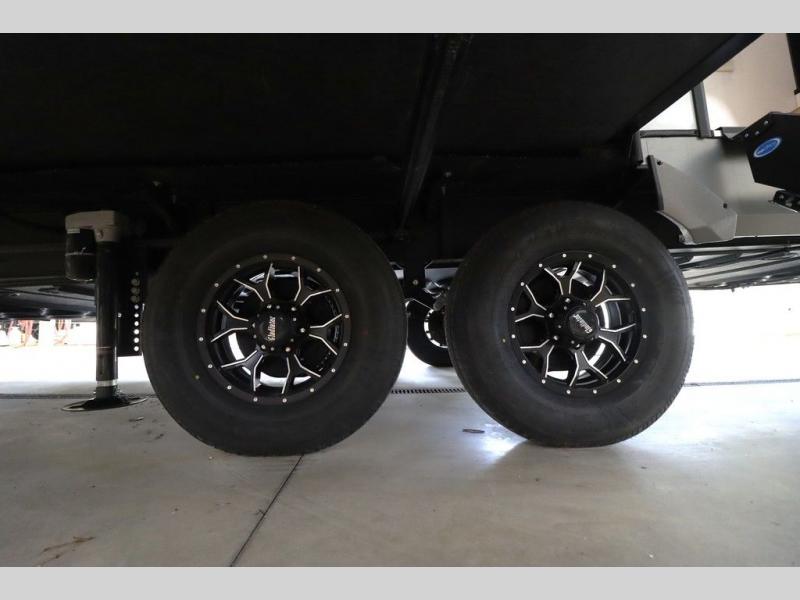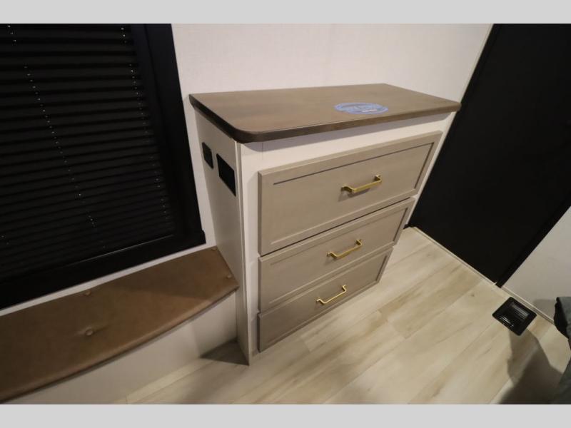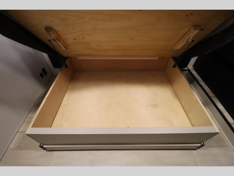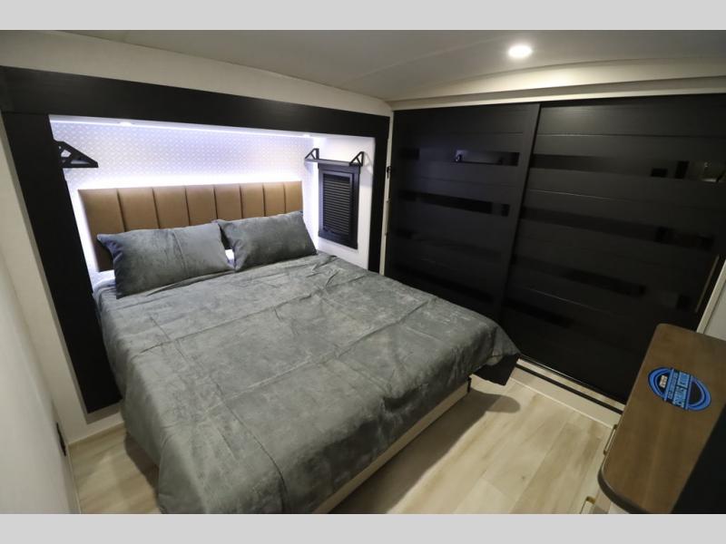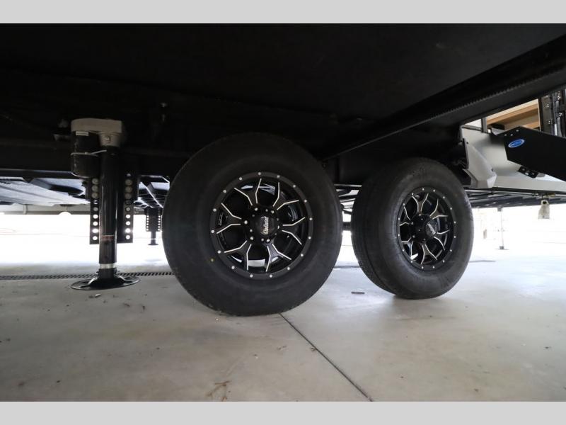 It won't be hard to find comfort in this spacious fifth wheel for four! Once you've unloaded the pass-thru storage, you can head inside to make lunch in the full kitchen. There is a 16-cu. ft. 12V refrigerator here to keep food fresh, and everyone can dine at the kitchen island with four chairs. The theater seating is directly across from the 50" TV and fireplace, and you'll appreciate the hidden storage behind the TV for movies, games, and books! A desk with a chair is also found in the combined kitchen and living area if you need to get some work done, and a rear tri-fold sofa provides sleeping space for guests. Don't overlook the spacious full bath with dual sinks and the front private bedroom with a custom king bed slide. A front wardrobe plus a dresser will let you keep your space tidy, and there is washer/dryer prep if you plan to add those appliances!