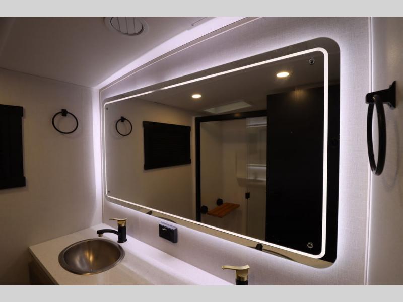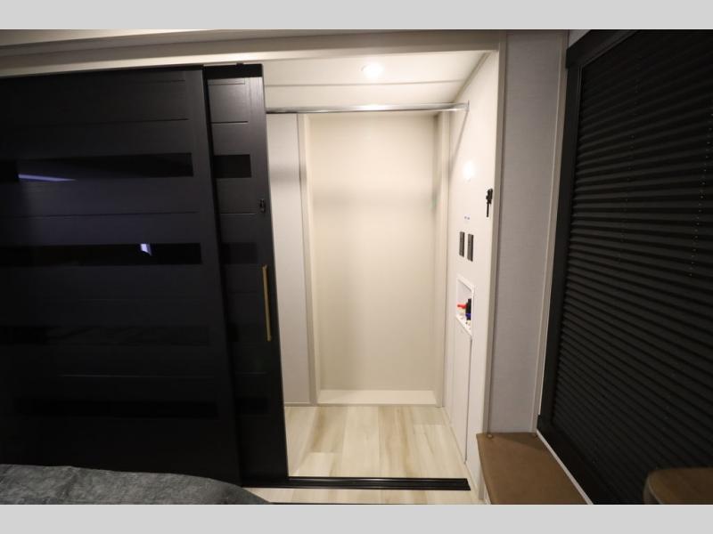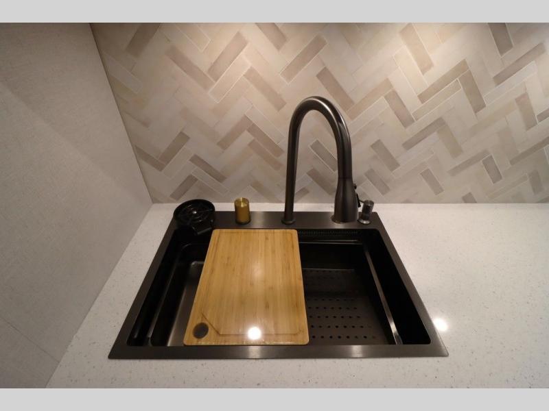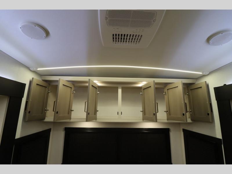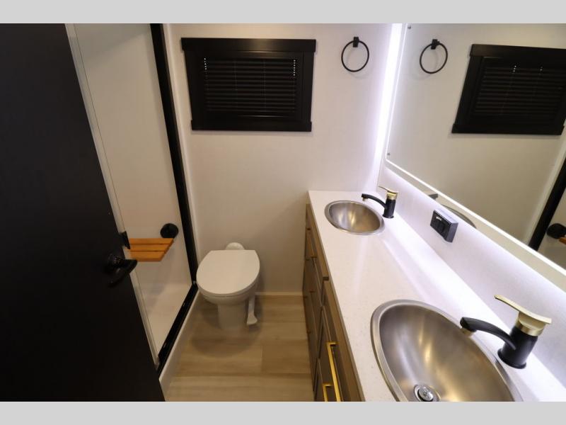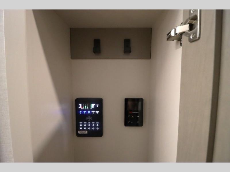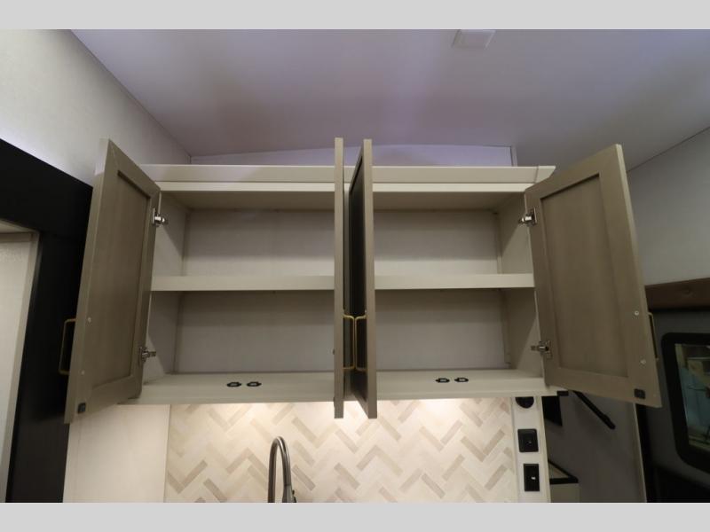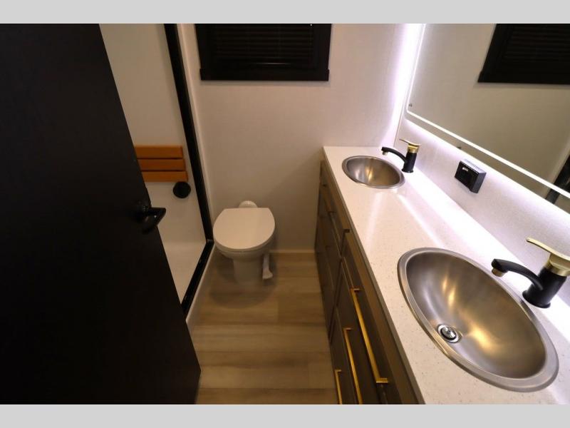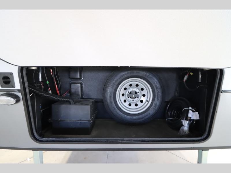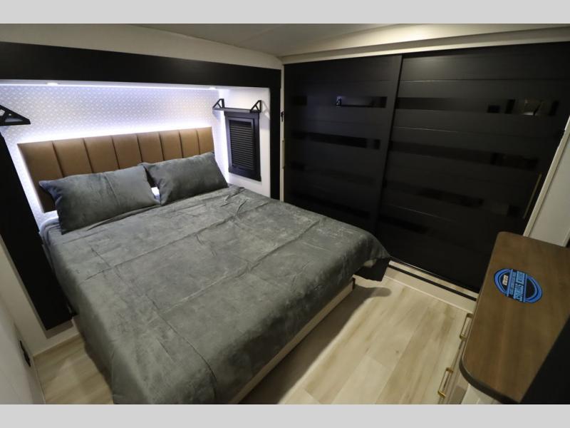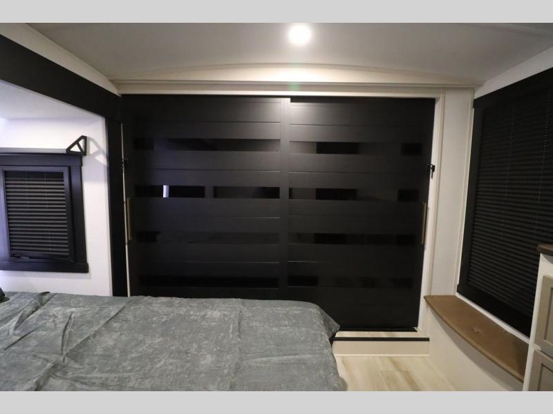 It won't be hard to find comfort in this spacious fifth wheel for four! Once you've unloaded the pass-thru storage, you can head inside to make lunch in the full kitchen. There is a 16-cu. ft. 12V refrigerator here to keep food fresh, and everyone can dine at the kitchen island with four chairs. The theater seating is directly across from the 50" TV and fireplace, and you'll appreciate the hidden storage behind the TV for movies, games, and books! A desk with a chair is also found in the combined kitchen and living area if you need to get some work done, and a rear tri-fold sofa provides sleeping space for guests. Don't overlook the spacious full bath with dual sinks and the front private bedroom with a custom king bed slide. A front wardrobe plus a dresser will let you keep your space tidy, and there is washer/dryer prep if you plan to add those appliances!