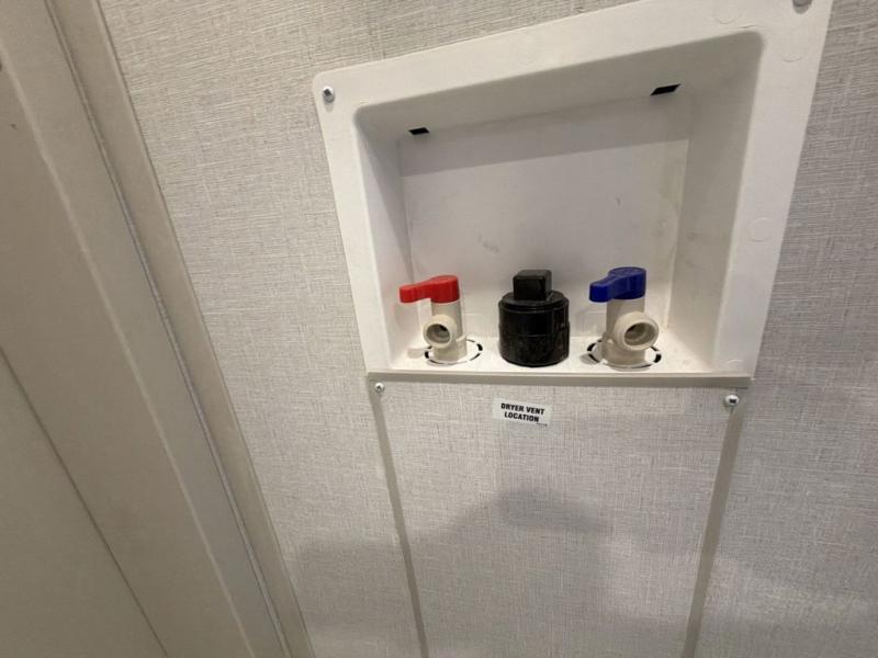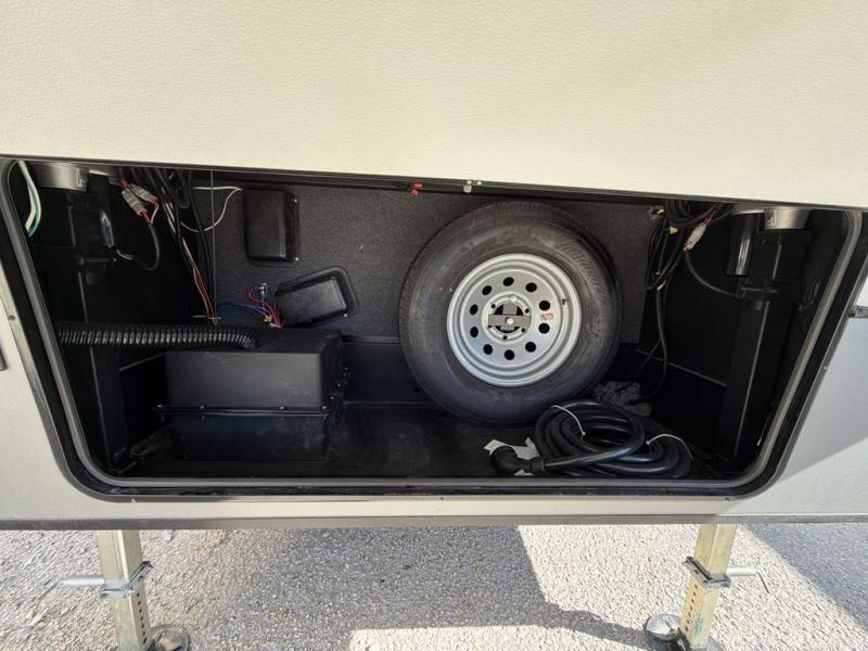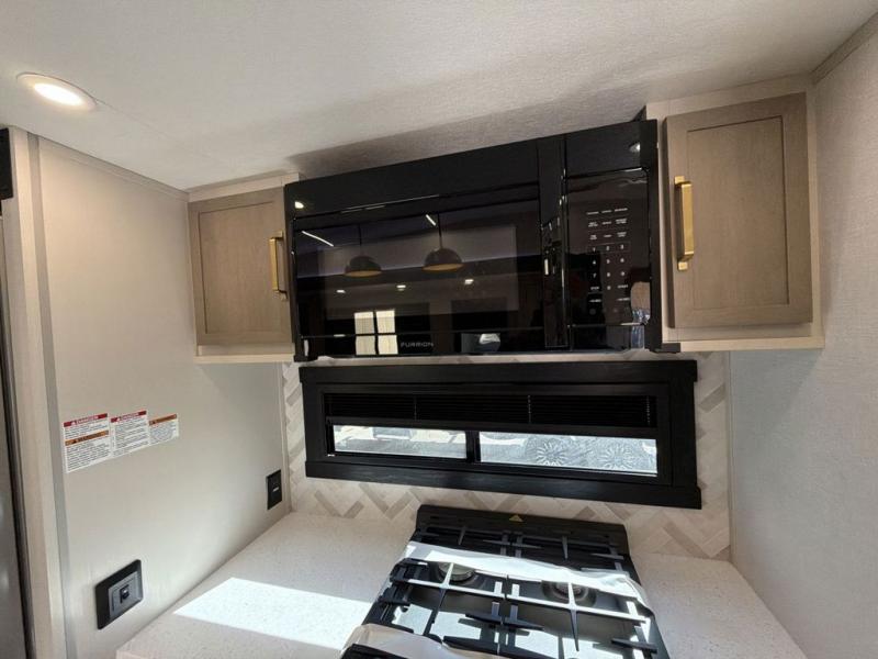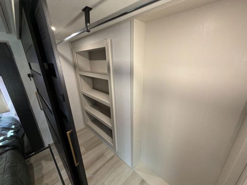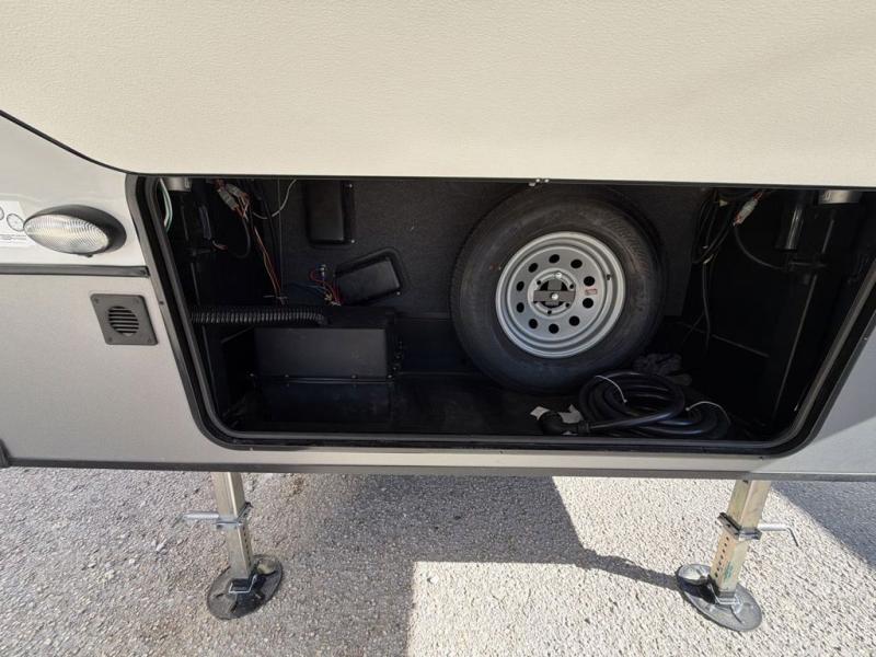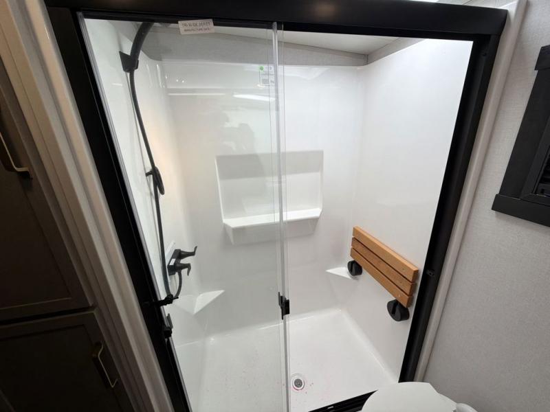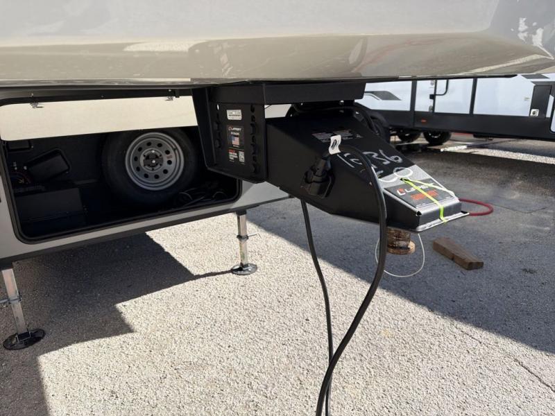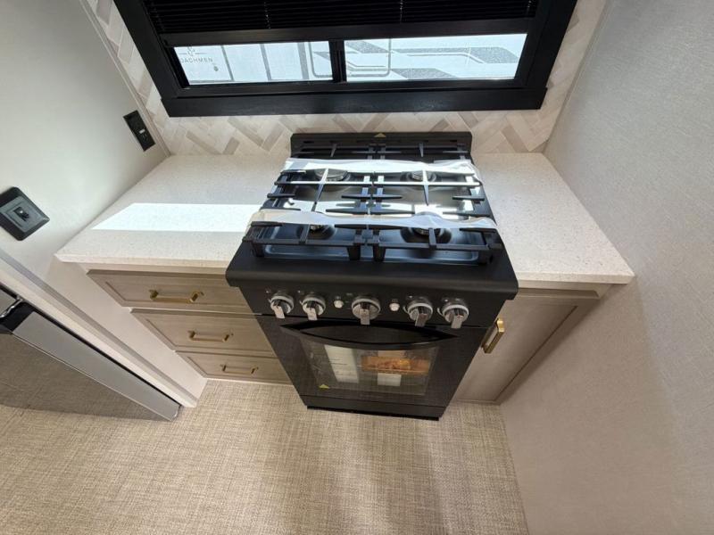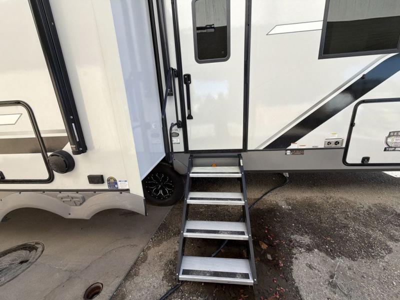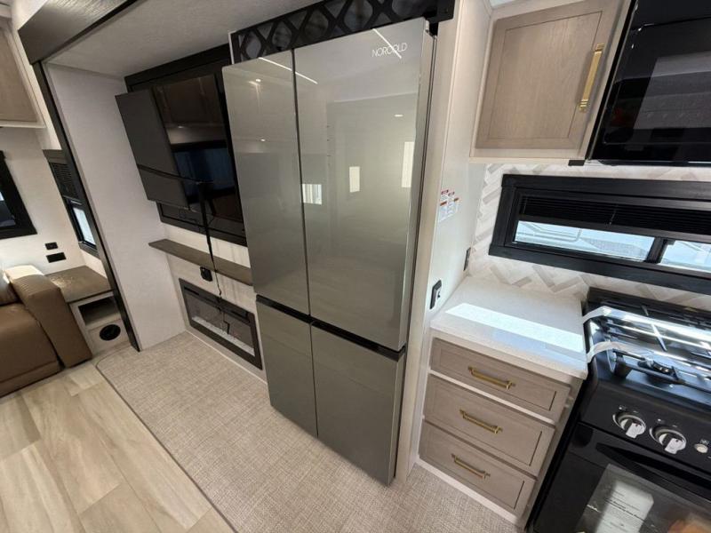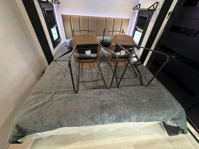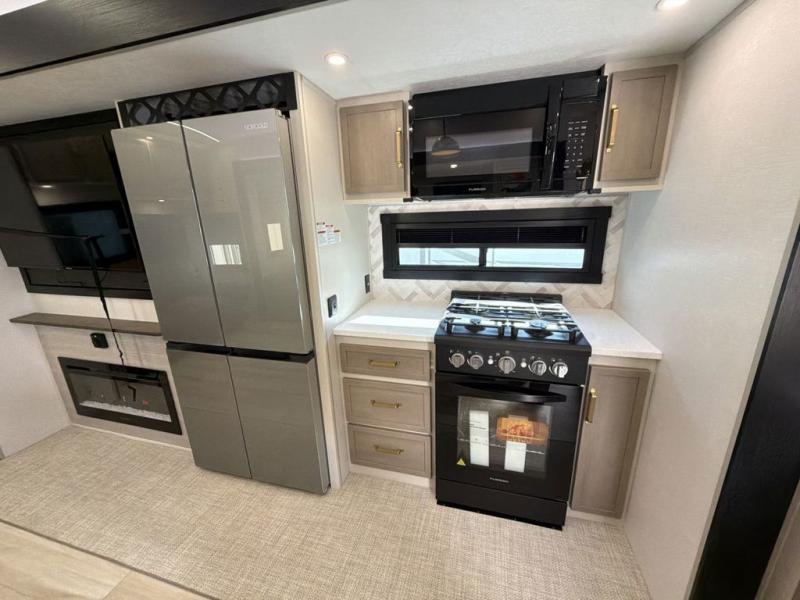 It won't be hard to find comfort in this spacious fifth wheel for four! Once you've unloaded the pass-thru storage, you can head inside to make lunch in the full kitchen. There is a 16-cu. ft. 12V refrigerator here to keep food fresh, and everyone can dine at the kitchen island with four chairs. The theater seating is directly across from the 50" TV and fireplace, and you'll appreciate the hidden storage behind the TV for movies, games, and books! A desk with a chair is also found in the combined kitchen and living area if you need to get some work done, and a rear tri-fold sofa provides sleeping space for guests. Don't overlook the spacious full bath with dual sinks and the front private bedroom with a custom king bed slide. A front wardrobe plus a dresser will let you keep your space tidy, and there is washer/dryer prep if you plan to add those appliances!